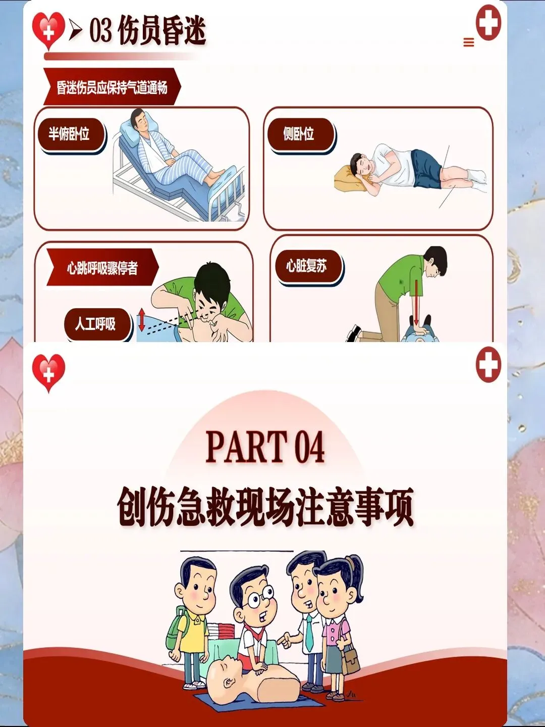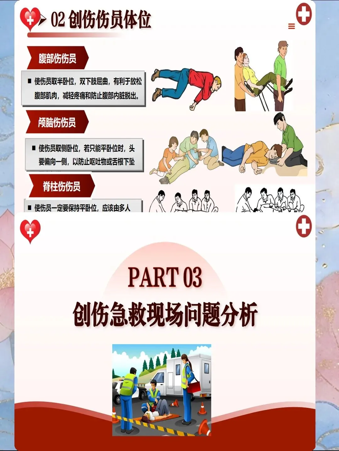 特殊伤员的搬运需采用个体化方案。颅脑损伤患者需头部抬高15°-30°,减少脑水肿;胸部损伤患者取半卧位,利于呼吸;腹部损伤患者取屈膝仰卧位,减轻腹肌张力;骨盆骨折患者使用骨盆带固定,减少出血;休克患者取中凹卧位(头胸抬高10°-20°,下肢抬高20°-30°),增加回心血量。搬运过程中需持续监测生命体征,保持与患者的语言交流,观察意识变化,确保转运安全。