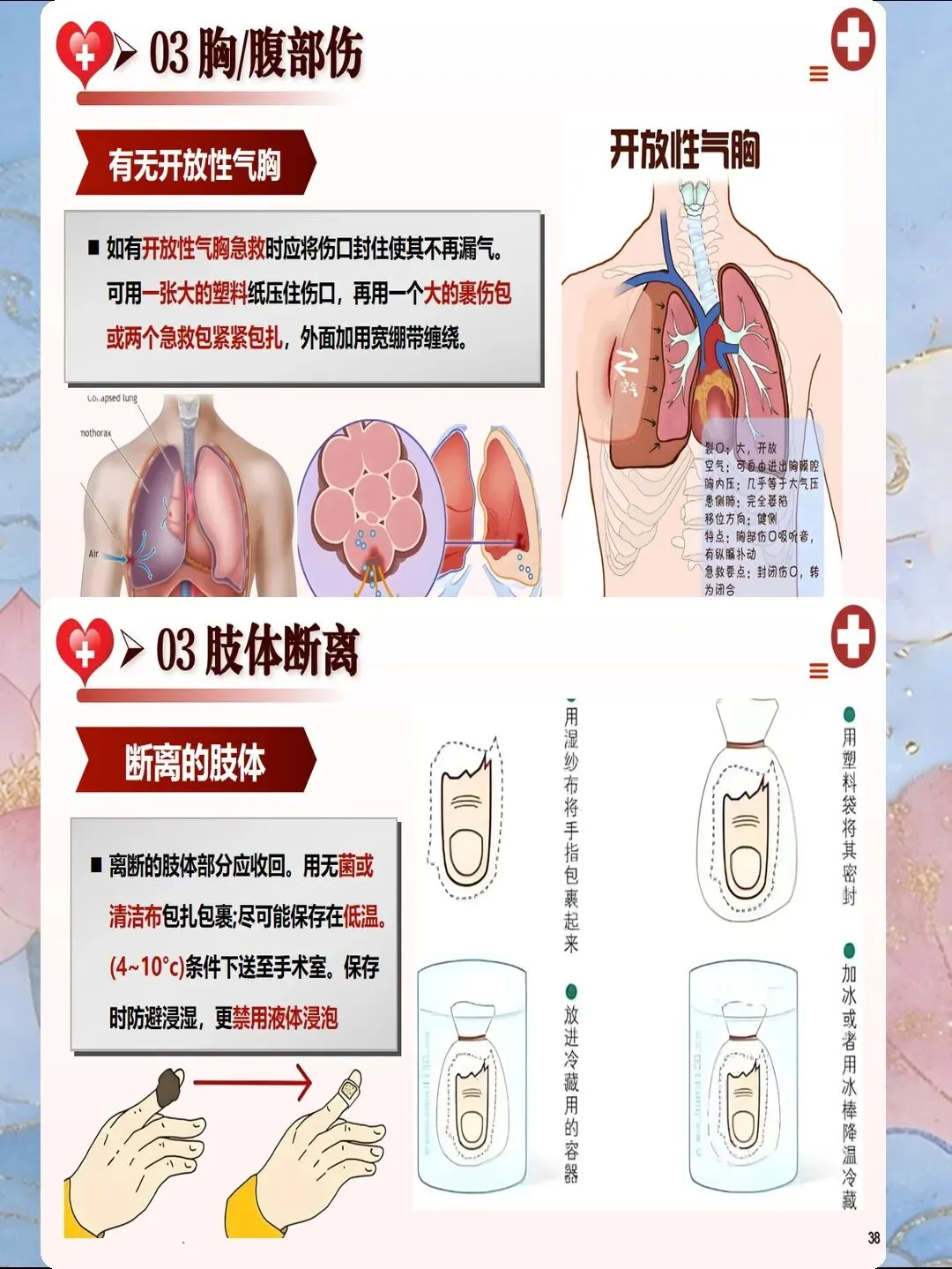特殊部位伤口的包扎需采用特定技术。头部伤口推荐使用帽式包扎法,通过三角巾折叠成条带状环绕头部固定;面部伤口采用三角巾面具式包扎,暴露口鼻眼等重要部位;胸部开放性伤口需立即封闭,使用无菌敷料覆盖后用胶布三边固定,留一边开放形成单向活瓣,避免张力性气胸;腹部脏器脱出严禁强行回纳,应用无菌碗覆盖保护后再包扎;烧伤伤口使用无菌油纱覆盖,避免使用牙膏、酱油等民间偏方。