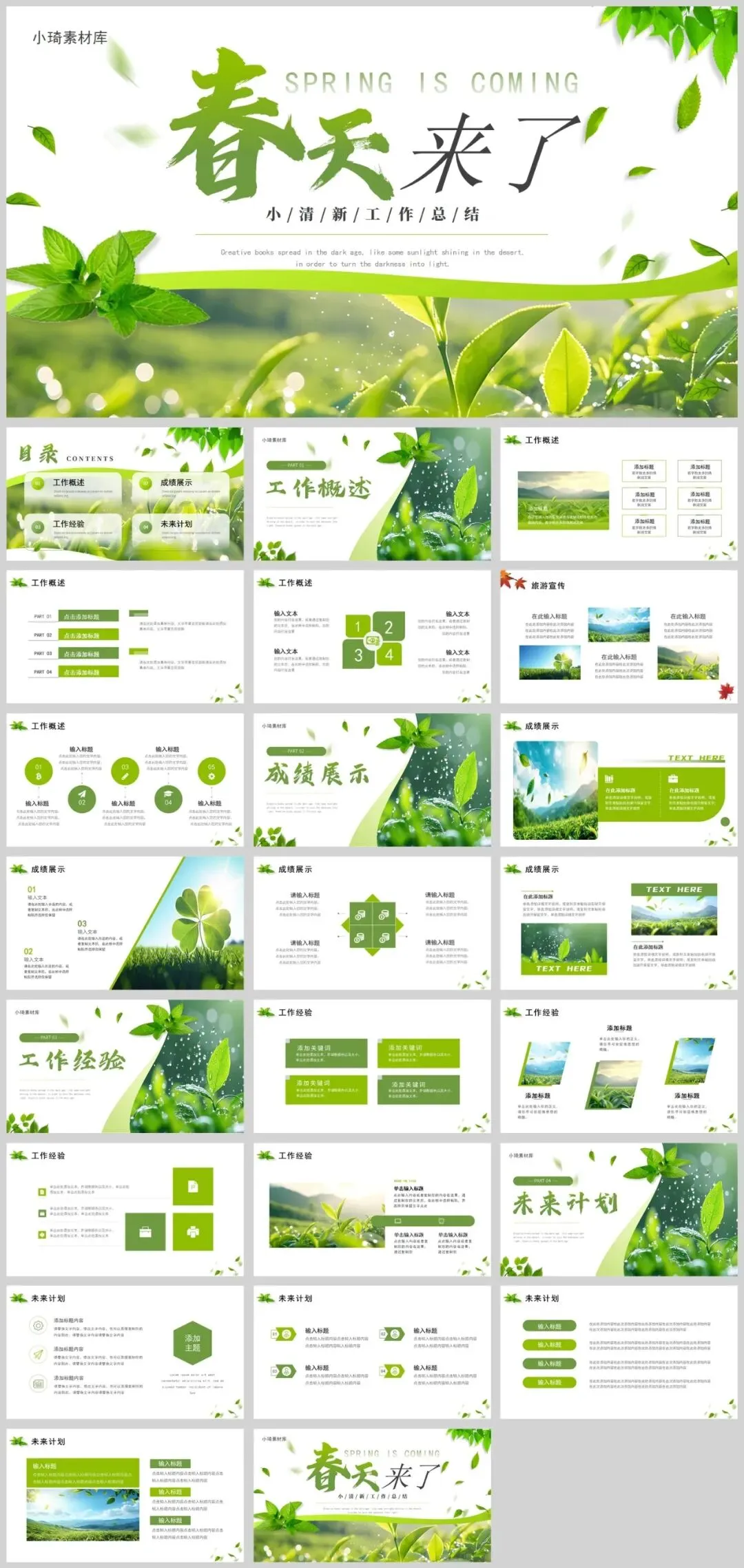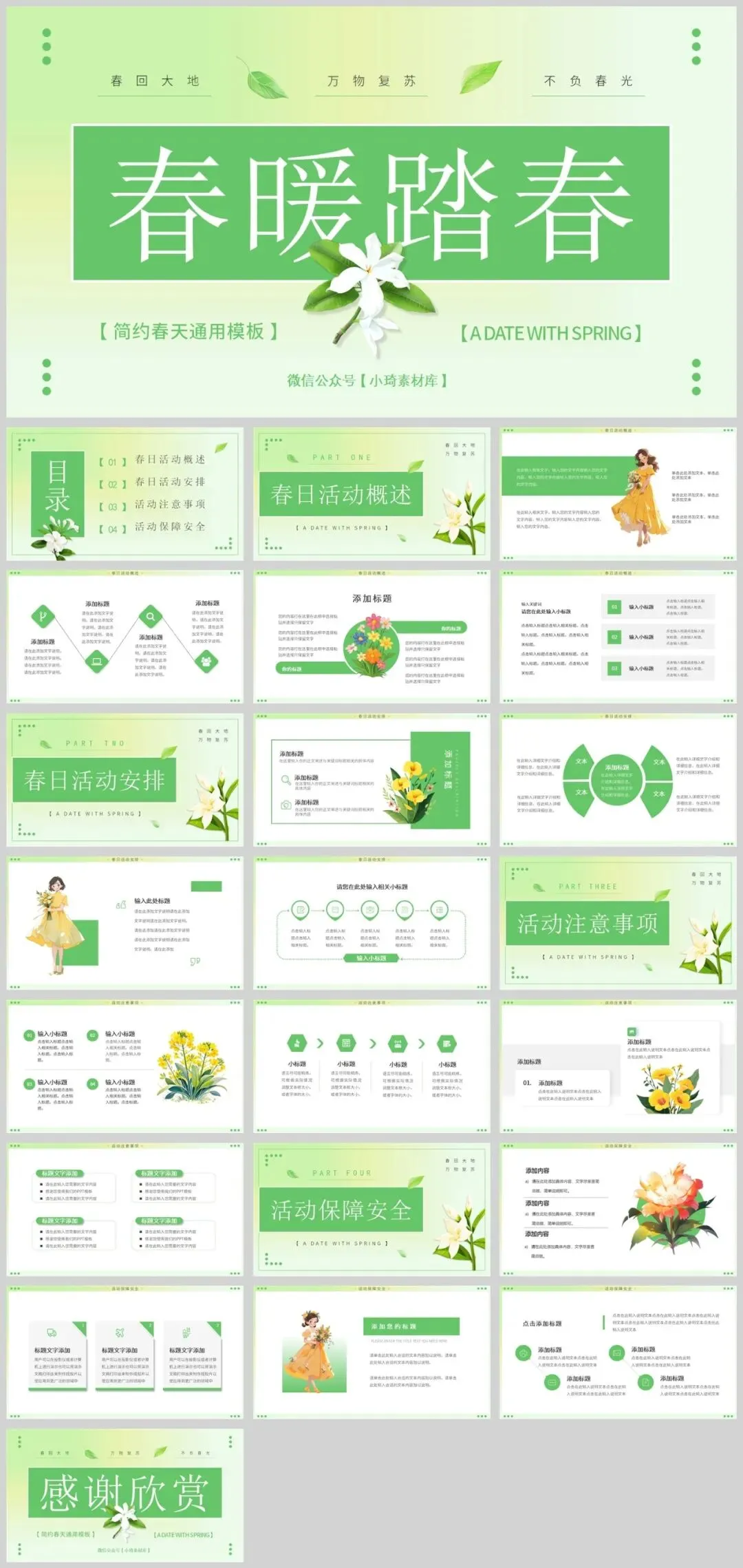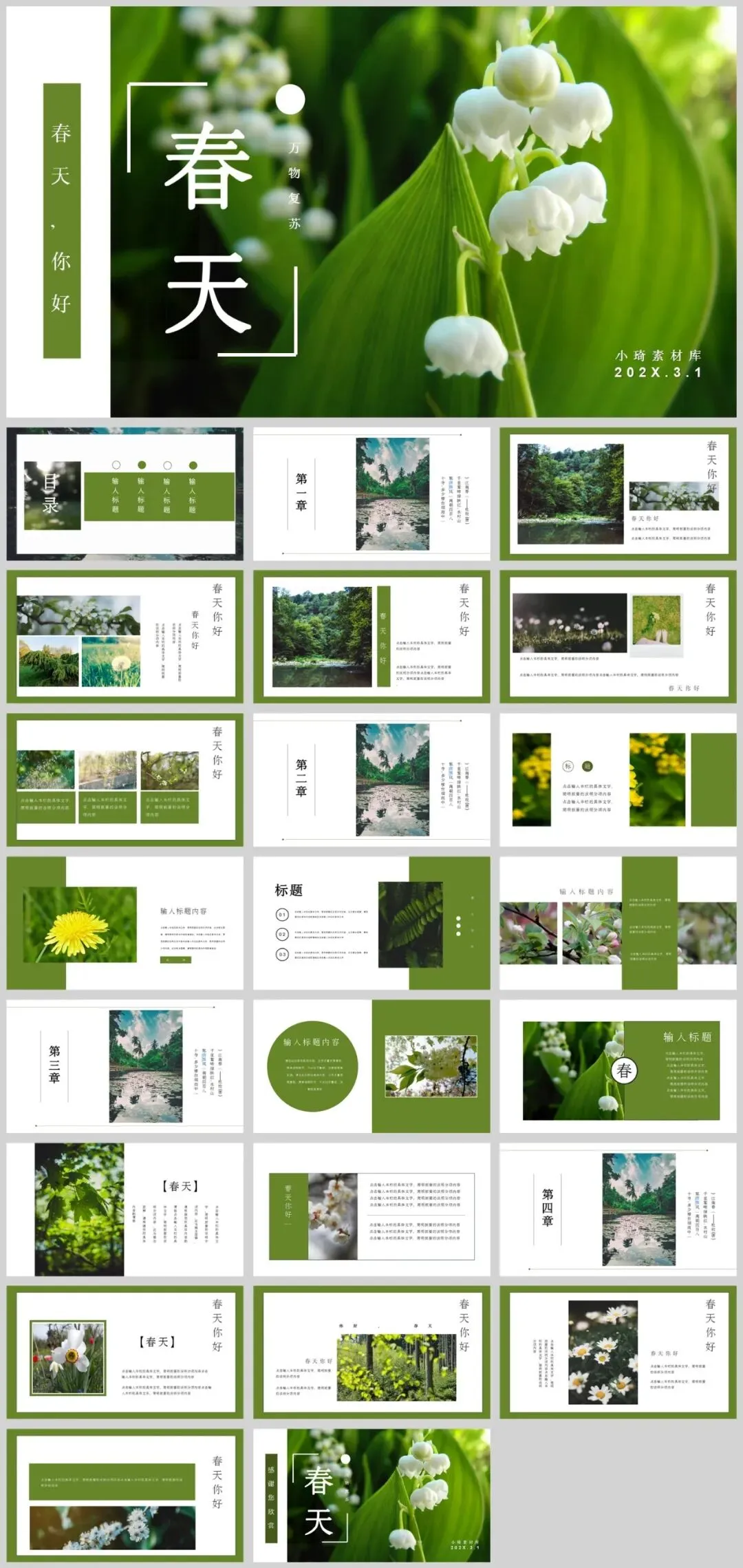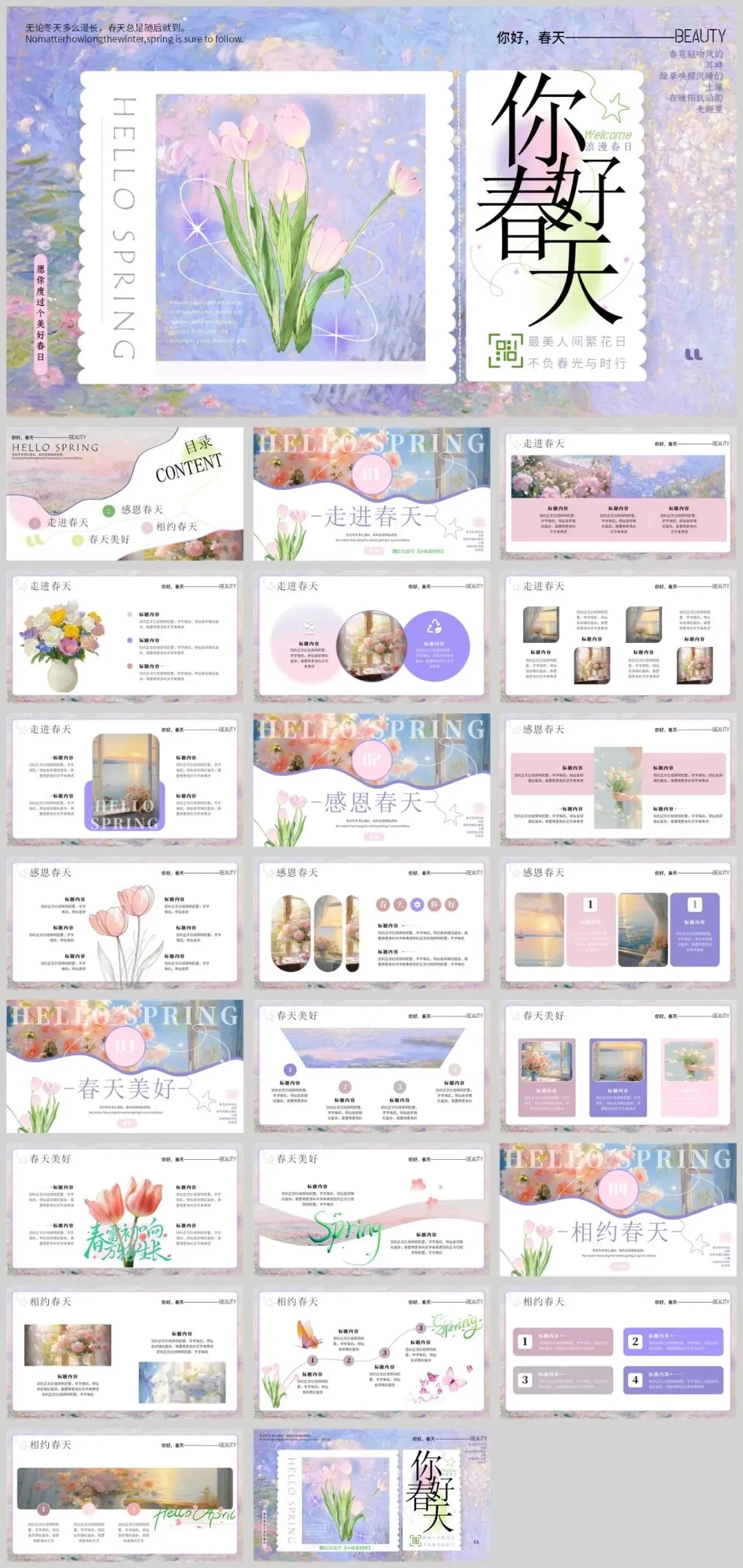 公众号改推送机制啦!点左上角蓝字小琦素材库,设置星标★,好资源不错过!春意盎然,13套唯美春天主题PPT模板助您焕新演示!精选小清新等多种风格,每套模板均采用春天标志性元素——桃花、垂柳、燕子等,搭配淡雅蓝绿配色,完美呈现生机勃勃的春季氛围。适用于工作汇报、教学说课、校园招聘等多种场景,让您在春季演示中脱颖而出。是不是很棒的资源呢