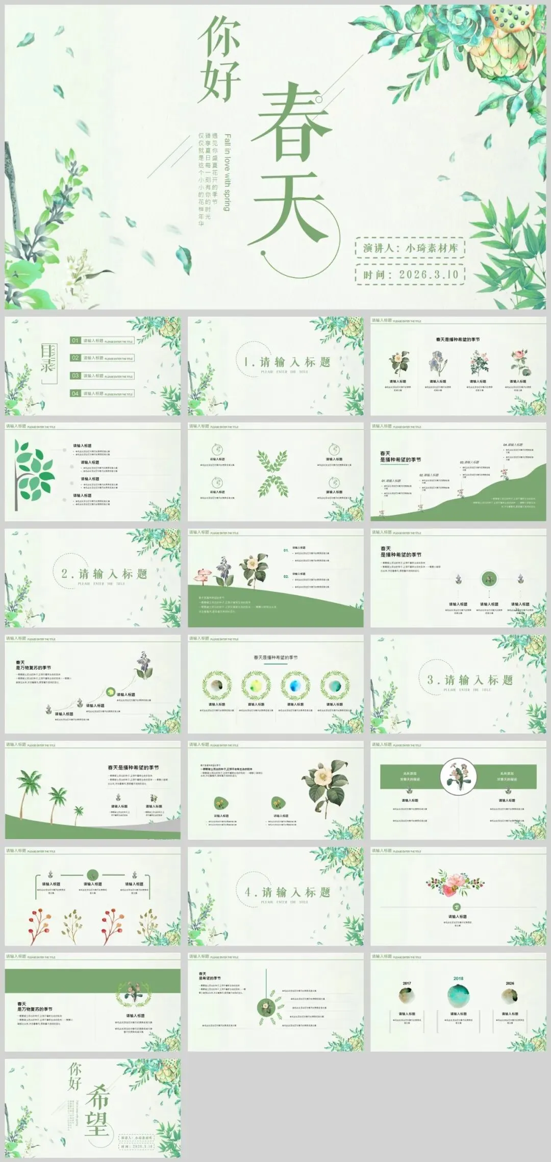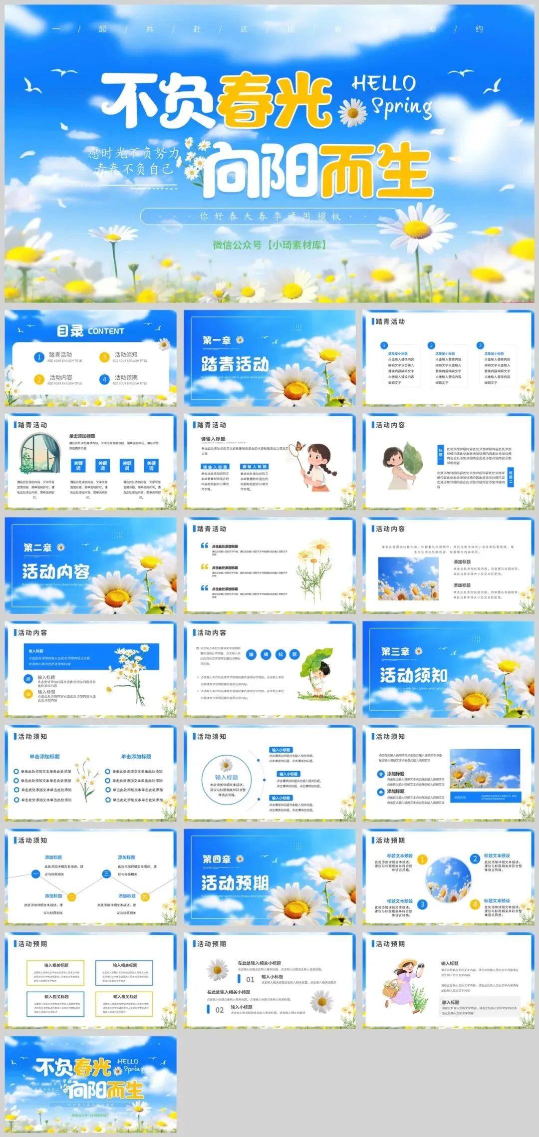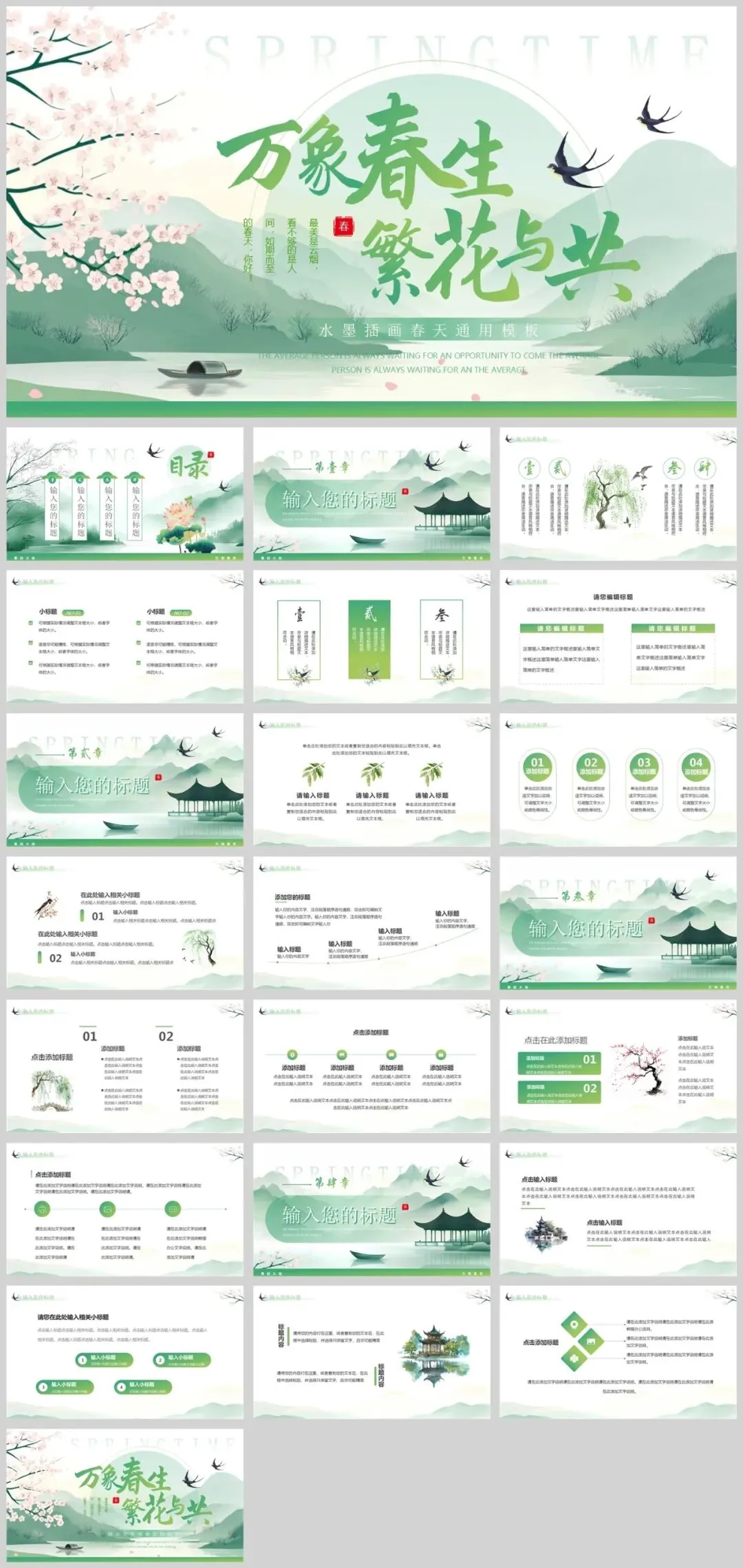 公众号改推送机制啦!点左上角蓝字小琦素材库,设置星标★,好资源不错过!春意盎然,13套唯美春天主题PPT模板助您焕新演示!精选小清新等多种风格,每套模板均采用春天标志性元素——桃花、垂柳、燕子等,搭配淡雅蓝绿配色,完美呈现生机勃勃的春季氛围。适用于工作汇报、教学说课、校园招聘等多种场景,让您在春季演示中脱颖而出。是不是很棒的资源呢