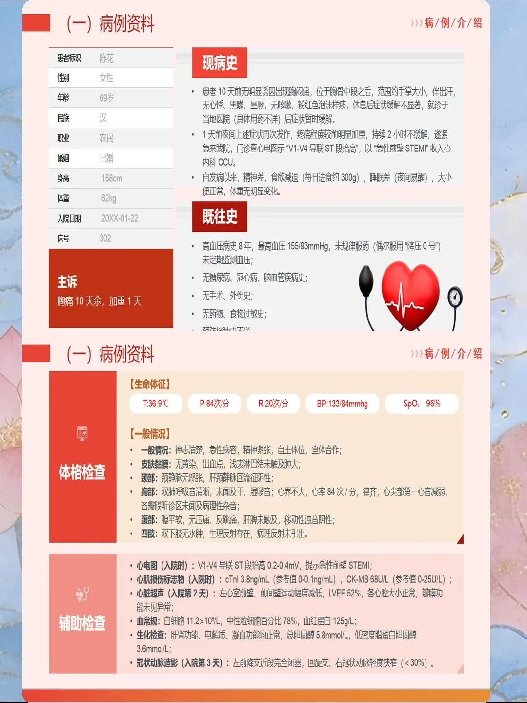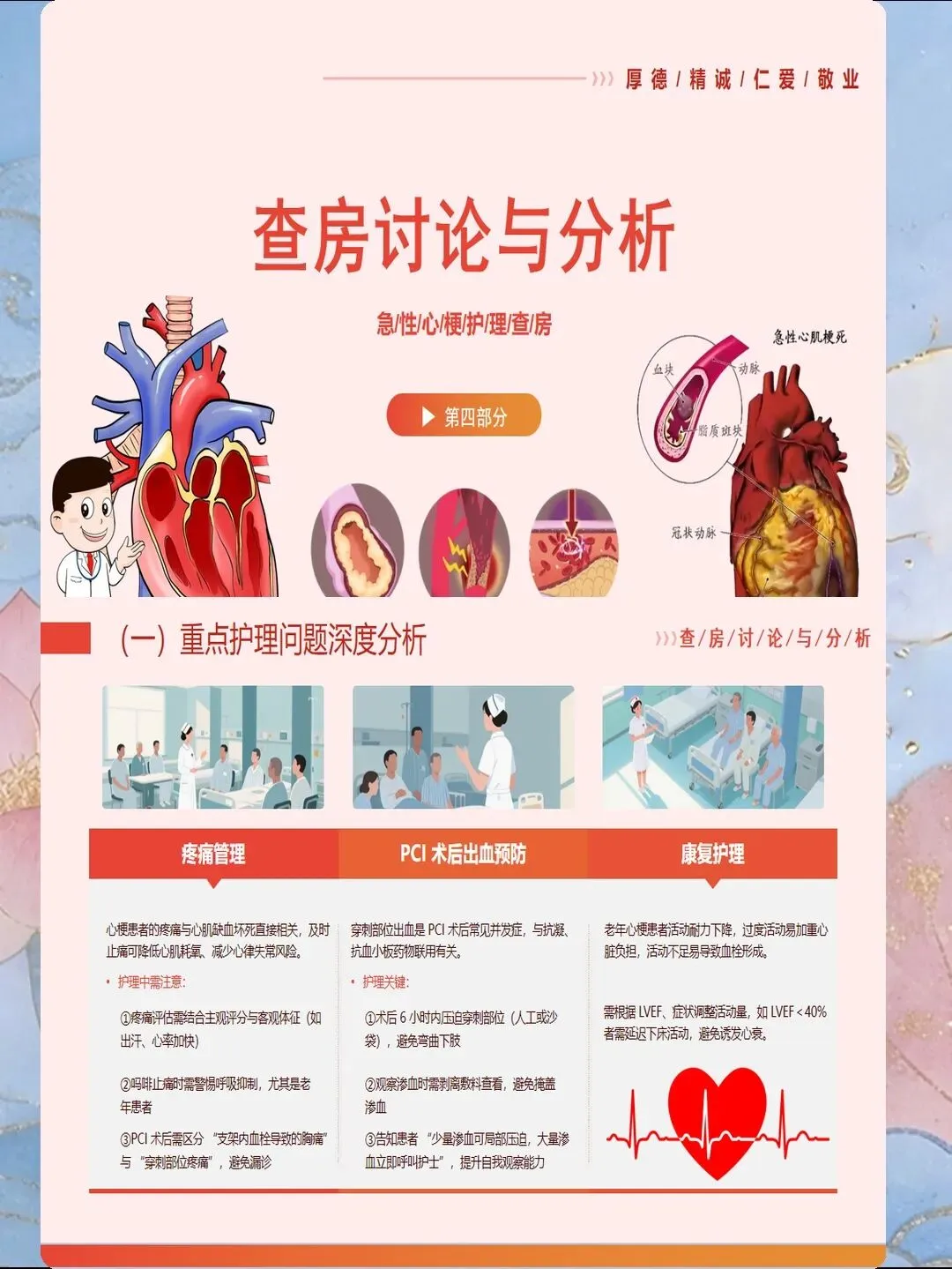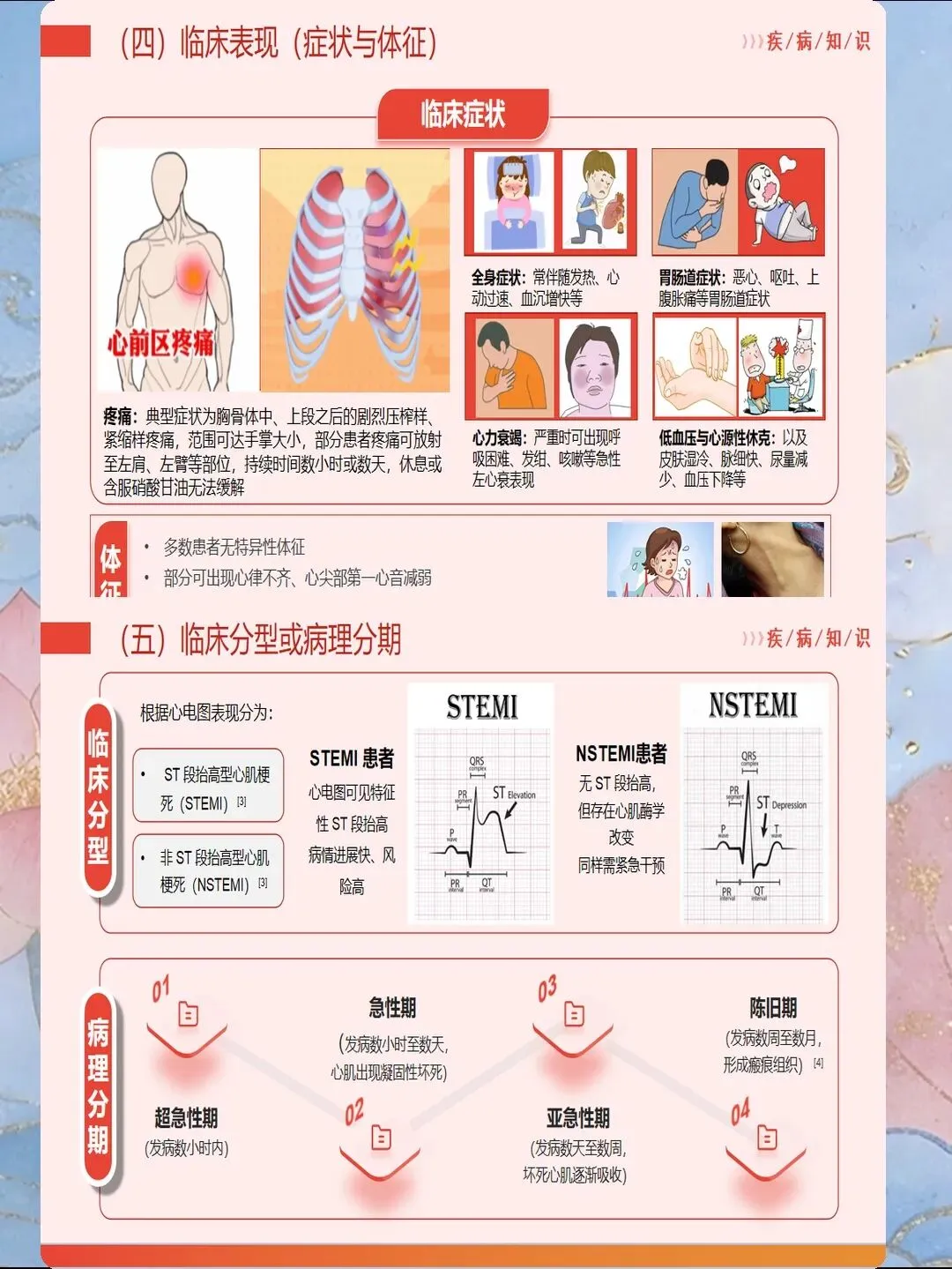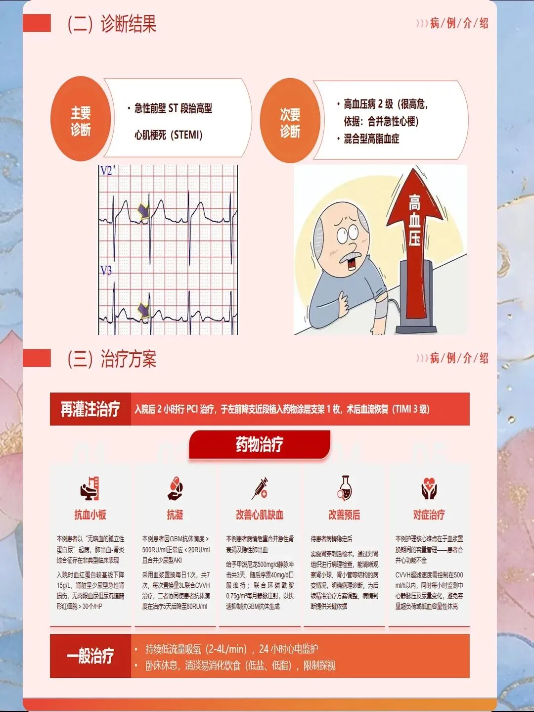 心肌梗死是指冠状动脉急性闭塞导致心肌供血急剧减少或中断,引起心肌缺血性坏死,是冠心病最严重的临床类型。我国心肌梗死发病呈年轻化趋势,每年新发病例约60万例,其中45岁以下患者占比逐年上升。心肌梗死具有发病急、进展快、并发症多、死亡率高的特点,是导致心血管疾病死亡的首要原因。作为心内科和急诊科护士,我们需要掌握心肌梗死的规范救治流程,实施精细化护理管理,缩短总缺血时间,降低死亡率,改善患者预后。心肌梗死的早期识别是救治成功的基石。典型表现为胸骨后或心前区压榨性疼痛,呈濒死感,持续时间超过30分钟,休息或含服硝酸甘油不能缓解。疼痛可向左肩、左臂内侧放射,也可放射至下颌、颈部、背部。然而,不典型表现容易被忽视,特别是女性、老年人和糖尿病患者,可能仅表现为上腹部疼痛、恶心、呕吐、呼吸困难、极度乏力、晕厥等。护士要建立高度警觉意识,掌握"胸痛三问"快速评估技巧:询问疼痛的部位和性质、持续时间、诱发和缓解因素。对于任何疑似心肌梗死的患者,立即启动胸痛中心绿色通道,不必等待心肌损伤标志物结果,优先完成心电图检查,ST段抬高型心肌梗死表现为ST段弓背向上抬高、病理性Q波形成、T波倒置。