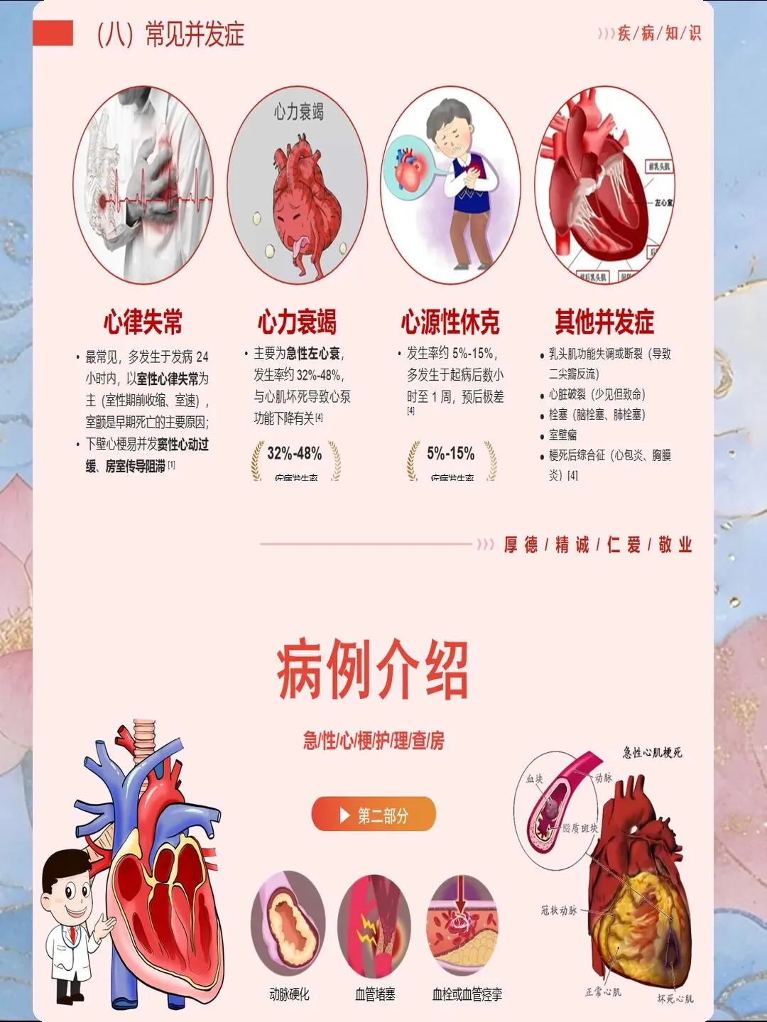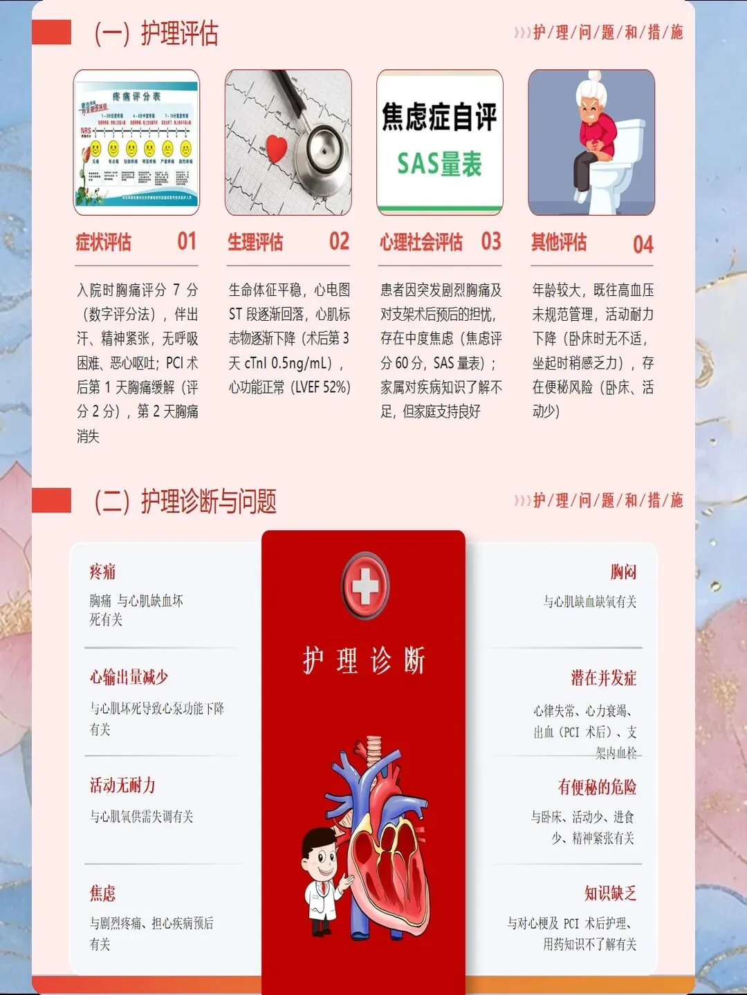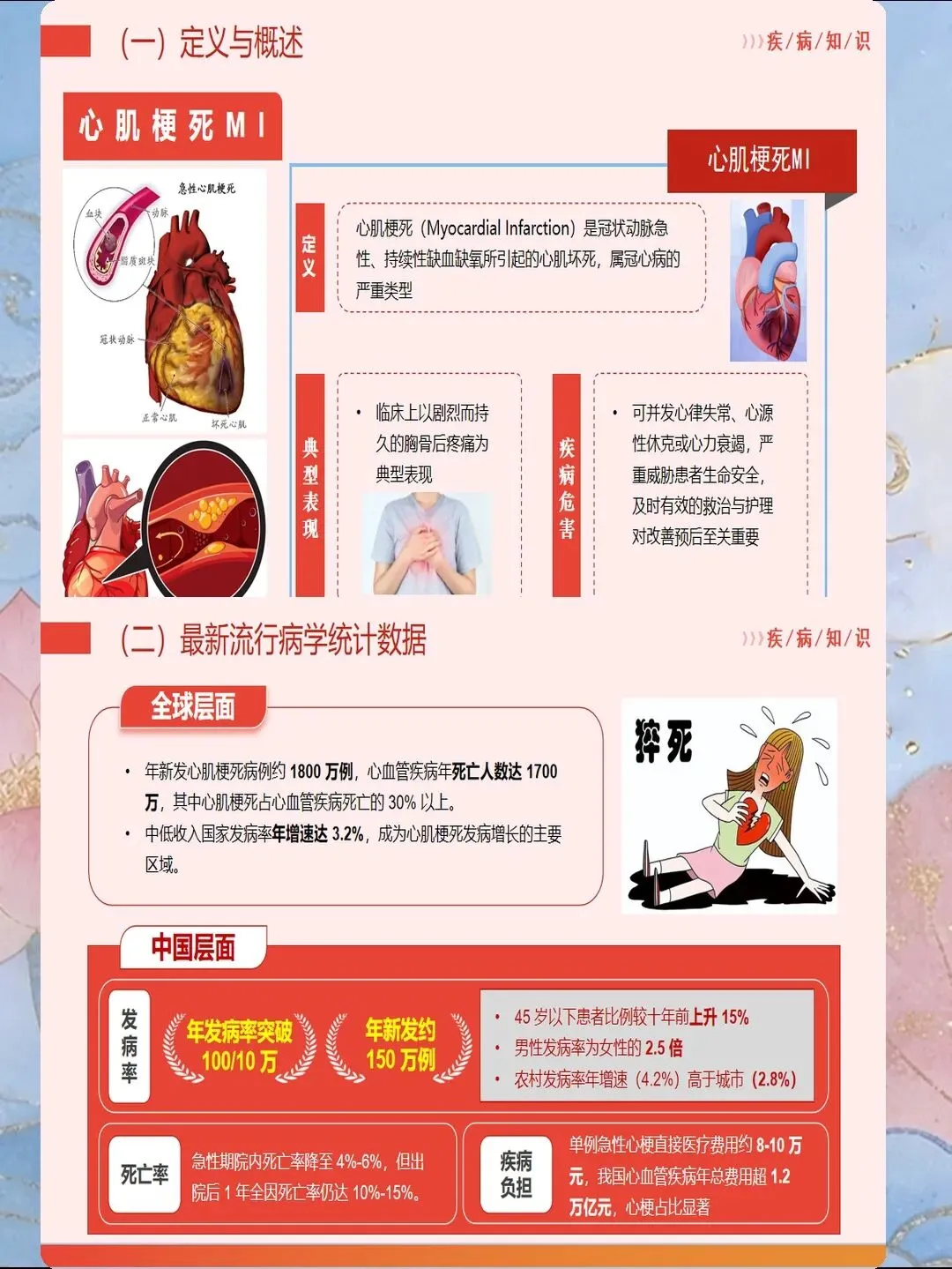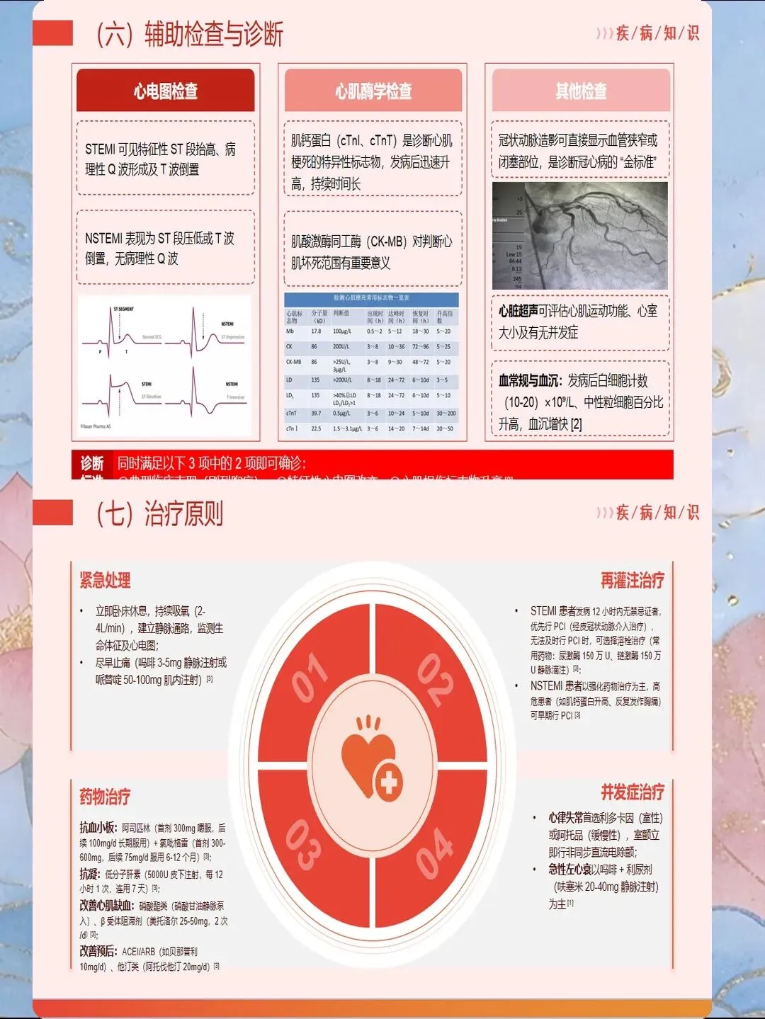 心肌梗死是指冠状动脉急性闭塞导致心肌供血急剧减少或中断,引起心肌缺血性坏死,是冠心病最严重的临床类型。我国心肌梗死发病呈年轻化趋势,每年新发病例约60万例,其中45岁以下患者占比逐年上升。心肌梗死具有发病急、进展快、并发症多、死亡率高的特点,是导致心血管疾病死亡的首要原因。作为心内科和急诊科护士,我们需要掌握心肌梗死的规范救治流程,实施精细化护理管理,缩短总缺血时间,降低死亡率,改善患者预后。心肌梗死的早期识别是救治成功的基石。典型表现为胸骨后或心前区压榨性疼痛,呈濒死感,持续时间超过30分钟,休息或含服硝酸甘油不能缓解。疼痛可向左肩、左臂内侧放射,也可放射至下颌、颈部、背部。然而,不典型表现容易被忽视,特别是女性、老年人和糖尿病患者,可能仅表现为上腹部疼痛、恶心、呕吐、呼吸困难、极度乏力、晕厥等。护士要建立高度警觉意识,掌握"胸痛三问"快速评估技巧:询问疼痛的部位和性质、持续时间、诱发和缓解因素。对于任何疑似心肌梗死的患者,立即启动胸痛中心绿色通道,不必等待心肌损伤标志物结果,优先完成心电图检查,ST段抬高型心肌梗死表现为ST段弓背向上抬高、病理性Q波形成、T波倒置。