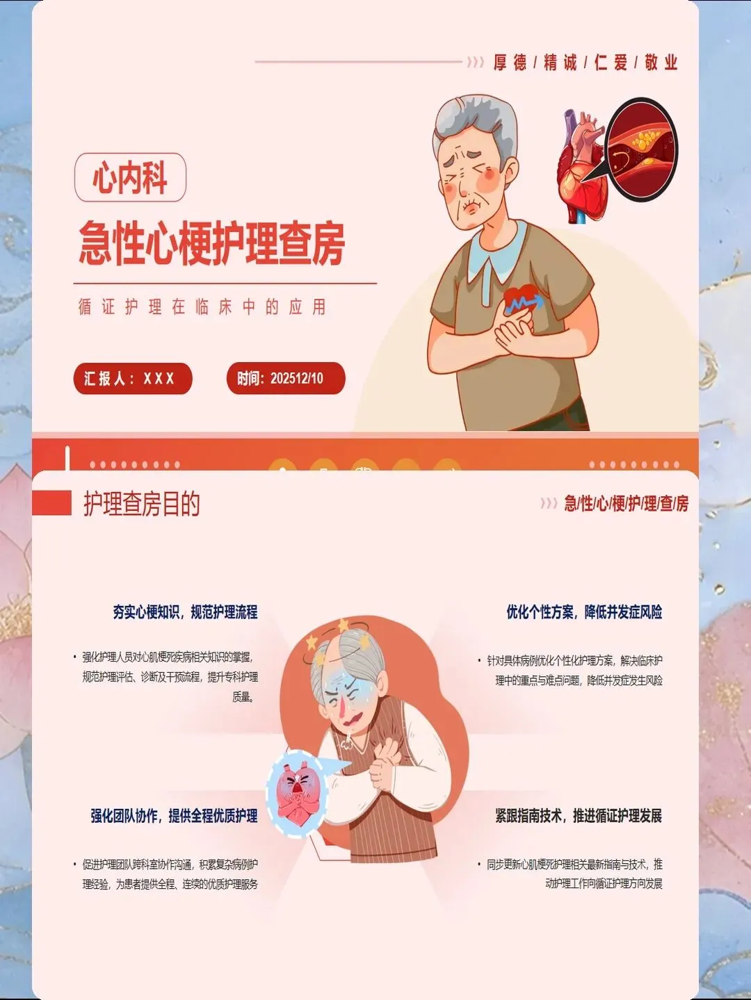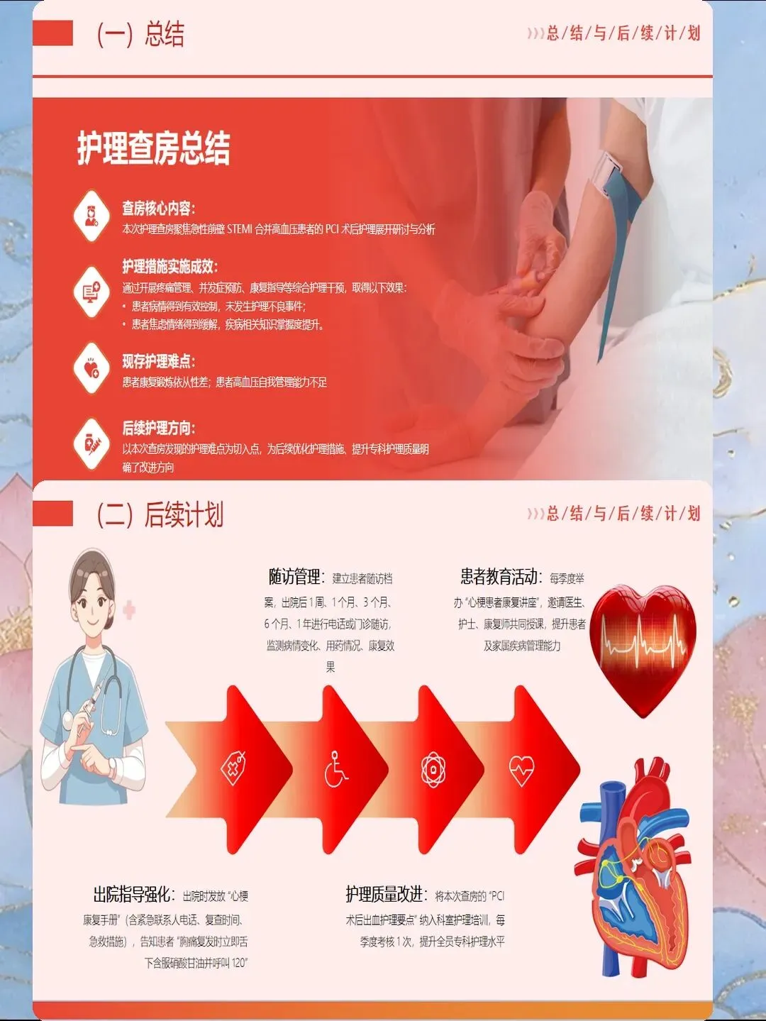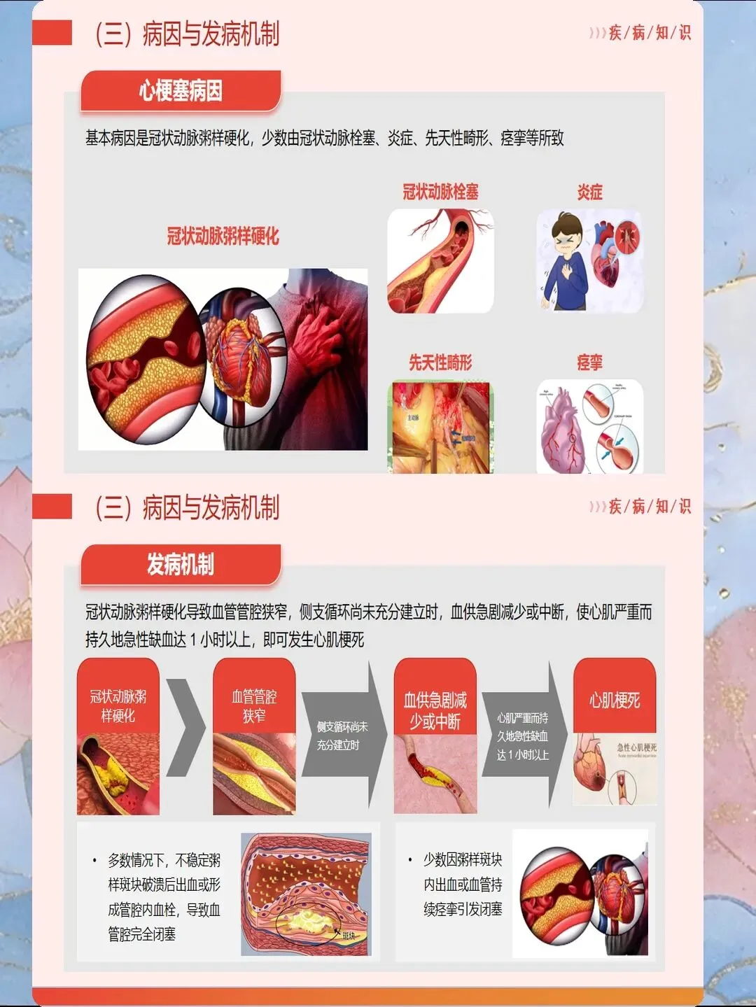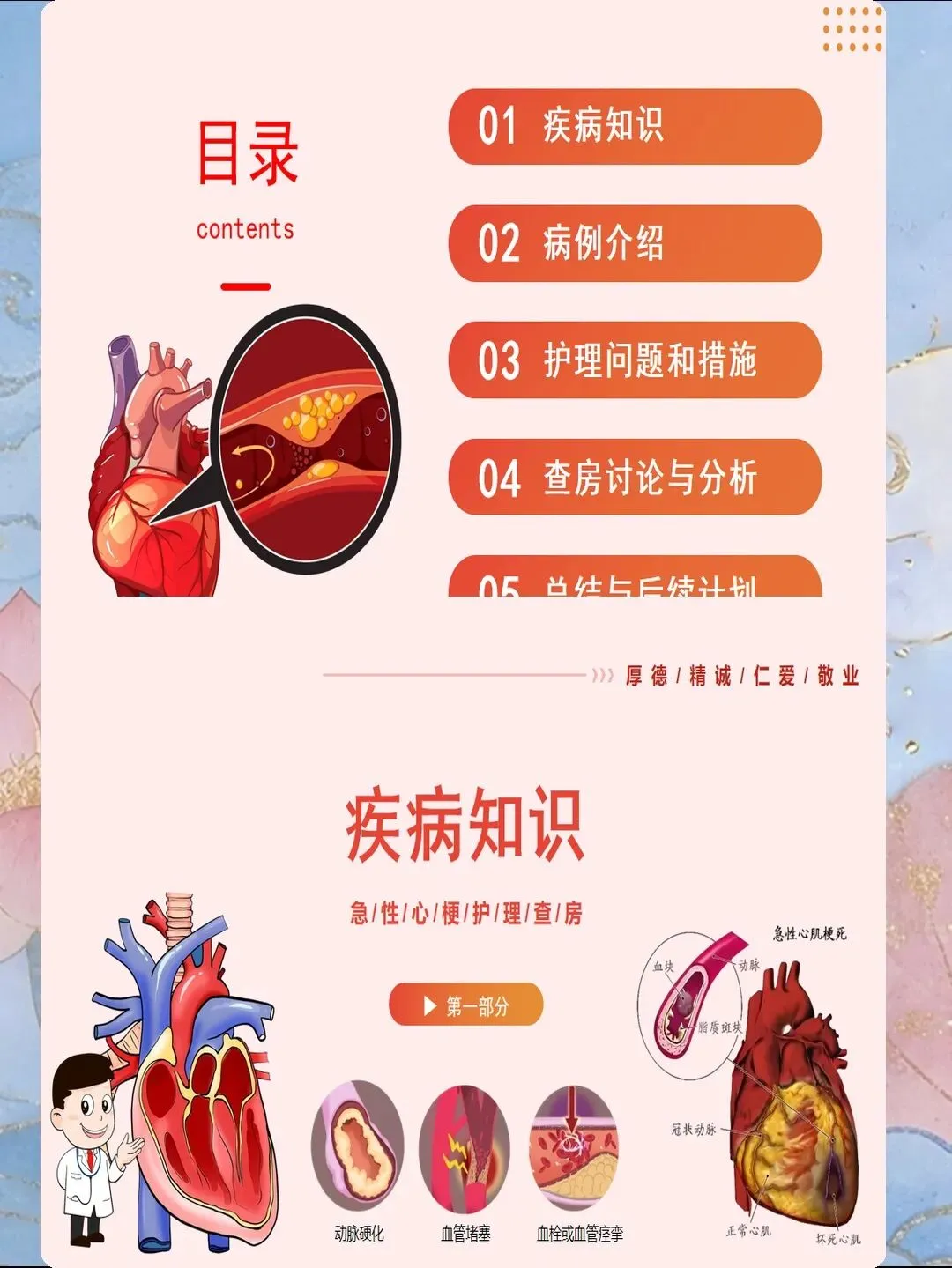心肌梗死是指冠状动脉急性闭塞导致心肌供血急剧减少或中断,引起心肌缺血性坏死,是冠心病最严重的临床类型。我国心肌梗死发病呈年轻化趋势,每年新发病例约60万例,其中45岁以下患者占比逐年上升。心肌梗死具有发病急、进展快、并发症多、死亡率高的特点,是导致心血管疾病死亡的首要原因。作为心内科和急诊科护士,我们需要掌握心肌梗死的规范救治流程,实施精细化护理管理,缩短总缺血时间,降低死亡率,改善患者预后。心肌梗死的早期识别是救治成功的基石。典型表现为胸骨后或心前区压榨性疼痛,呈濒死感,持续时间超过30分钟,休息或含服硝酸甘油不能缓解。疼痛可向左肩、左臂内侧放射,也可放射至下颌、颈部、背部。然而,不典型表现容易被忽视,特别是女性、老年人和糖尿病患者,可能仅表现为上腹部疼痛、恶心、呕吐、呼吸困难、极度乏力、晕厥等。护士要建立高度警觉意识,掌握"胸痛三问"快速评估技巧:询问疼痛的部位和性质、持续时间、诱发和缓解因素。对于任何疑似心肌梗死的患者,立即启动胸痛中心绿色通道,不必等待心肌损伤标志物结果,优先完成心电图检查,ST段抬高型心肌梗死表现为ST段弓背向上抬高、病理性Q波形成、T波倒置。