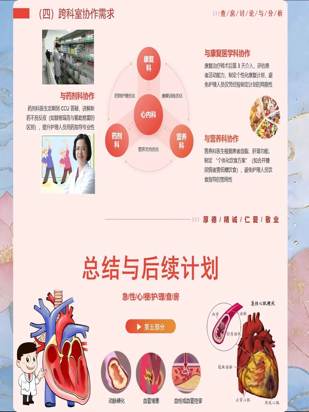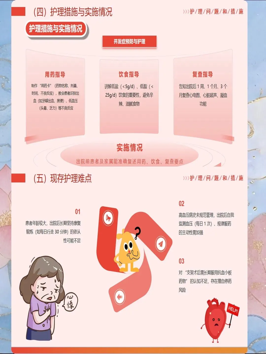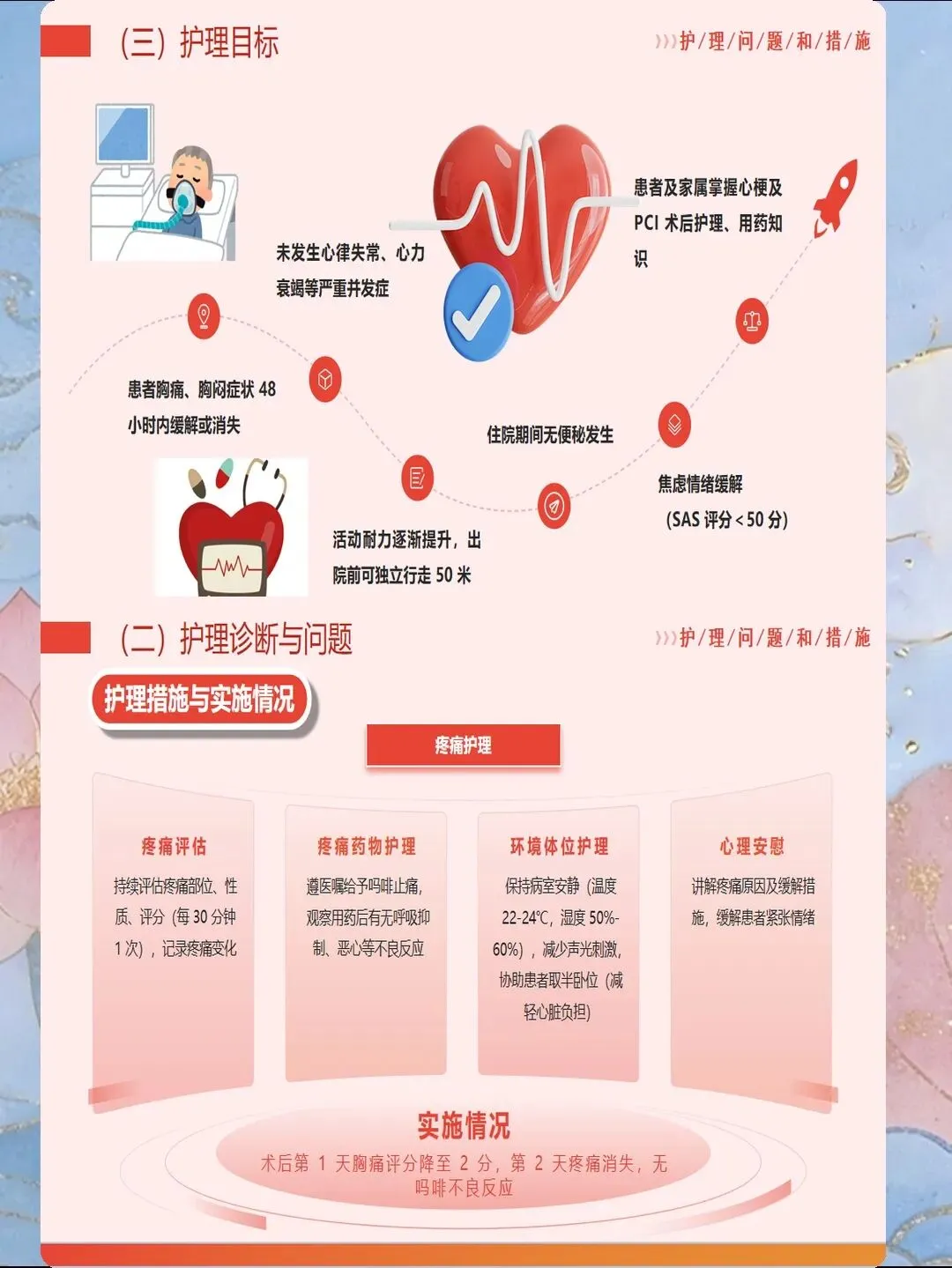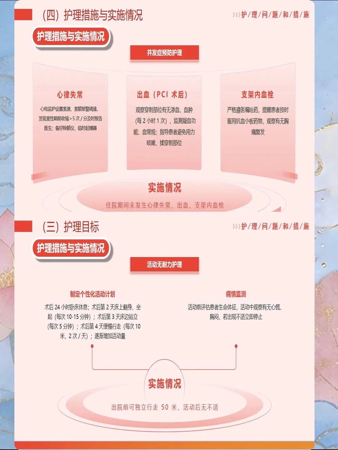 心肌梗死是指冠状动脉急性闭塞导致心肌供血急剧减少或中断,引起心肌缺血性坏死,是冠心病最严重的临床类型。我国心肌梗死发病呈年轻化趋势,每年新发病例约60万例,其中45岁以下患者占比逐年上升。心肌梗死具有发病急、进展快、并发症多、死亡率高的特点,是导致心血管疾病死亡的首要原因。作为心内科和急诊科护士,我们需要掌握心肌梗死的规范救治流程,实施精细化护理管理,缩短总缺血时间,降低死亡率,改善患者预后。心肌梗死的早期识别是救治成功的基石。典型表现为胸骨后或心前区压榨性疼痛,呈濒死感,持续时间超过30分钟,休息或含服硝酸甘油不能缓解。疼痛可向左肩、左臂内侧放射,也可放射至下颌、颈部、背部。然而,不典型表现容易被忽视,特别是女性、老年人和糖尿病患者,可能仅表现为上腹部疼痛、恶心、呕吐、呼吸困难、极度乏力、晕厥等。护士要建立高度警觉意识,掌握"胸痛三问"快速评估技巧:询问疼痛的部位和性质、持续时间、诱发和缓解因素。对于任何疑似心肌梗死的患者,立即启动胸痛中心绿色通道,不必等待心肌损伤标志物结果,优先完成心电图检查,ST段抬高型心肌梗死表现为ST段弓背向上抬高、病理性Q波形成、T波倒置。