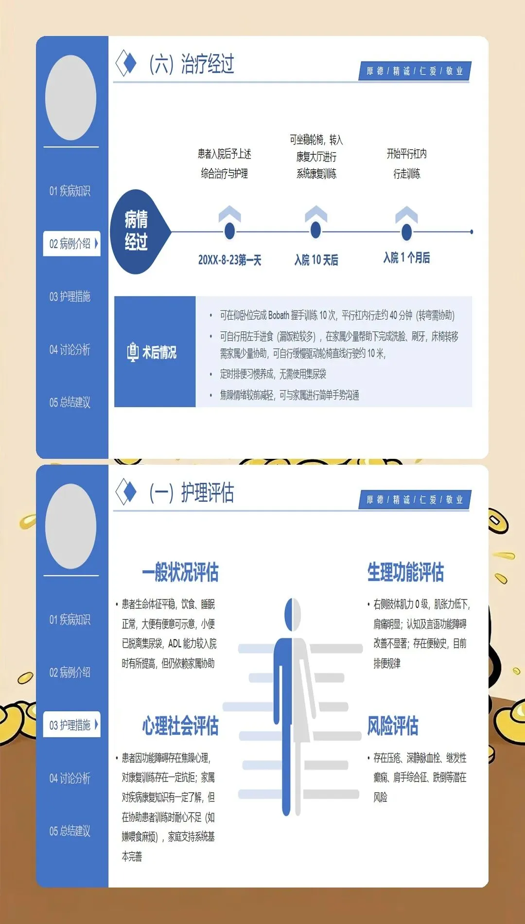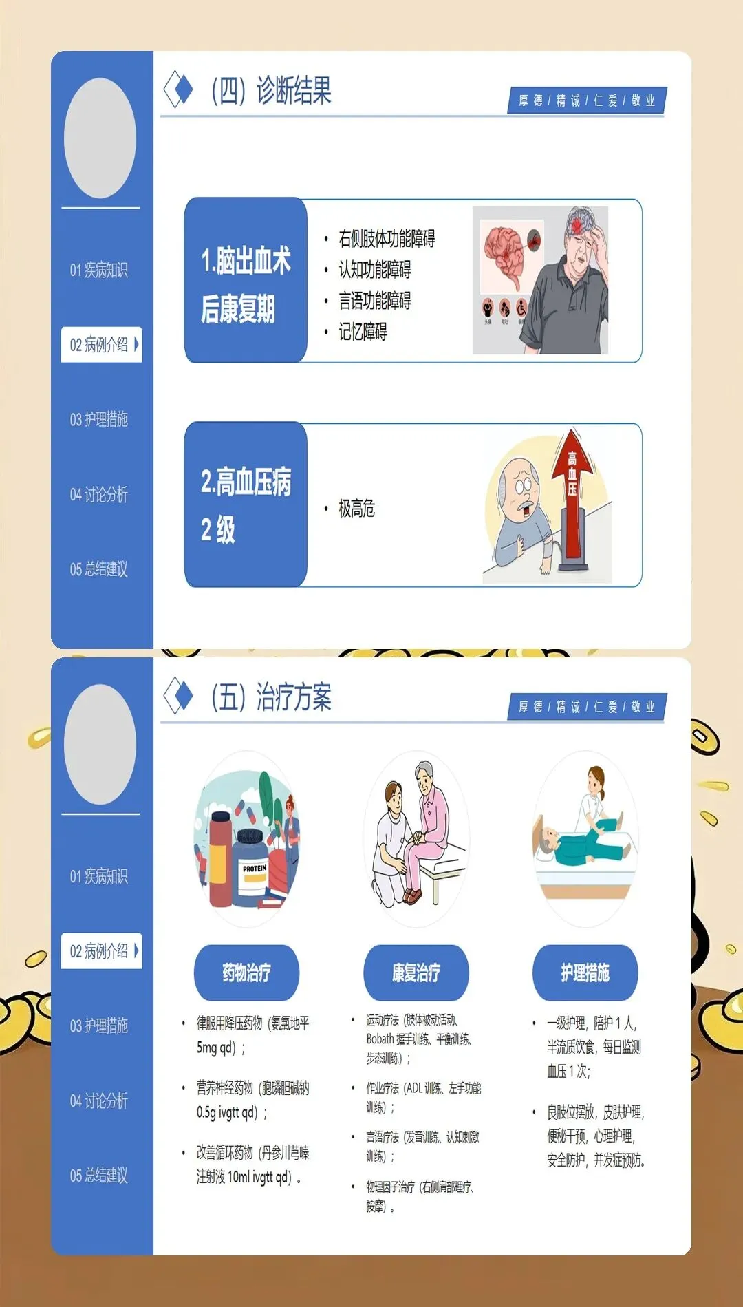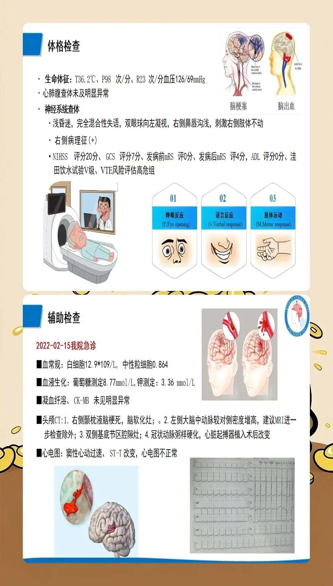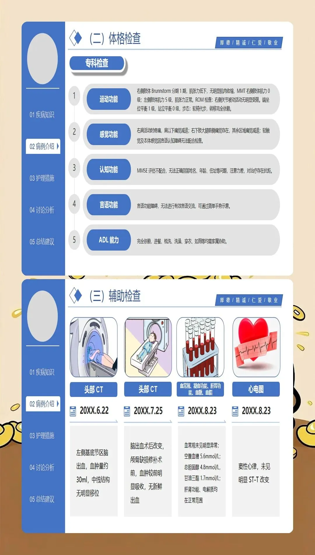 脑梗死护理查房的核心是全面、系统、深入的护理评估。最新的护理实践强调基于循证医学的评估体系:在神经功能评估方面,采用NIHSS评分系统评估神经功能缺损程度,动态观察患者的意识状态、瞳孔变化、肢体肌力、感觉功能、语言功能等关键指标;在血流动力学监测方面,密切监测血压、心率、血氧饱和度等生命体征,血压管理是脑梗死护理的关键环节,收缩压控制在140-180mmHg之间可降低再出血风险;在吞咽功能评估方面,采用洼田饮水试验筛查吞咽障碍,早期识别误吸风险,指导饮食方式和饮食种类的选择;在并发症风险评估方面,评估压疮、深静脉血栓、肺部感染、跌倒等常见并发症的风险因素;在心理社会评估方面,关注患者的情绪状态、认知功能、家庭支持系统等社会心理因素。特别创新的是,最新的护理查房引入了"多维评估矩阵",将生理指标、功能状态、生活质量、社会支持等多维度评估结果整合呈现,为制定个体化护理计划提供全面依据。