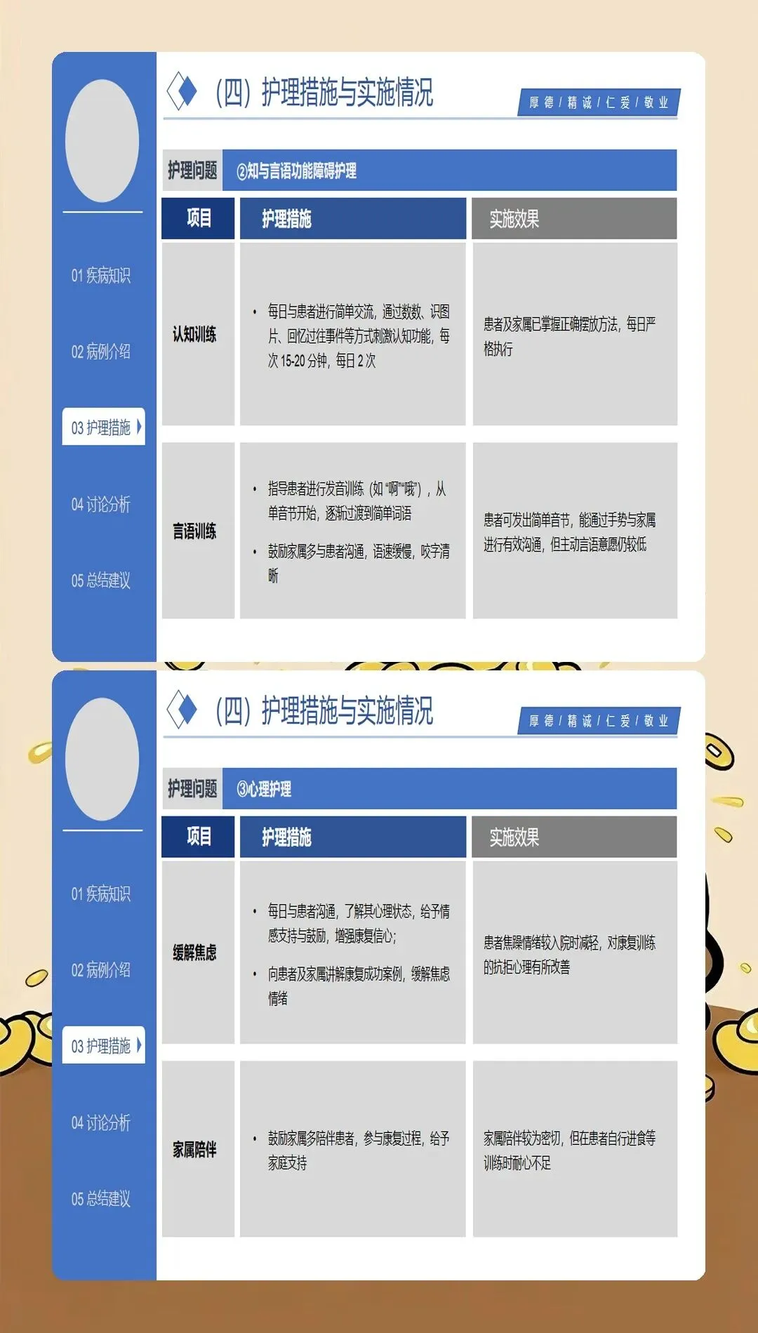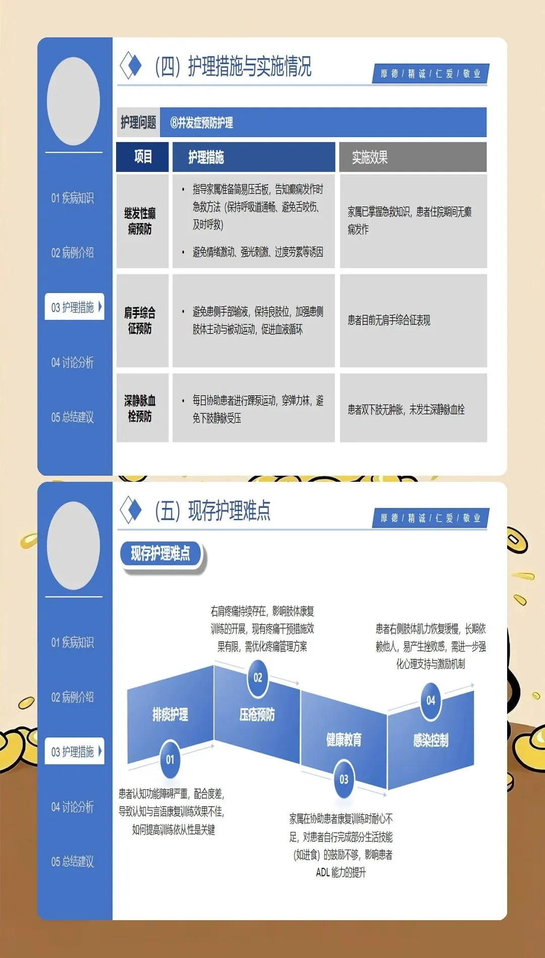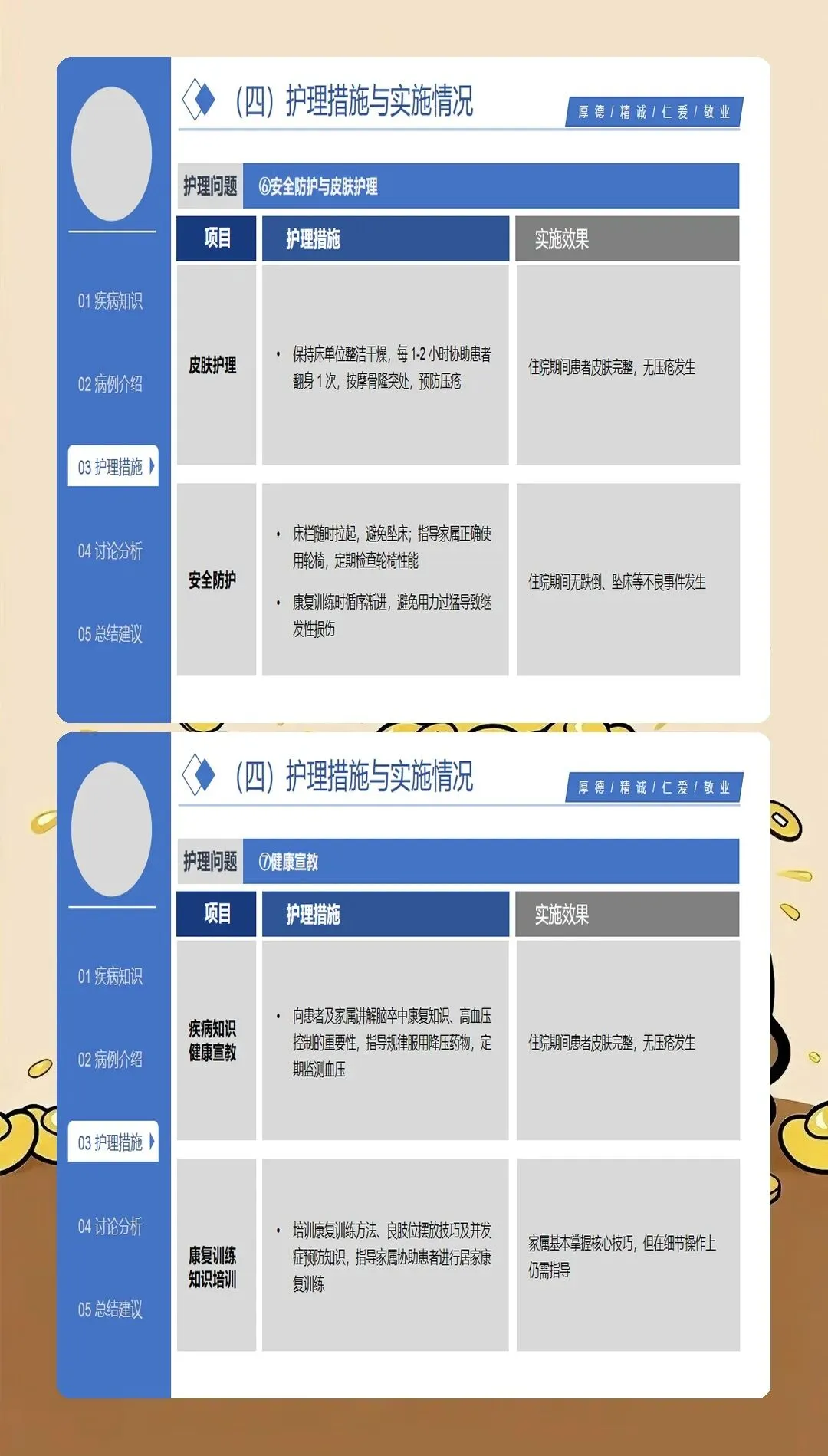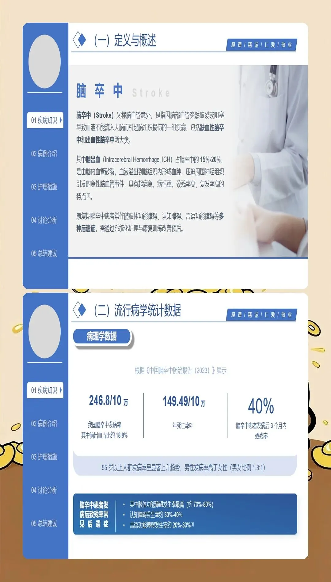 脑梗死护理查房的核心是全面、系统、深入的护理评估。最新的护理实践强调基于循证医学的评估体系:在神经功能评估方面,采用NIHSS评分系统评估神经功能缺损程度,动态观察患者的意识状态、瞳孔变化、肢体肌力、感觉功能、语言功能等关键指标;在血流动力学监测方面,密切监测血压、心率、血氧饱和度等生命体征,血压管理是脑梗死护理的关键环节,收缩压控制在140-180mmHg之间可降低再出血风险;在吞咽功能评估方面,采用洼田饮水试验筛查吞咽障碍,早期识别误吸风险,指导饮食方式和饮食种类的选择;在并发症风险评估方面,评估压疮、深静脉血栓、肺部感染、跌倒等常见并发症的风险因素;在心理社会评估方面,关注患者的情绪状态、认知功能、家庭支持系统等社会心理因素。特别创新的是,最新的护理查房引入了"多维评估矩阵",将生理指标、功能状态、生活质量、社会支持等多维度评估结果整合呈现,为制定个体化护理计划提供全面依据。