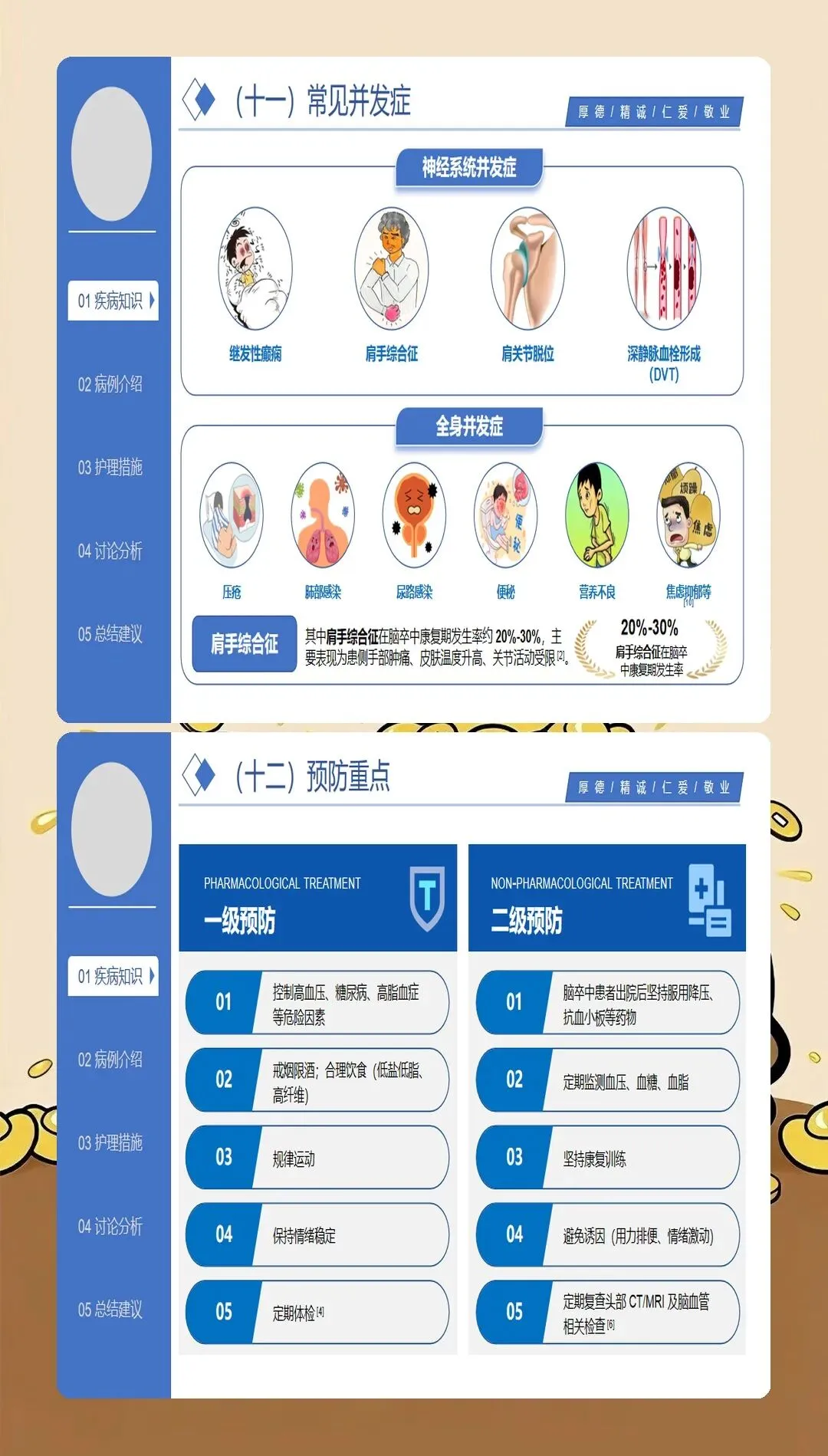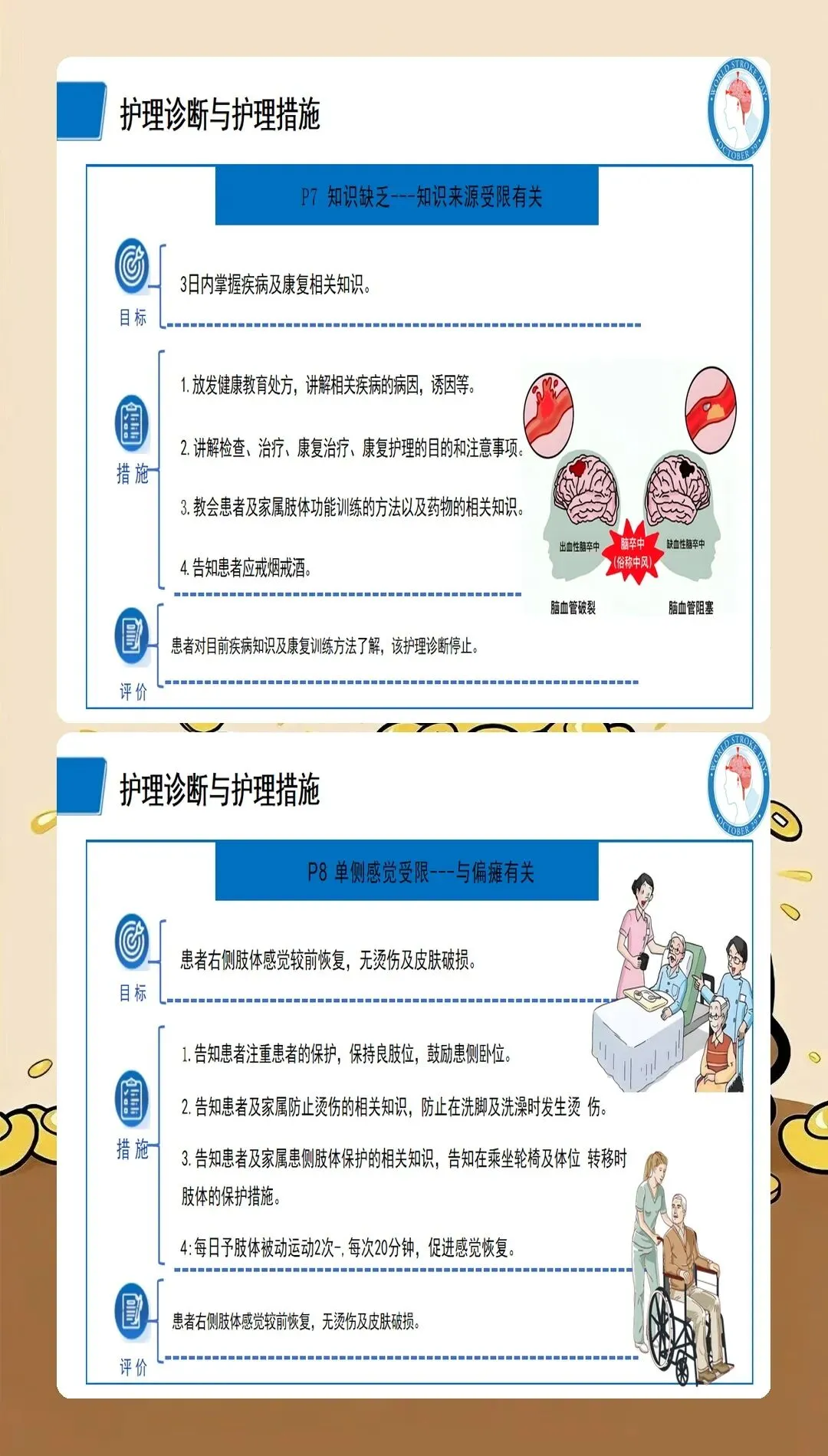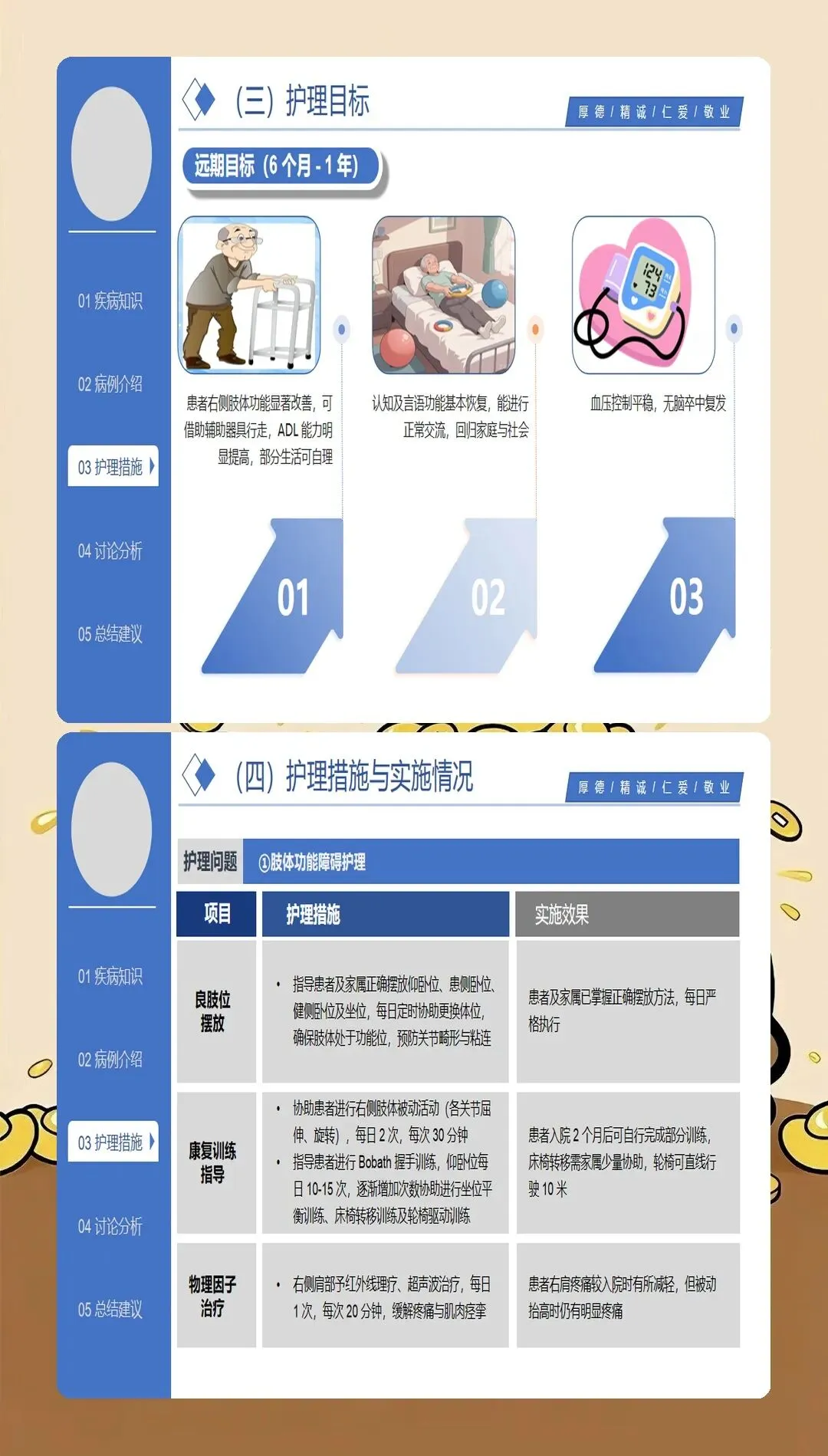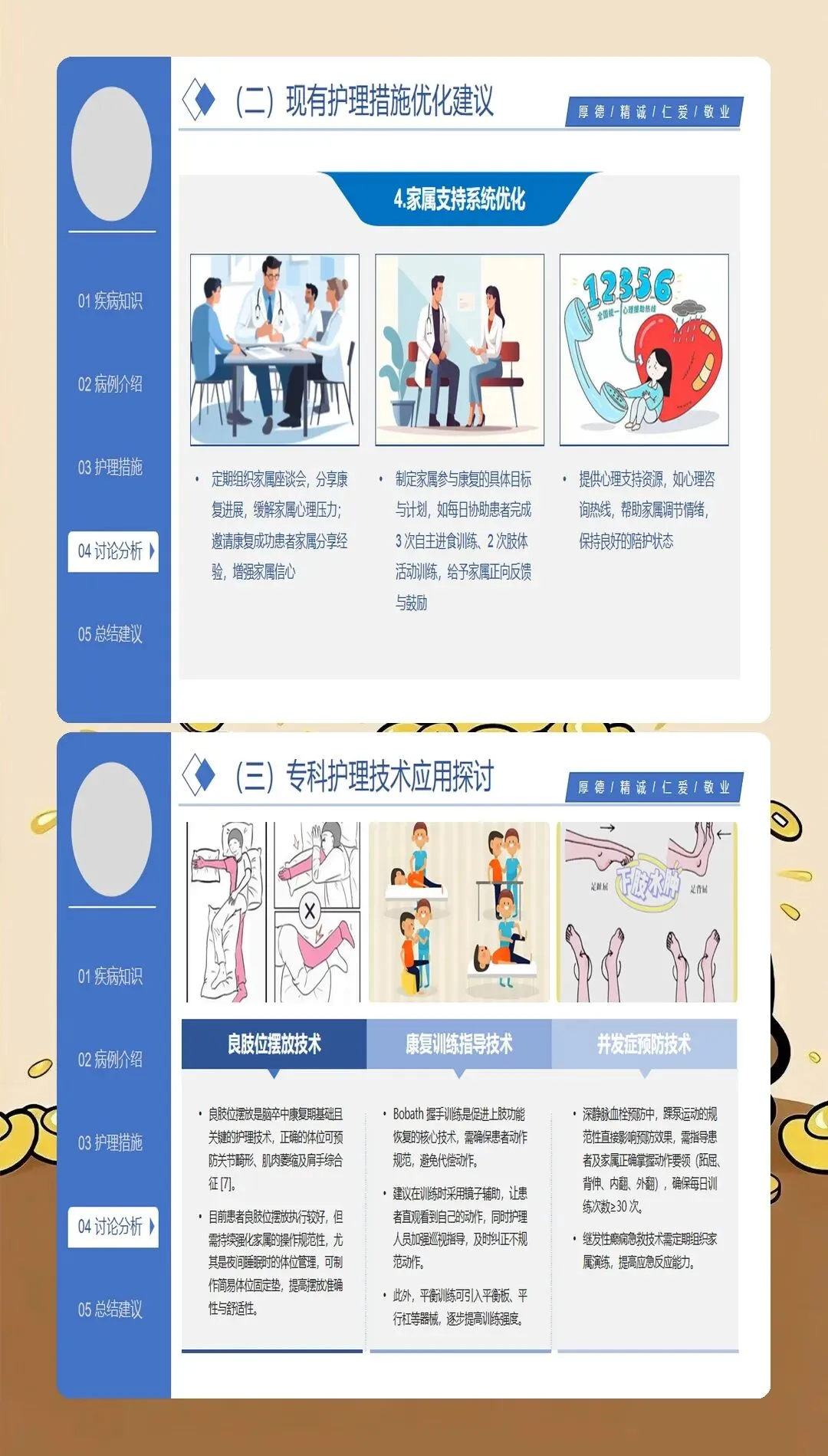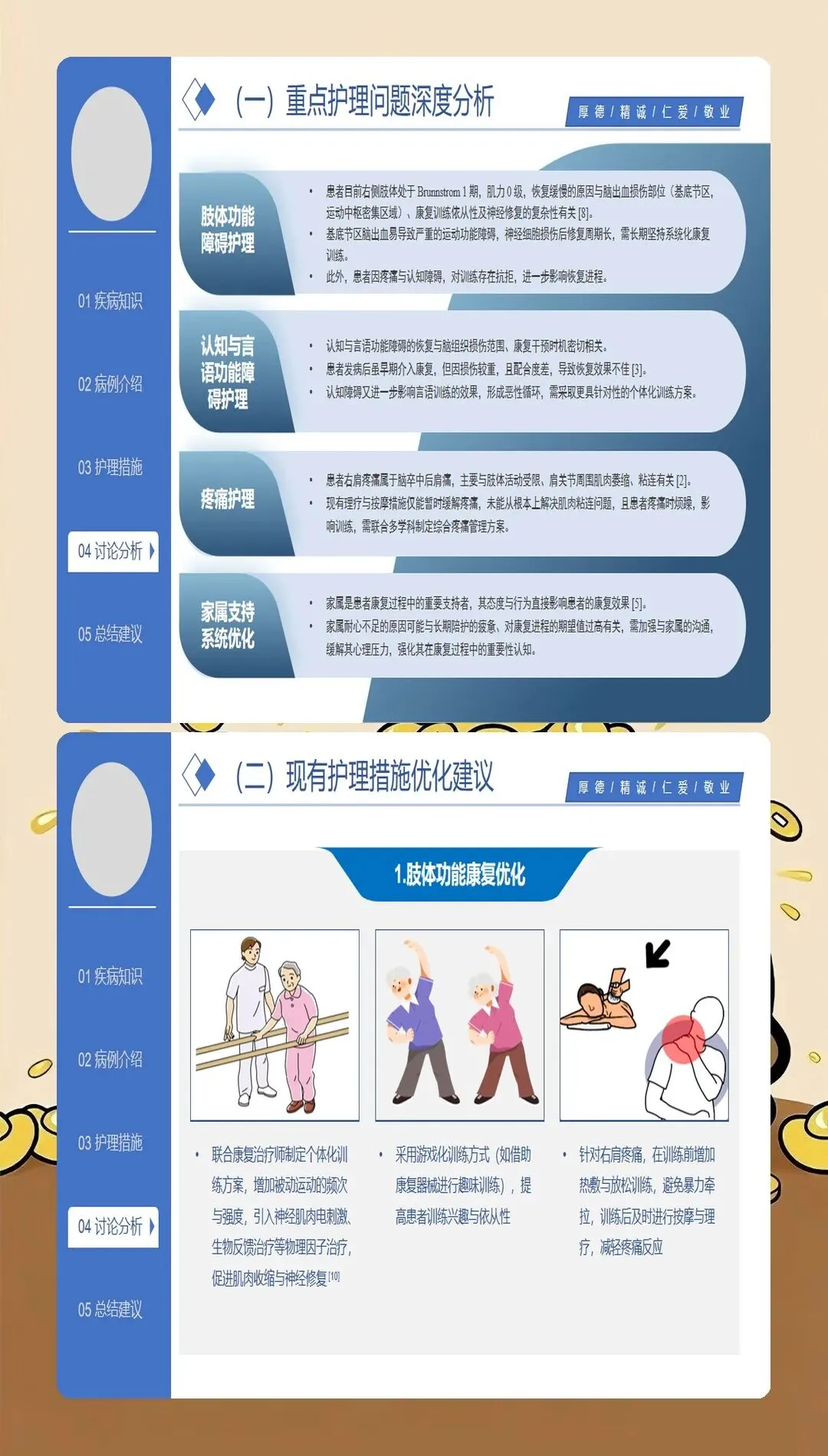 基于循证医学证据的护理干预是脑梗死护理查房的落脚点。最新的护理实践强调个体化、精准化的干预策略:在急性期护理方面,严格执行溶栓和血管内治疗的护理规范,密切观察神经功能变化,预防并发症发生;在体位管理方面,采用良肢位摆放,预防关节挛缩和压疮发生,每2小时翻身一次,避免患肢受压;在吞咽康复方面,根据吞咽功能评估结果制定个性化饮食方案,采用代偿性策略和康复训练相结合的方法,降低误吸风险;在肢体康复方面,早期开展被动运动、主动运动和功能性训练,促进神经功能重组,提高生活自理能力;在心理支持方面,关注卒中后抑郁的发生,采用心理疏导、支持性治疗等方法,促进患者心理调适;在健康教育方面,针对患者和照护者开展系统的健康宣教,提高疾病认知和自我管理能力。临床研究表明,基于循证证据的综合护理干预可使脑梗死患者的日常生活活动能力评分提高30%以上。