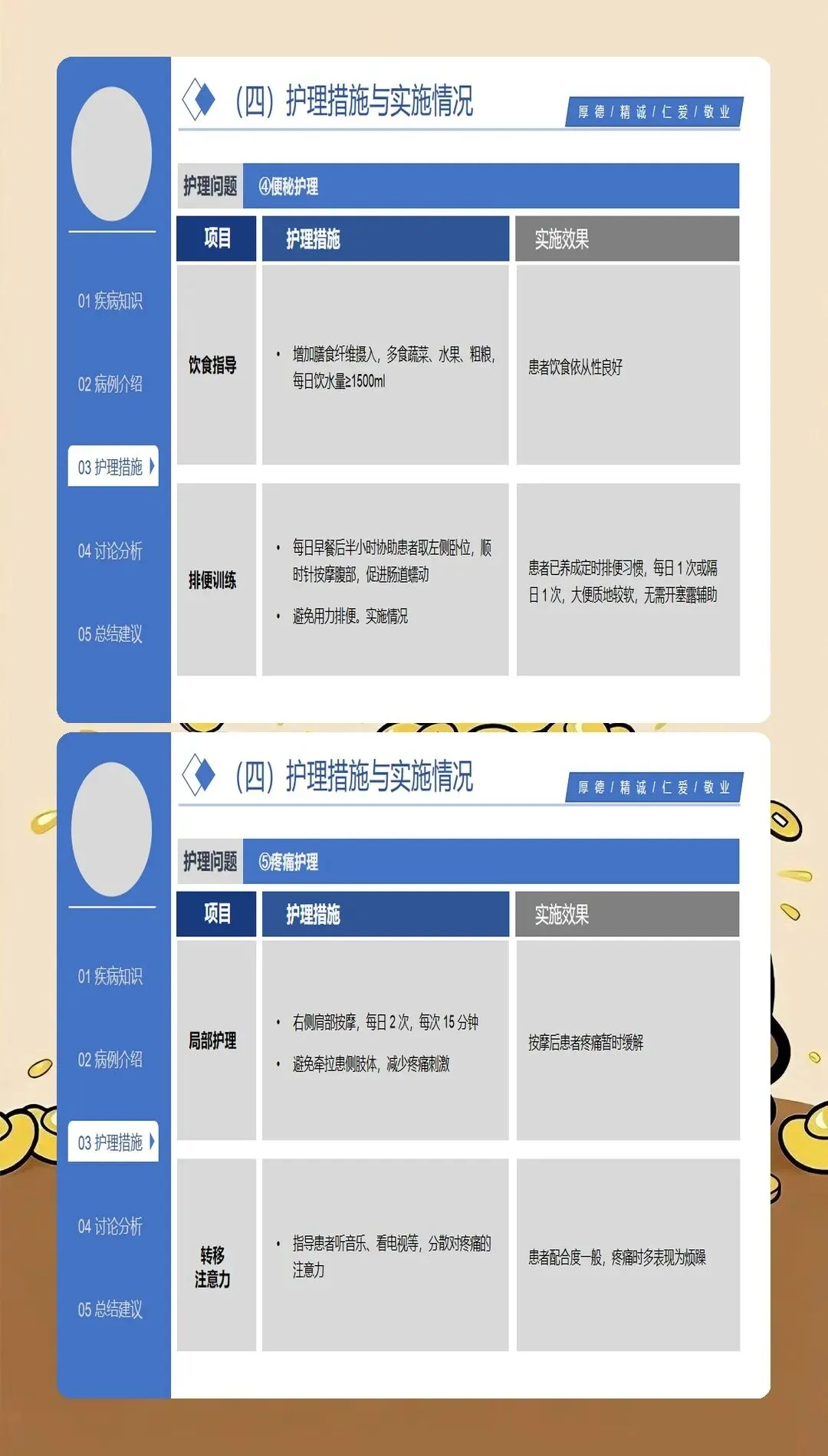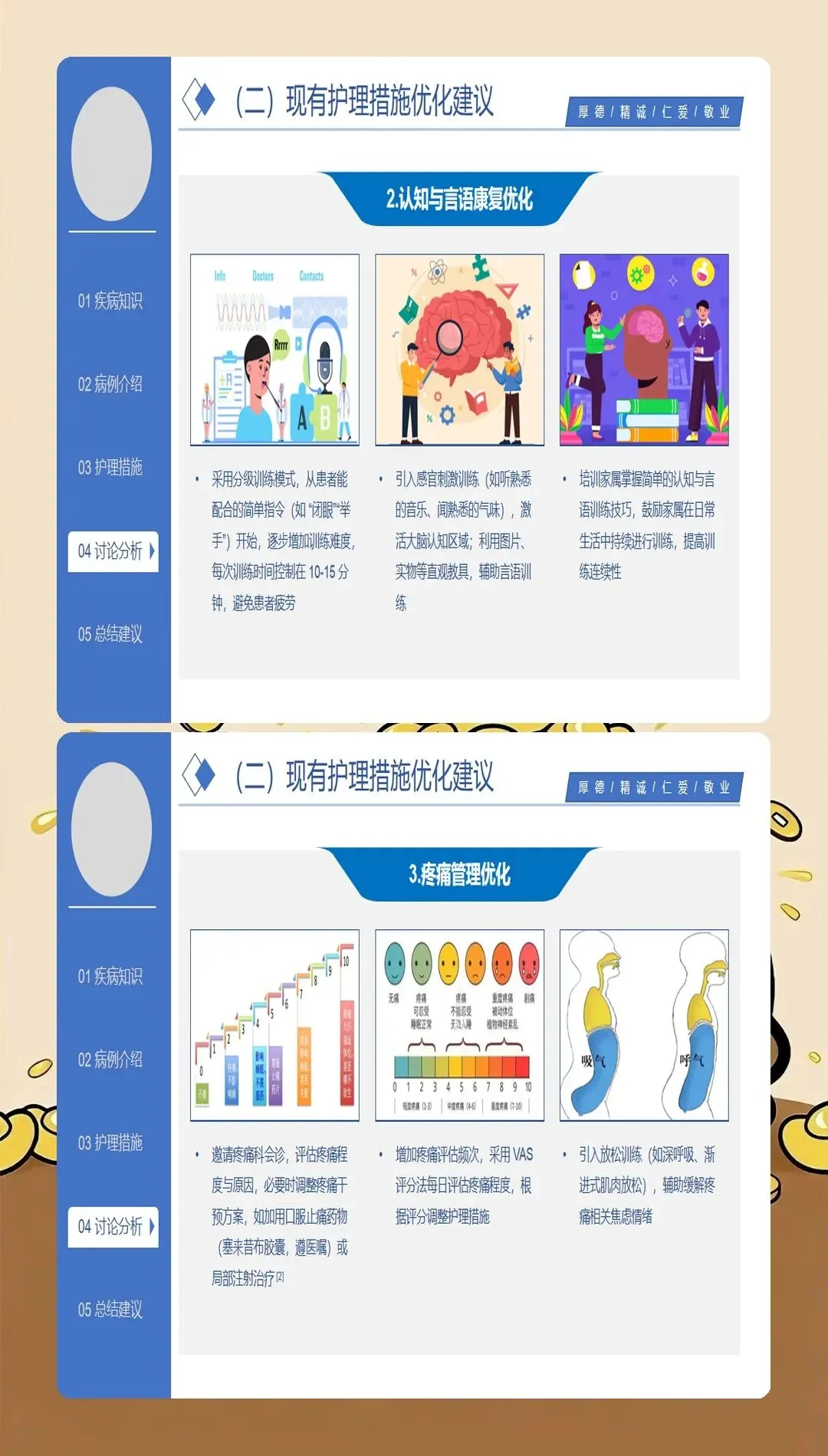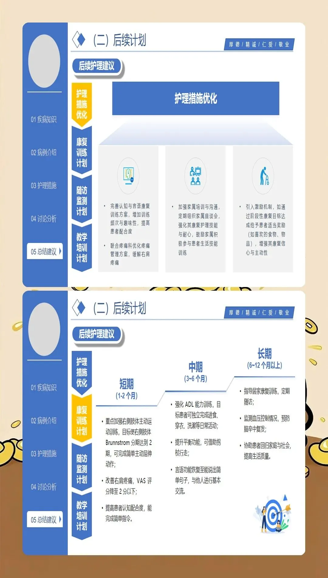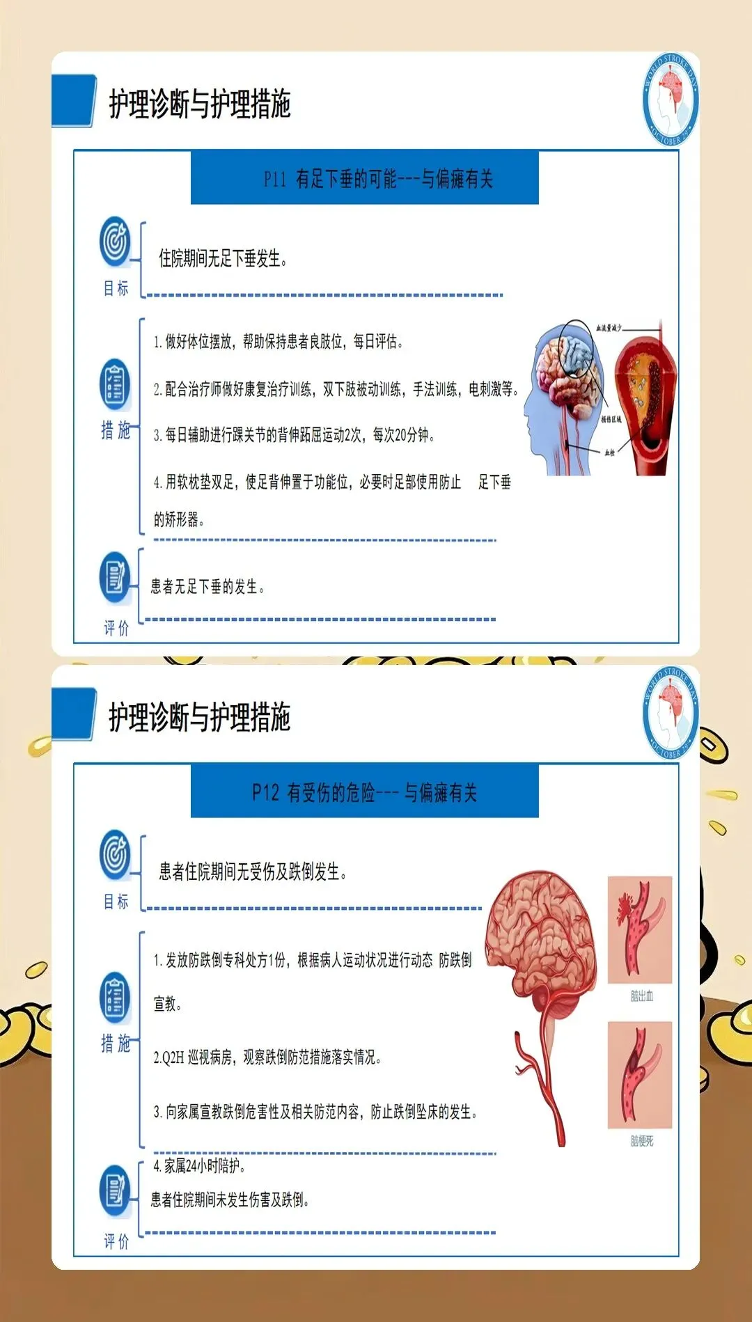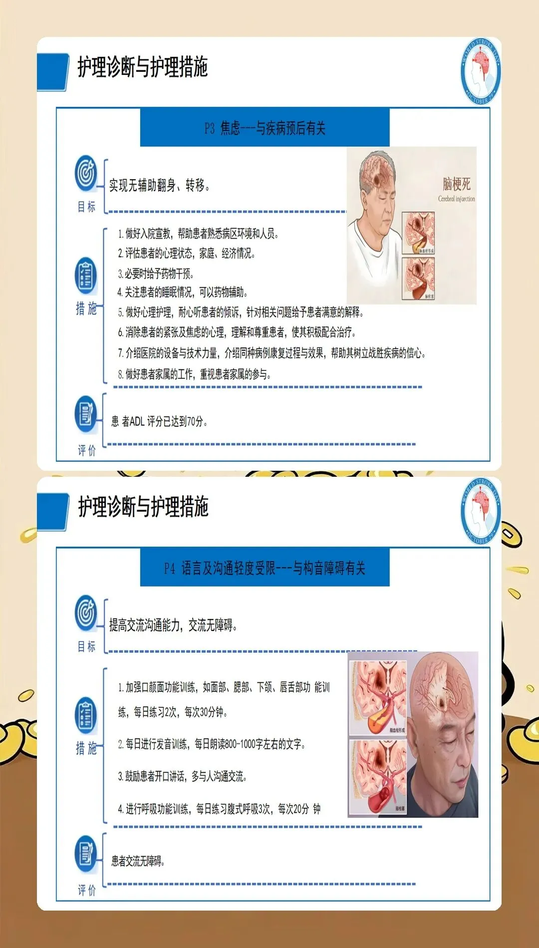 基于循证医学证据的护理干预是脑梗死护理查房的落脚点。最新的护理实践强调个体化、精准化的干预策略:在急性期护理方面,严格执行溶栓和血管内治疗的护理规范,密切观察神经功能变化,预防并发症发生;在体位管理方面,采用良肢位摆放,预防关节挛缩和压疮发生,每2小时翻身一次,避免患肢受压;在吞咽康复方面,根据吞咽功能评估结果制定个性化饮食方案,采用代偿性策略和康复训练相结合的方法,降低误吸风险;在肢体康复方面,早期开展被动运动、主动运动和功能性训练,促进神经功能重组,提高生活自理能力;在心理支持方面,关注卒中后抑郁的发生,采用心理疏导、支持性治疗等方法,促进患者心理调适;在健康教育方面,针对患者和照护者开展系统的健康宣教,提高疾病认知和自我管理能力。临床研究表明,基于循证证据的综合护理干预可使脑梗死患者的日常生活活动能力评分提高30%以上。