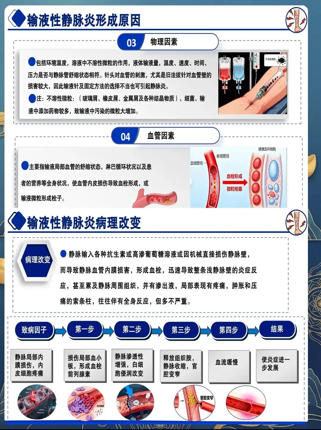 静脉炎的发生机制复杂多样,主要可分为机械性、化学性、细菌性和血栓性四大类型。机械性静脉炎常因导管材质过硬、导管型号与血管不匹配、反复穿刺、导管固定不当、肢体活动过度等因素引起血管壁机械性损伤。化学性静脉炎则与药物pH值、渗透压、输注速度、药物浓度相关,特别是化疗药物、高渗溶液、强酸强碱类药物对血管内皮细胞具有直接损伤作用。细菌性静脉炎多因无菌操作不严格、导管护理不当导致病原菌侵入,引发局部或全身感染。血栓性静脉炎由于血管内皮损伤、血液高凝状态、血流缓慢等因素形成血栓,引起炎症反应。