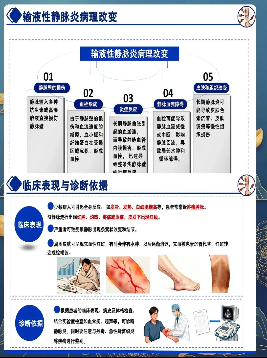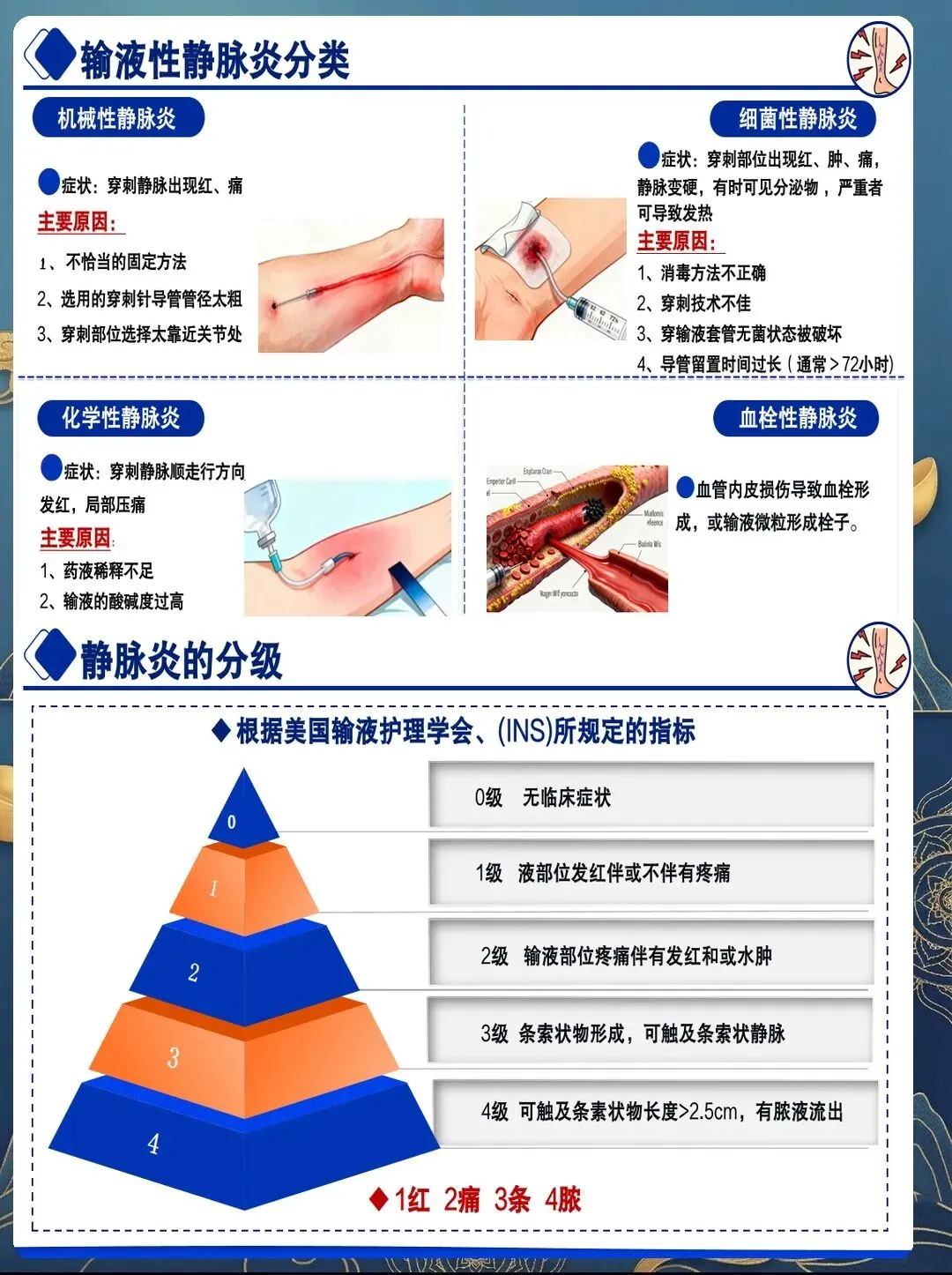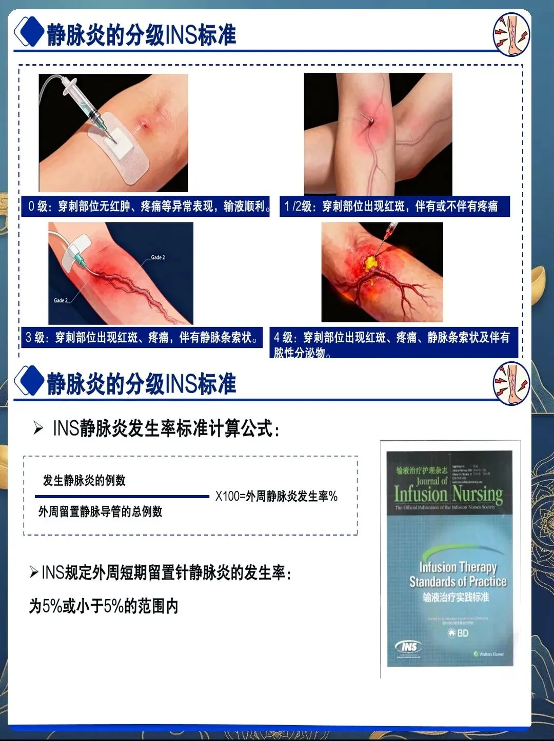 静脉炎的分级评估是制定护理计划的基础。常用的INS静脉炎分级标准将静脉炎分为0-4级。0级无临床症状;1级输液部位发红,伴有或不伴有疼痛;2级输液部位疼痛,伴有发红和/或水肿;3级输液部位疼痛,伴有发红和/或水肿,有条索状物形成,可触及条索状静脉;4级输液部位疼痛,伴有发红和/或水肿,有条索状物形成,可触及条索状静脉长度大于2.5cm,有脓液流出。准确的分级评估有助于判断病情严重程度,选择合适的干预措施。