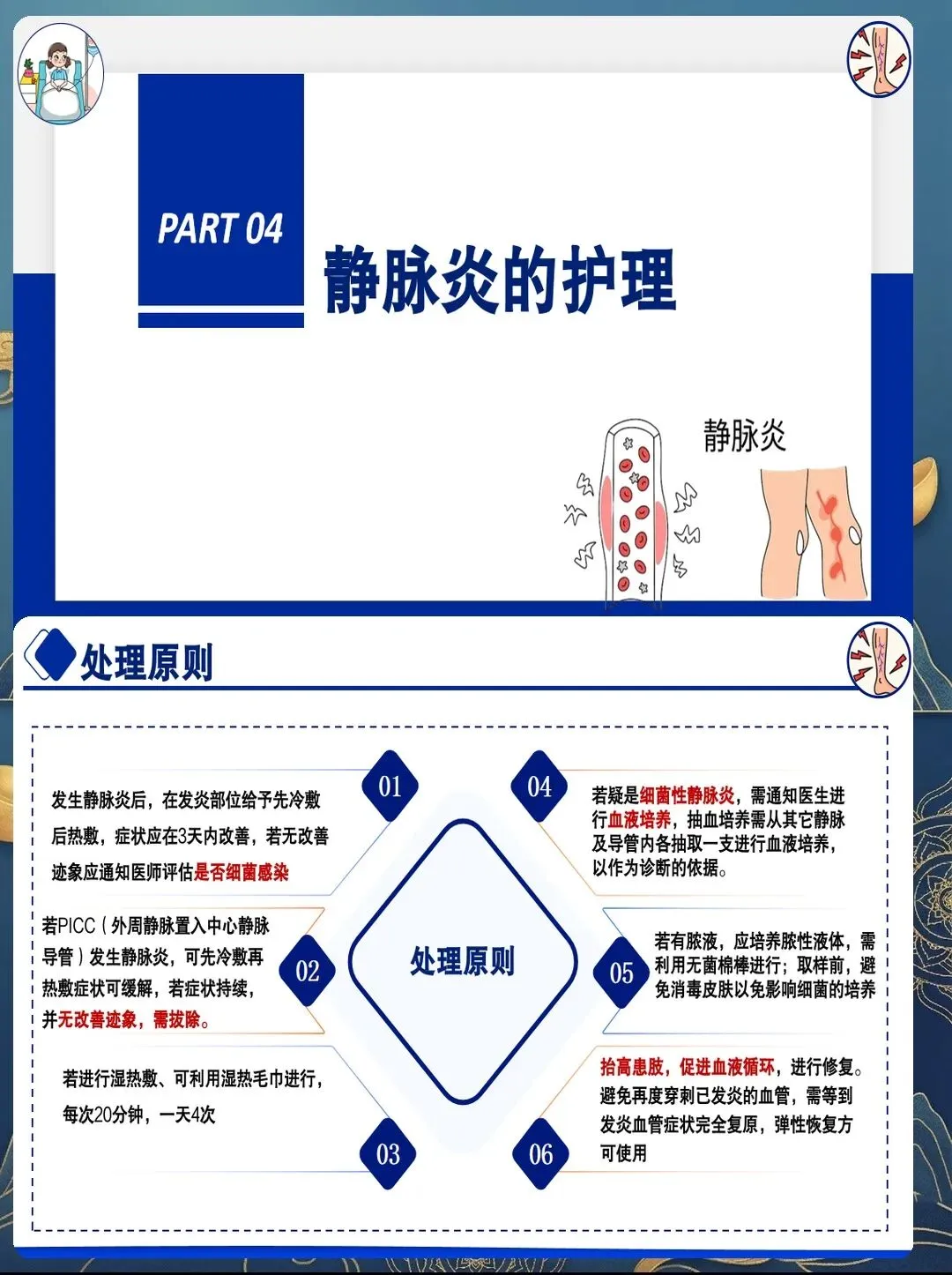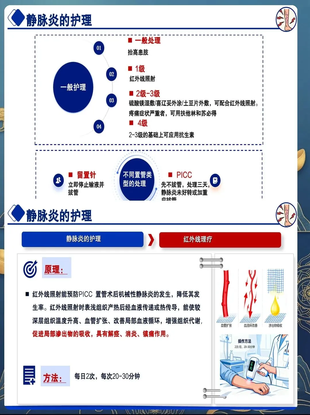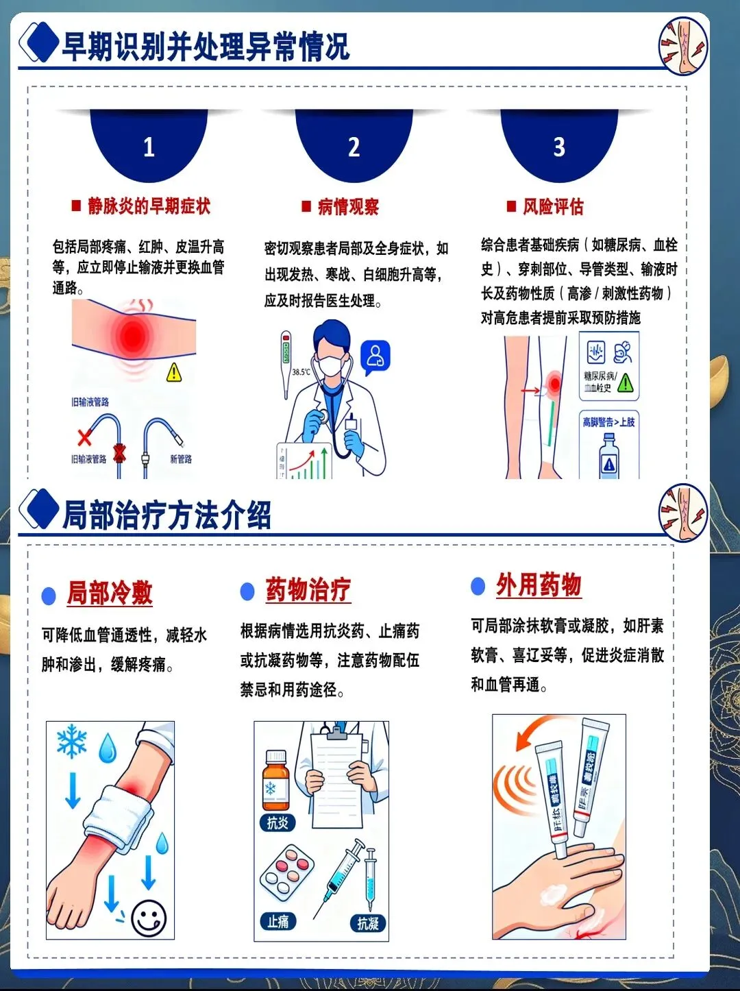 静脉炎的分级评估是制定护理计划的基础。常用的INS静脉炎分级标准将静脉炎分为0-4级。0级无临床症状;1级输液部位发红,伴有或不伴有疼痛;2级输液部位疼痛,伴有发红和/或水肿;3级输液部位疼痛,伴有发红和/或水肿,有条索状物形成,可触及条索状静脉;4级输液部位疼痛,伴有发红和/或水肿,有条索状物形成,可触及条索状静脉长度大于2.5cm,有脓液流出。准确的分级评估有助于判断病情严重程度,选择合适的干预措施。