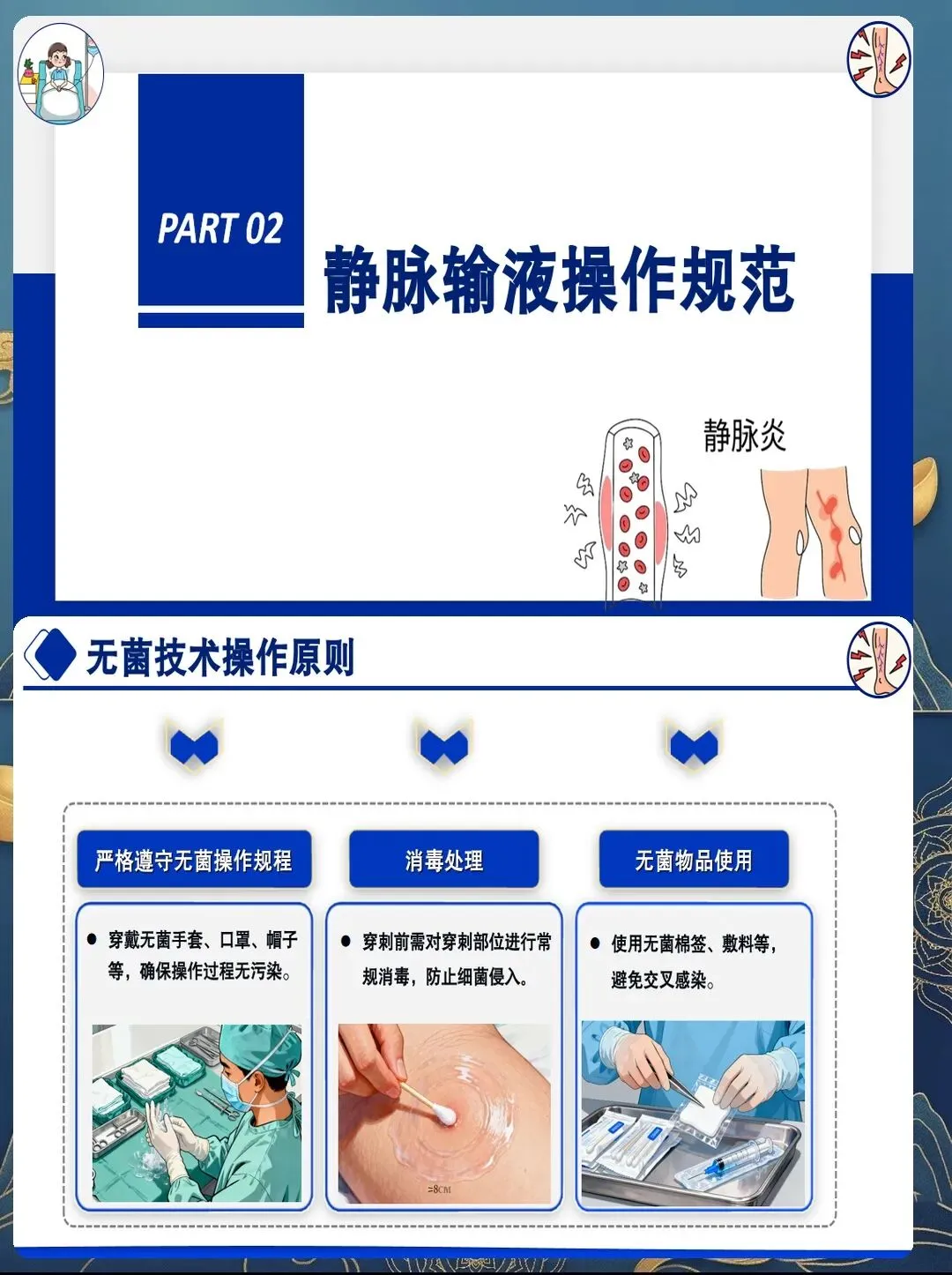 预防策略的实施需要贯穿输液全过程。静脉选择是预防静脉炎的关键环节,应遵循由远心端到近心端、由细小血管到粗大血管的原则,优先选择上肢、管径粗直、弹性好、血流丰富的血管,避免选择关节部位、受伤感染部位、下肢静脉。对于刺激性药物,应选择粗大、血流丰富的静脉,必要时使用中心静脉导管。穿刺技术要熟练规范,严格执行无菌操作,力争一次成功,避免反复穿刺损伤血管壁。