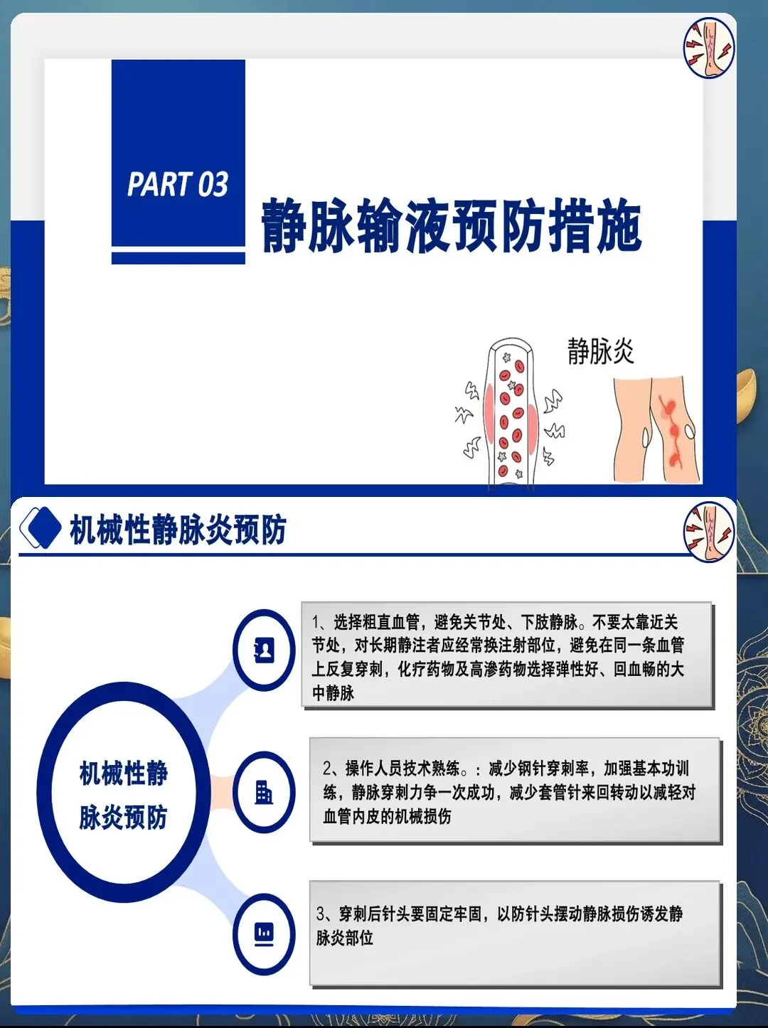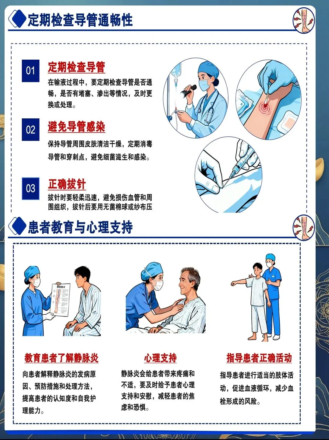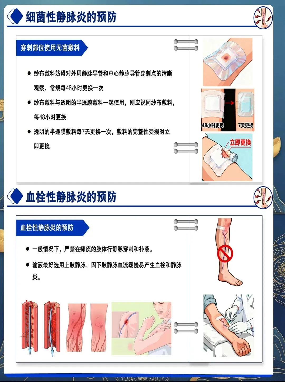 导管的规范使用和维护是预防的核心内容。根据治疗需要选择合适的导管型号,在满足治疗需求的前提下,选择最小型号的导管,减少对血管壁的机械性刺激。导管固定要牢固可靠,避免导管滑脱或移位损伤血管。定期评估导管留置的必要性,中长导管留置时间不超过4周,外周静脉留置针不超过72小时。对于需要长期输液的患者,建议使用PICC或输液港,降低静脉炎发生风险。