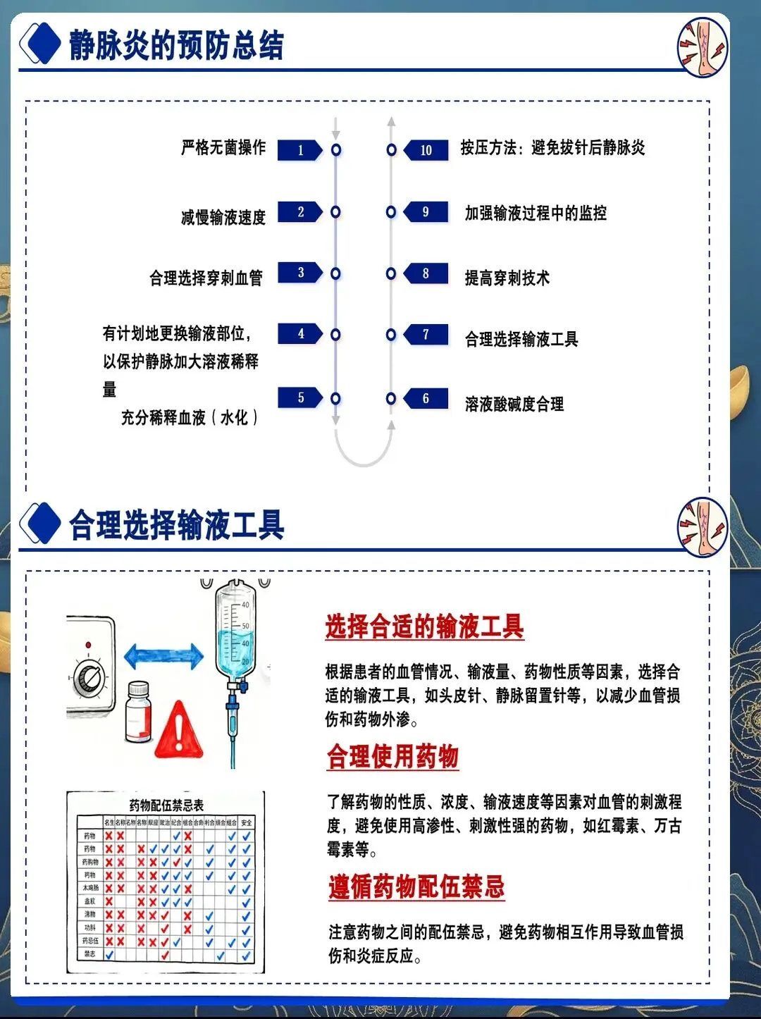 识别静脉炎的危险因素是预防的第一步。患者相关因素包括年龄、基础疾病、营养状况、凝血功能、免疫状态等。老年患者血管弹性下降、管壁变薄,更容易发生机械性损伤;糖尿病患者微循环障碍,感染风险增加;恶性肿瘤患者常伴有高凝状态,易形成血栓。治疗相关因素包括输液时间、导管留置时间、药物特性、输液部位选择等。长期输液、导管留置时间超过72小时、输注刺激性药物、选择关节部位穿刺等都是高危因素。