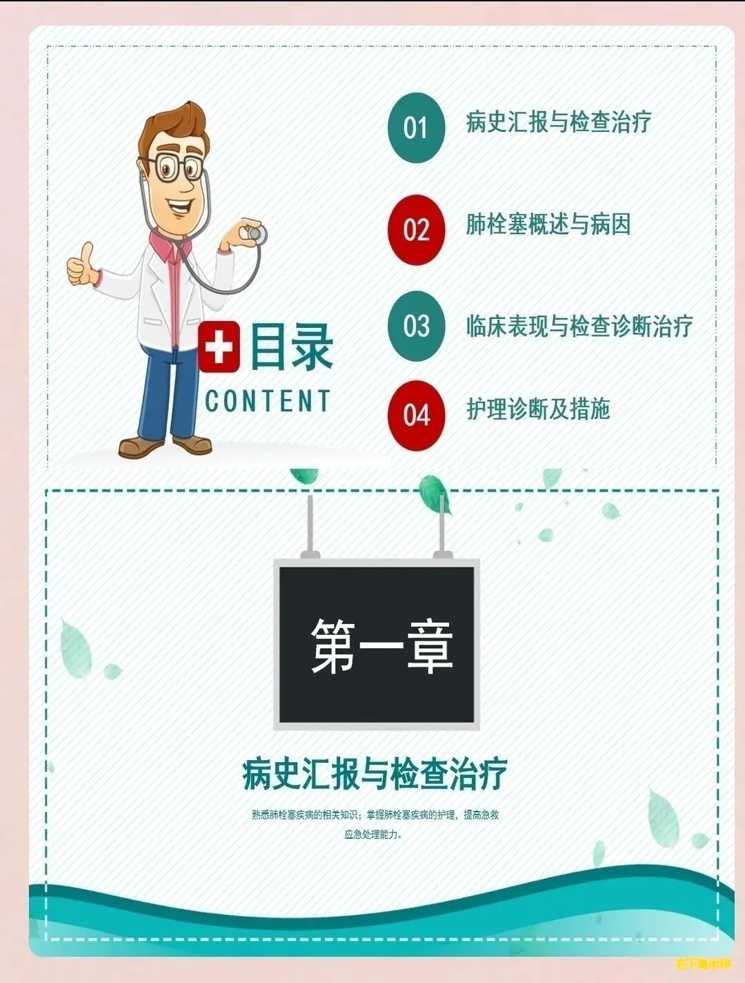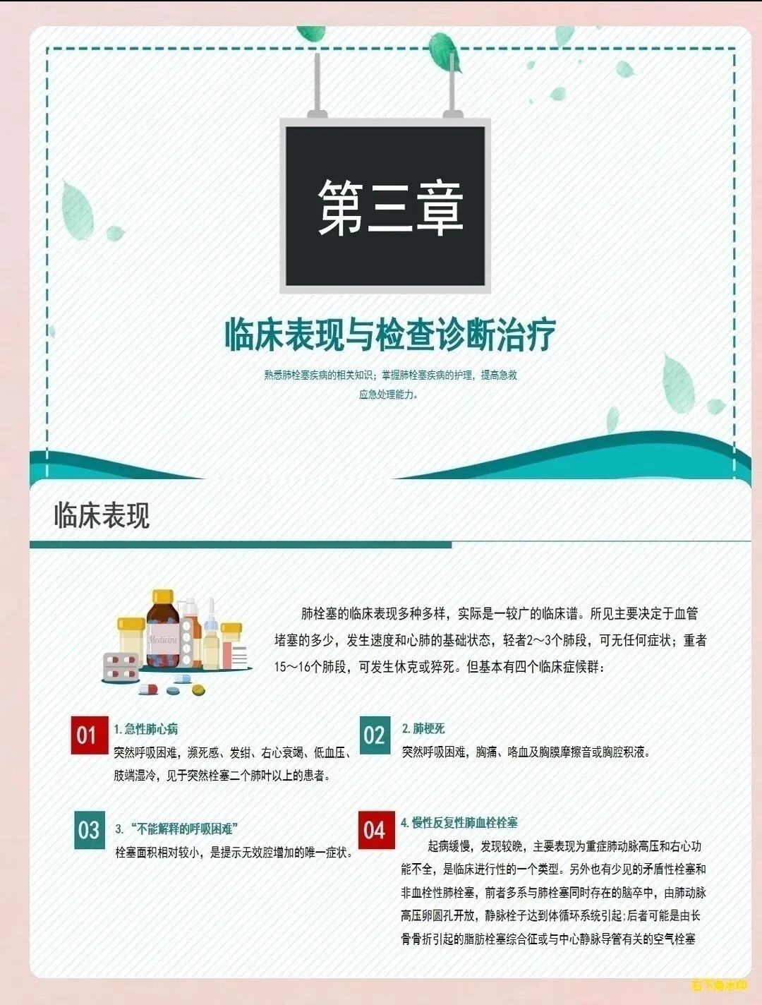 深静脉血栓形成的预防与护理:肺栓塞患者多合并下肢深静脉血栓,需采取预防措施。抬高患肢,促进静脉回流;避免下肢静脉穿刺和损伤;遵医嘱使用梯度压力弹力袜或间歇充气加压装置;指导患者进行踝泵运动,促进血液循环;密切观察患肢肿胀、疼痛、皮温及颜色变化,监测血栓情况。