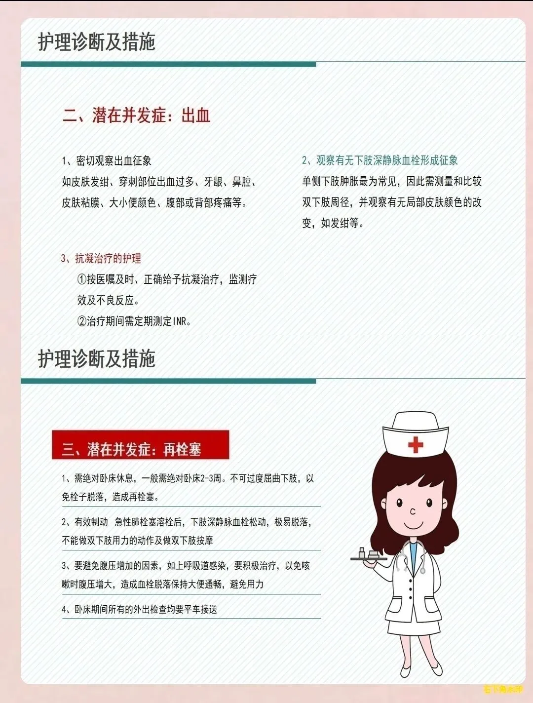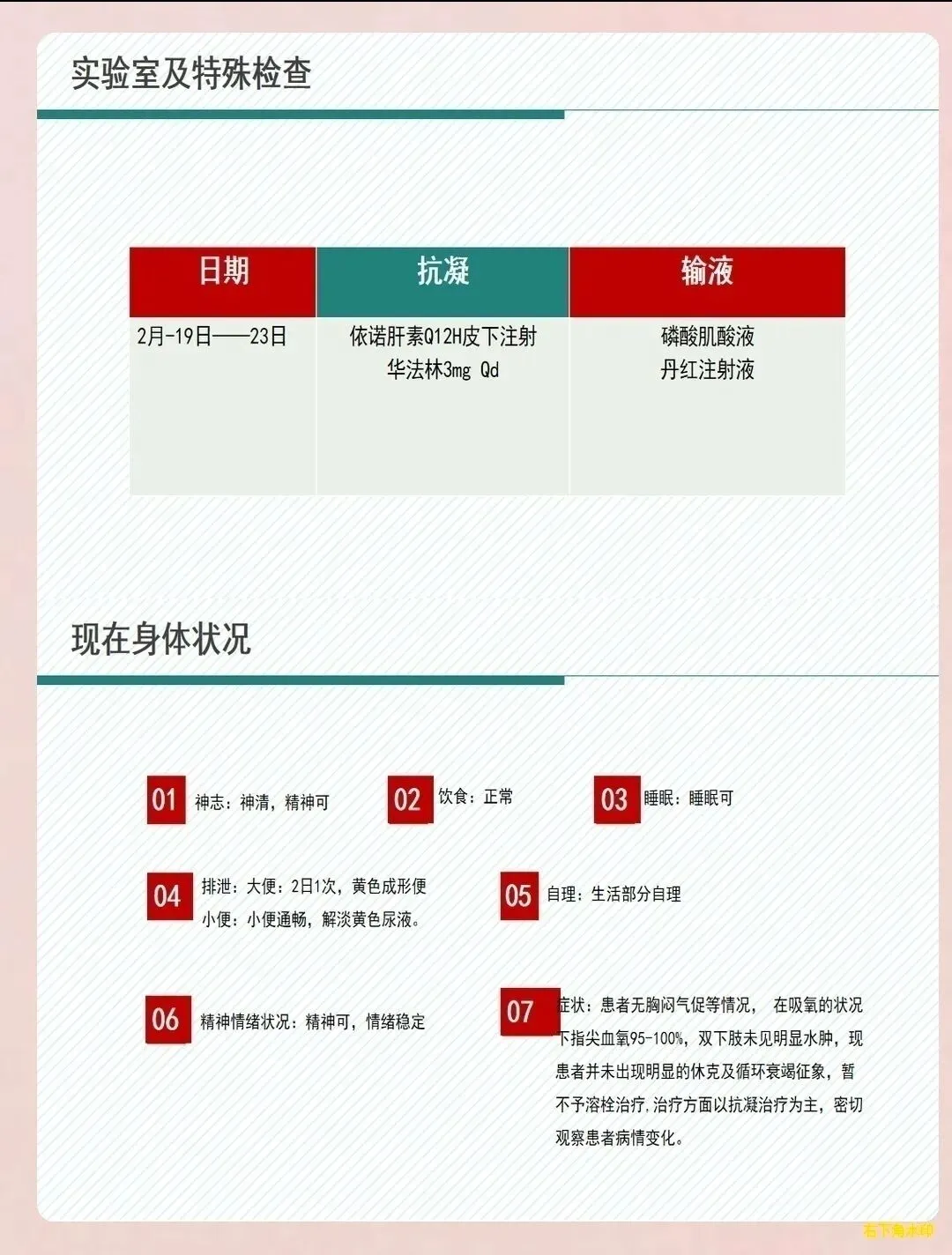 并发症风险评估:评估患者是否存在出血风险、深静脉血栓形成风险、复发风险等。监测有无咯血、消化道出血、颅内出血等出血征象;评估下肢深静脉血栓情况;识别复发的危险因素。