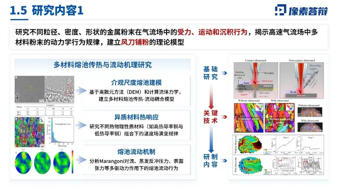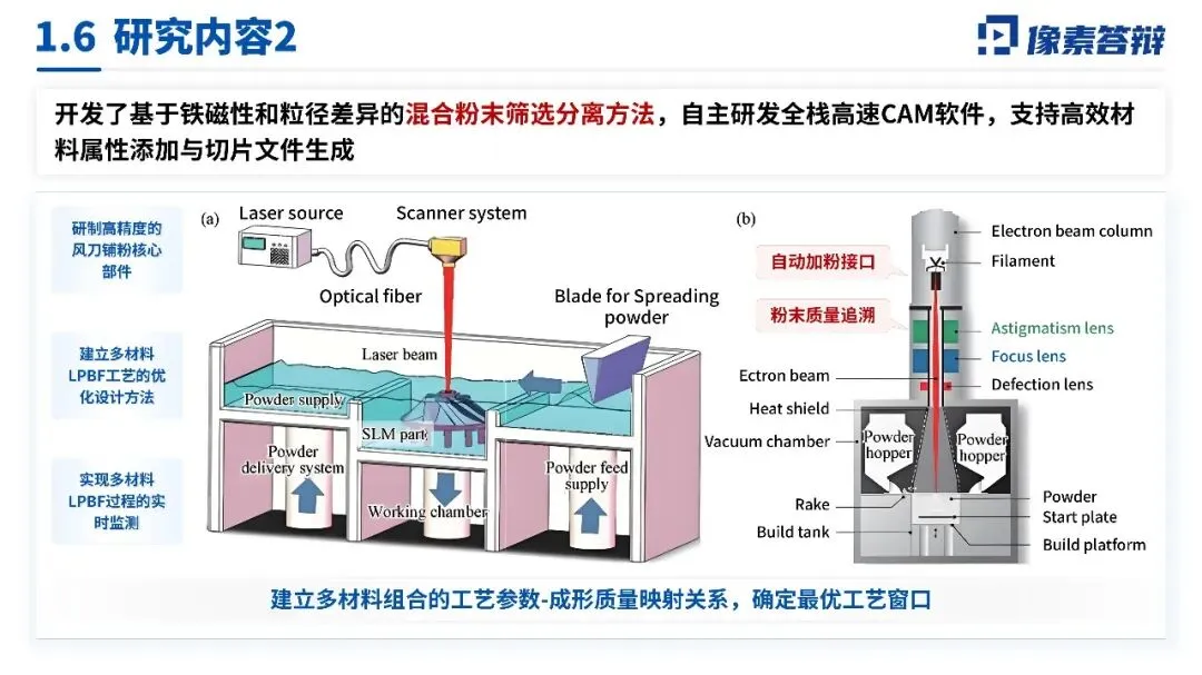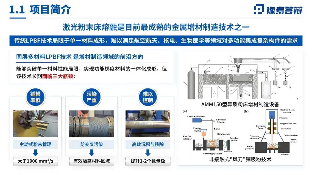 内容上拒绝大段文字堆砌,用模块化框图拆解多材料精确沉积、风刀铺吸粉、异质界面冶金调控等核心难点,三大代表性技术层层递进:从航空航天等领域对多功能集成构件的需求锚定,到传统LPBF技术铺粉率低、污染严重、难以控制的卡脖子问题剖析,再到非接触式风刀技术与全闭环粉末循环体系的工艺突破,清晰呈现“问题导向→原创思路→关键突破”,让评委一眼抓住核心技术贡献。