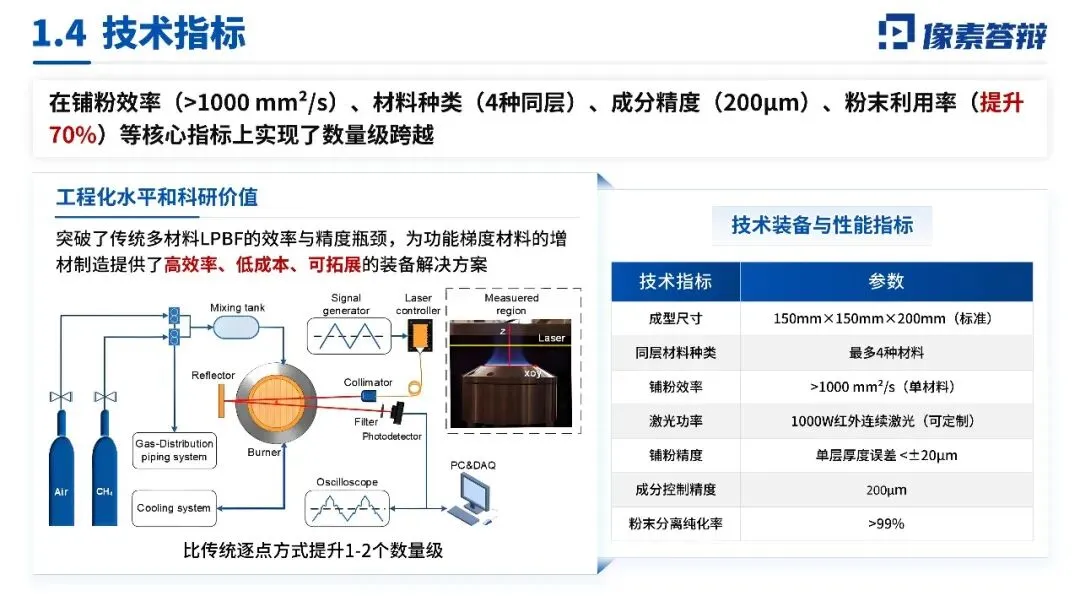 技术突破、产业适配、依托平台、合作团队依次铺展,既体现当前多材料增材制造自主可控的突破力度(铺粉效率>1000mm²/s、4种同层材料、成分精度200μm),又展现后续可落地、有格局的产业化布局(预计新增销售收入2亿元以上),形成需求牵引→瓶颈突破→技术创新→产业赋能的完整闭环。