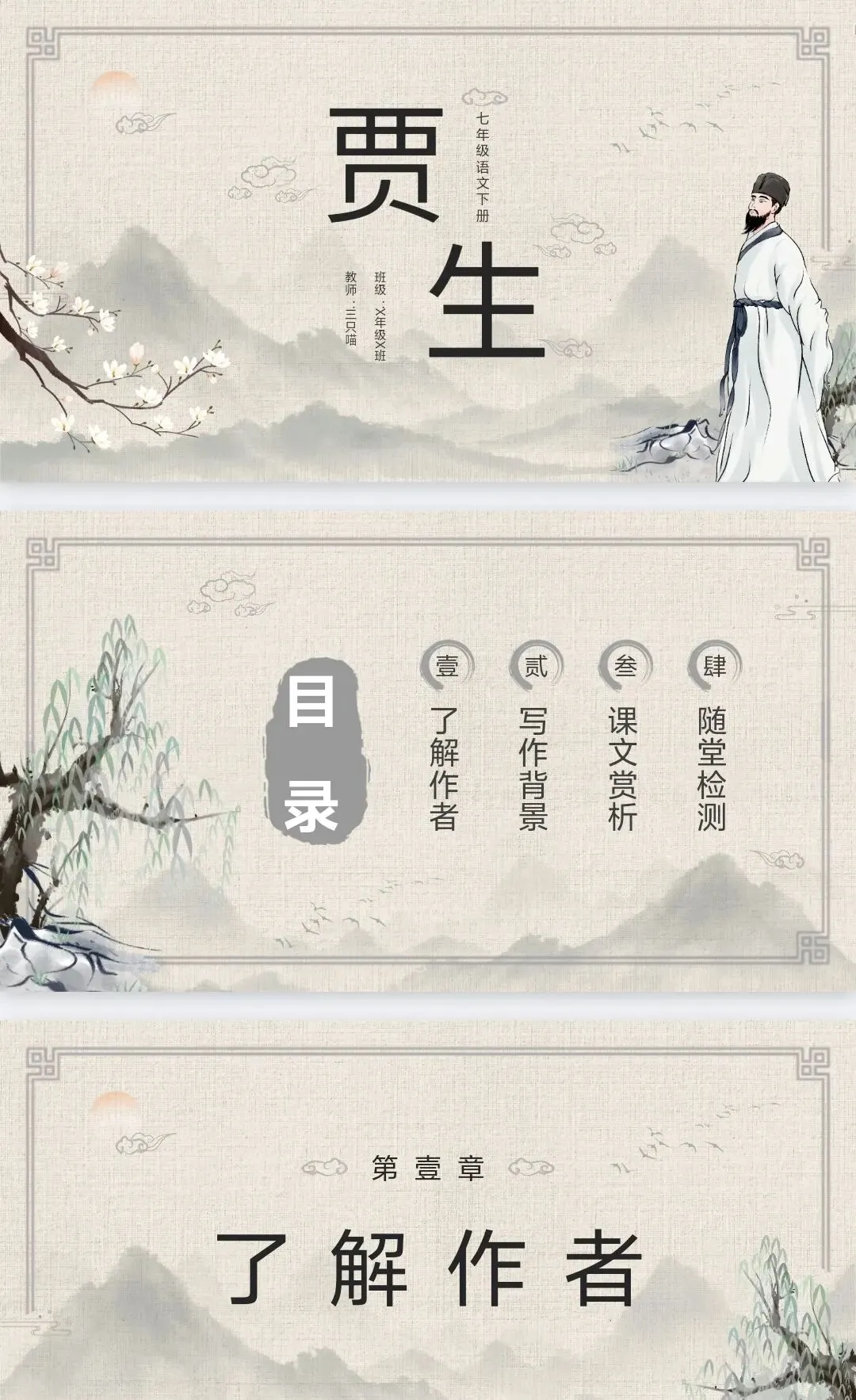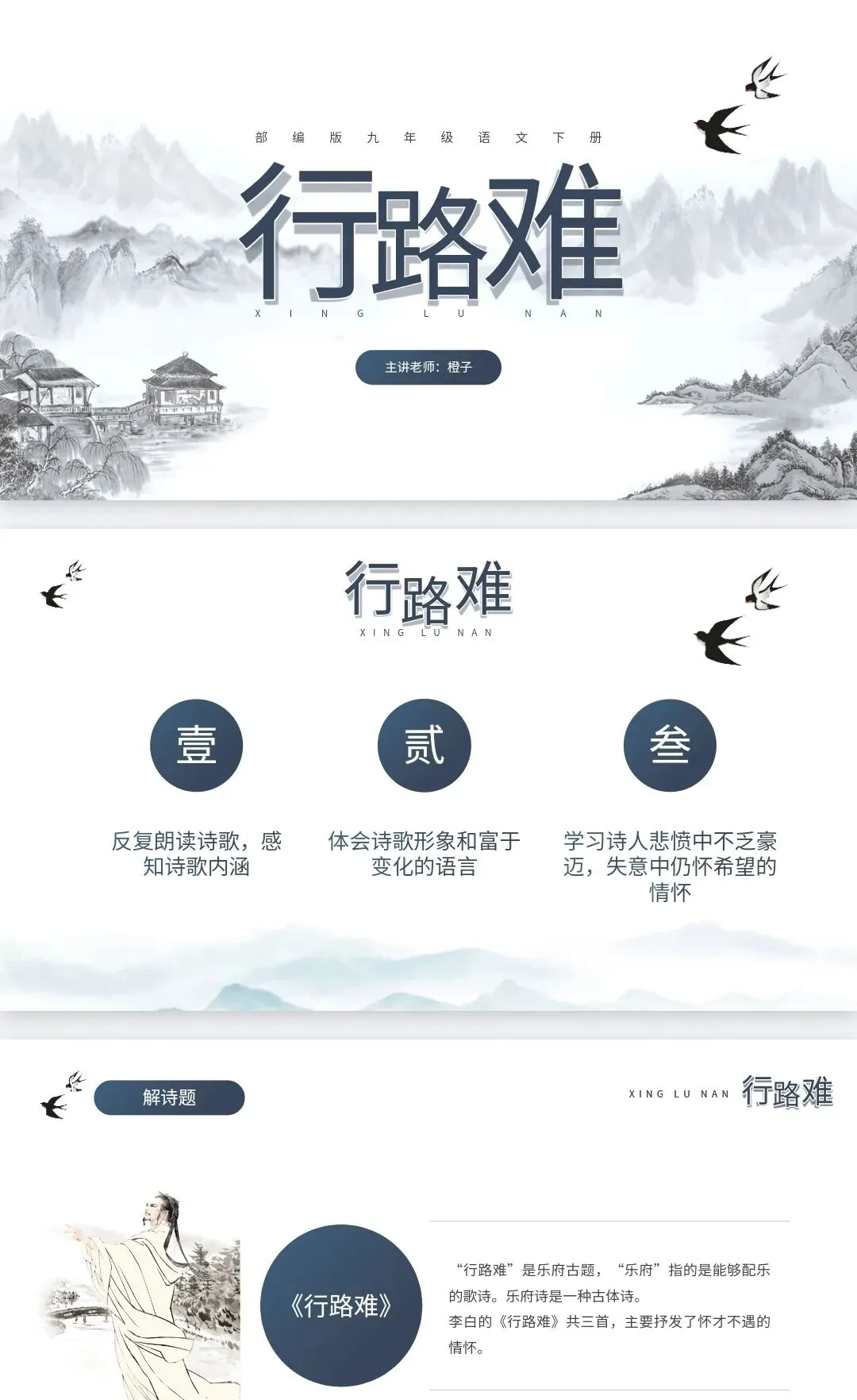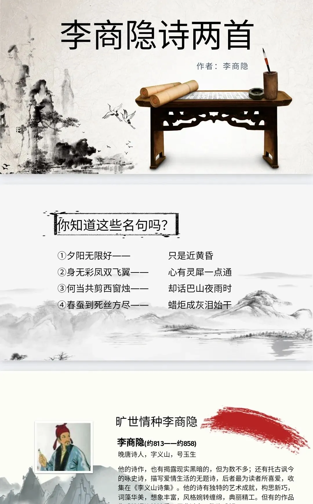 ,水墨国风 + 清晰排版,适配诗词讲解、朗诵比赛、国学班会、文学赏析,一秒提升课堂氛围感!
