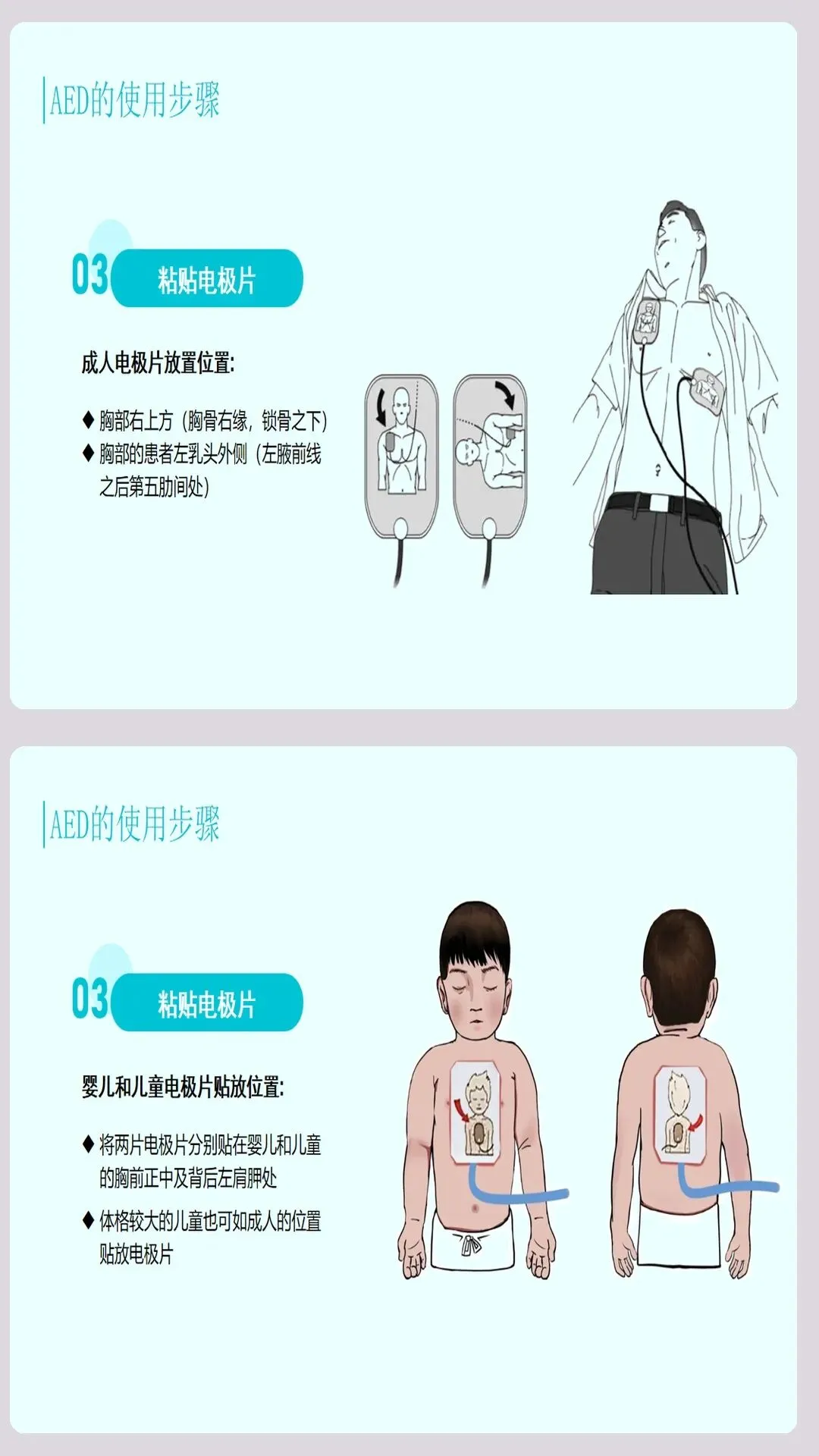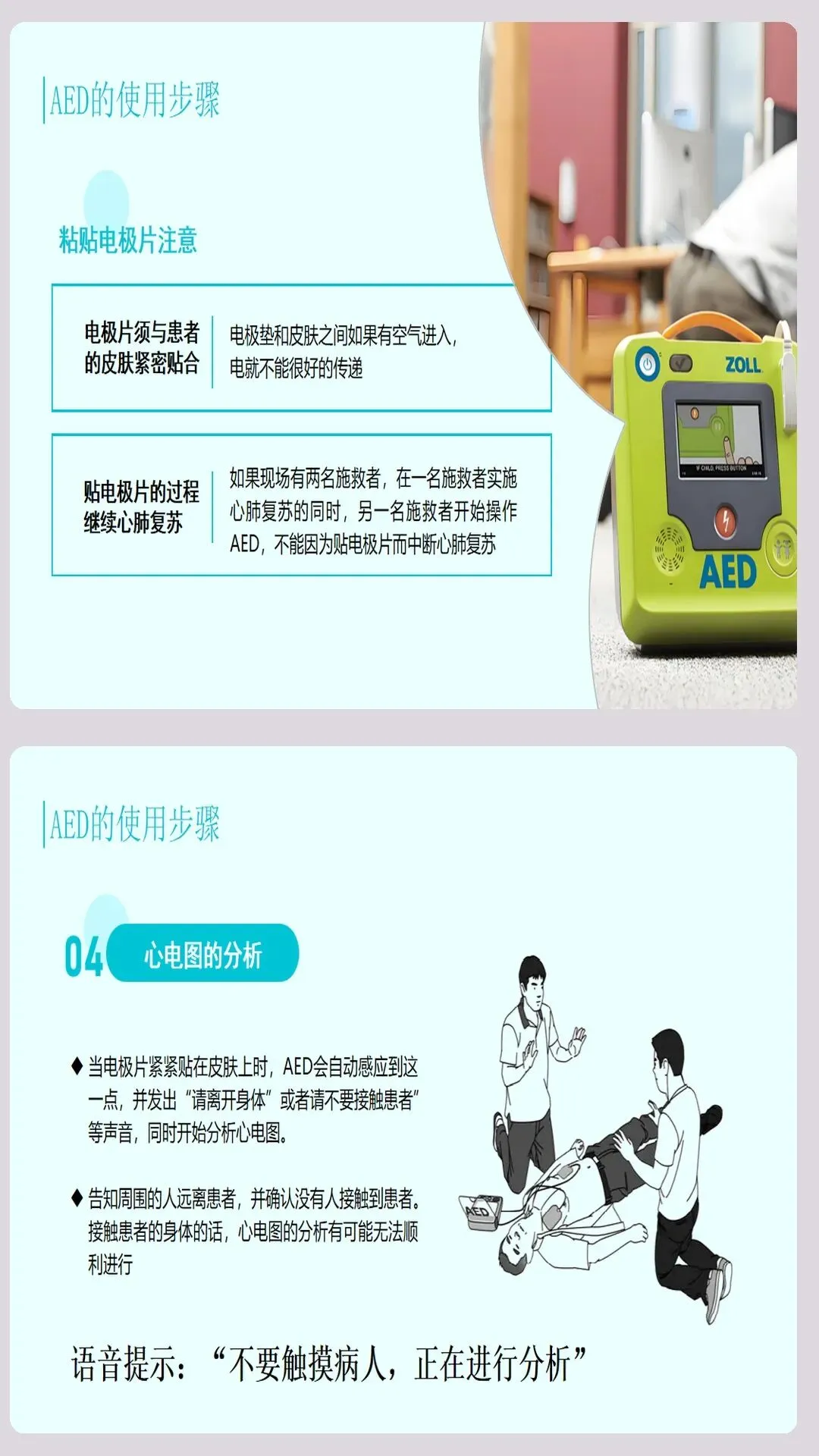 当发现有人疑似心脏骤停时,第一步是确认环境安全并呼叫帮助。拿到AED后,只需打开电源,它就会通过语音一步步指导你操作。接下来,按照机器上的图示,把两片电极片分别贴在患者右胸上方和左胸下方。贴好后,AED会自动分析心律,这时候千万记得提醒所有人:“大家都散开,不要触碰患者!”