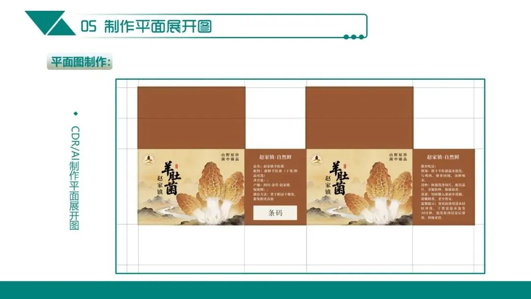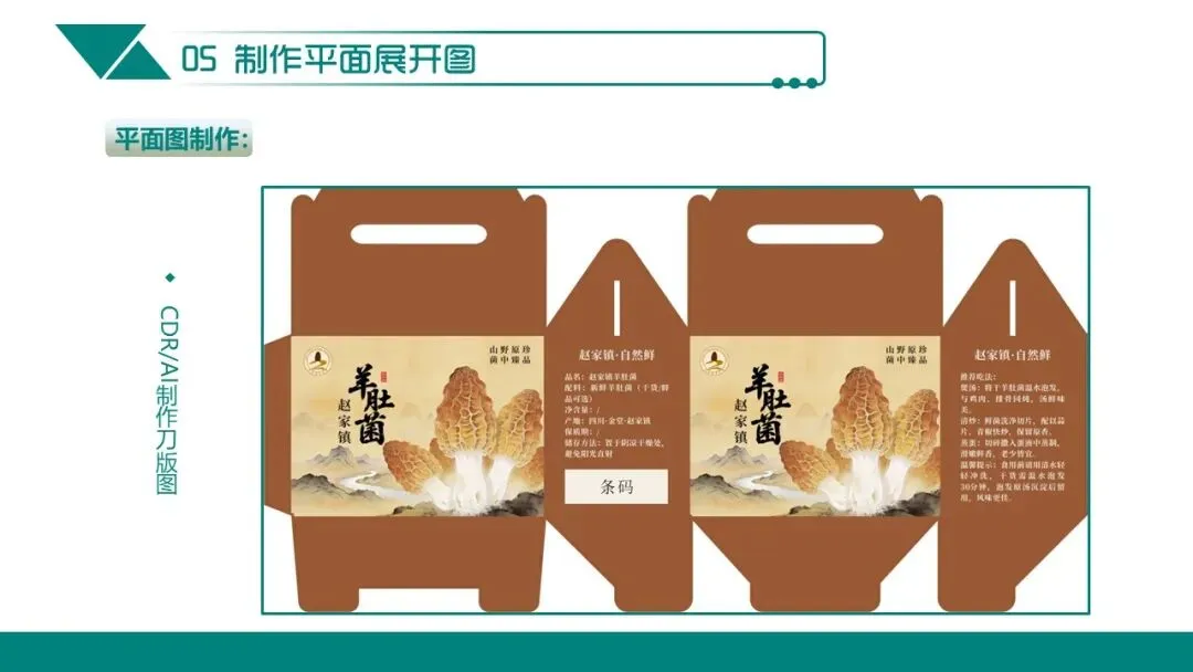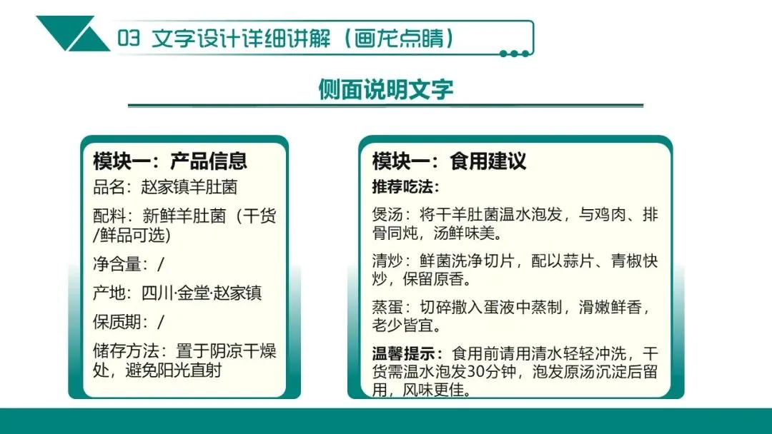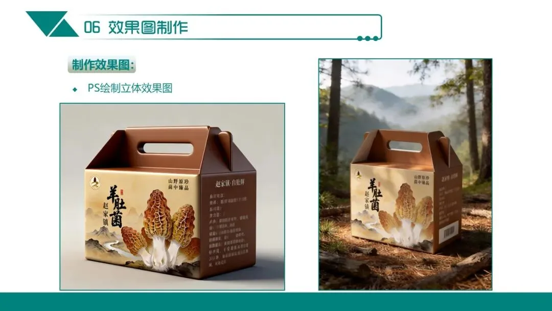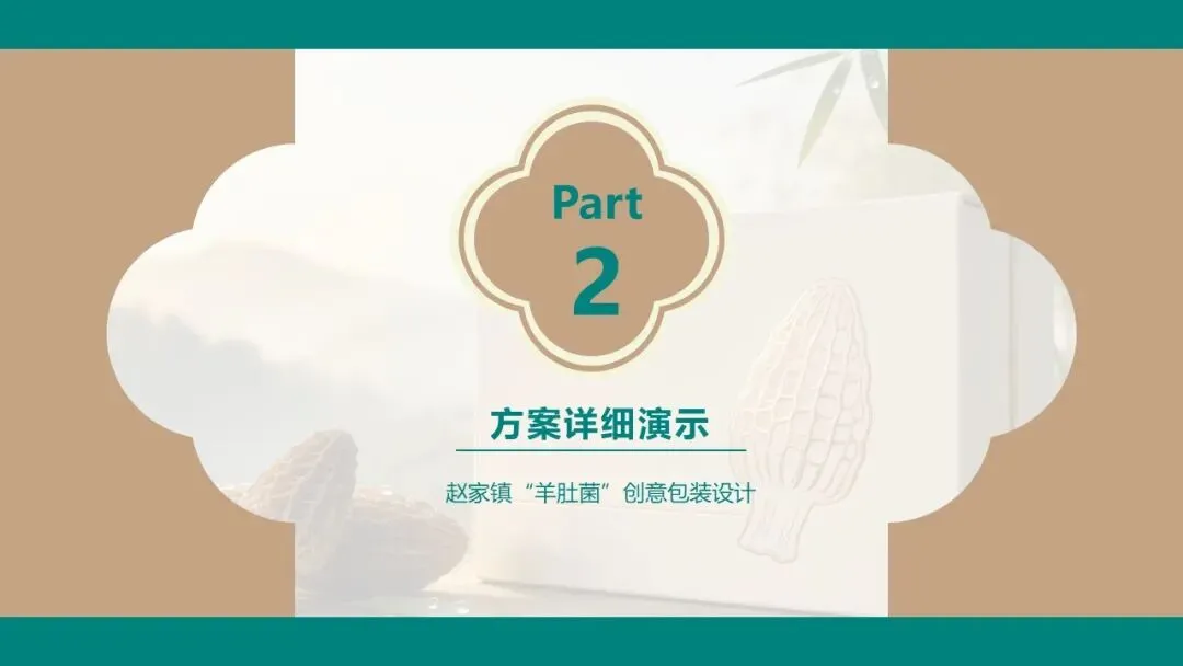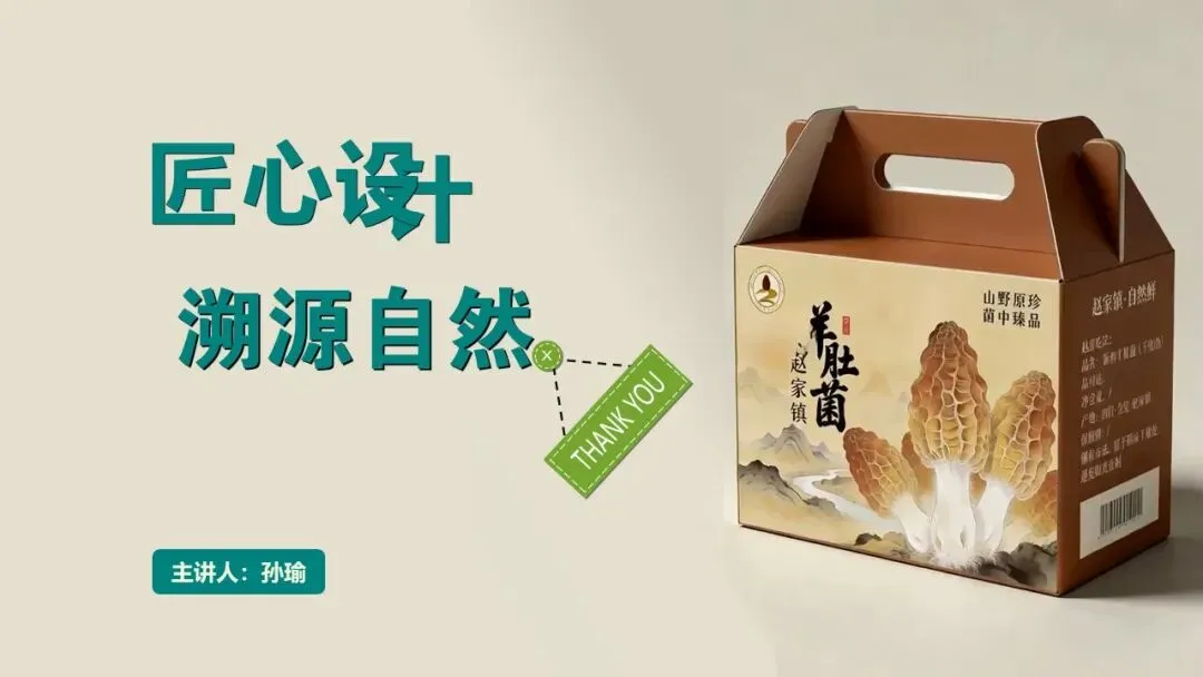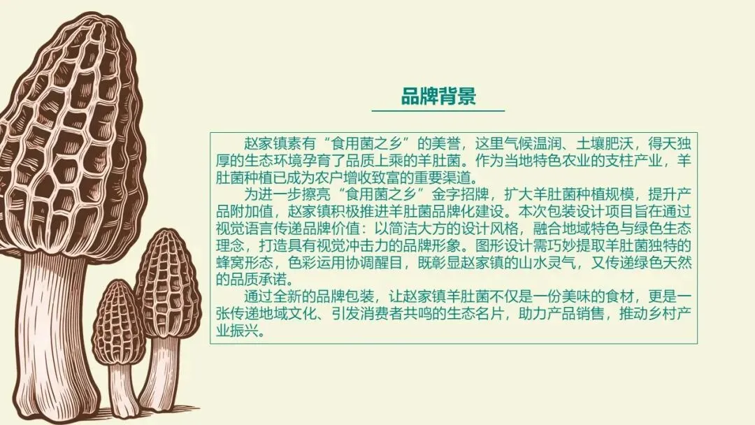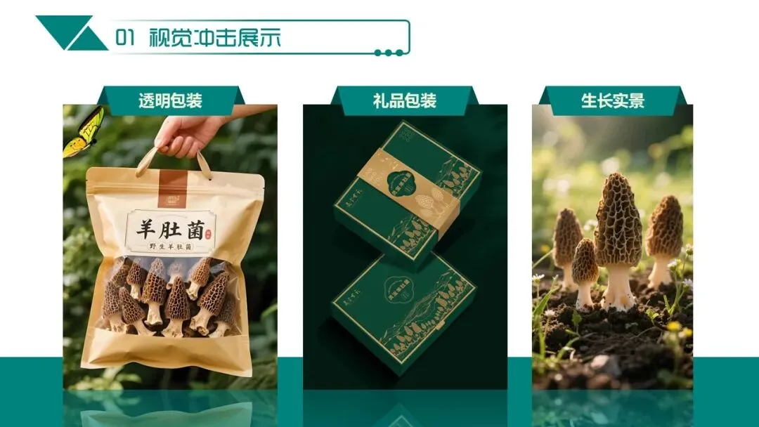 1.视觉冲击展示:提前准备3组包装(PPT呈现,清晰直观)——①普通无设计羊肚菌包装(透明塑料袋,仅印“羊肚菌”三字,无图案、无色彩搭配);②市面上热门农产品包装(如网红菌菇、本地特产包装,突出图形醒目、色彩协调特点);③赵家镇羊肚菌实景图(沾着露水的羊肚菌、赵家镇龙泉山脉种植基地、紫色土壤,贴合地域特色)。