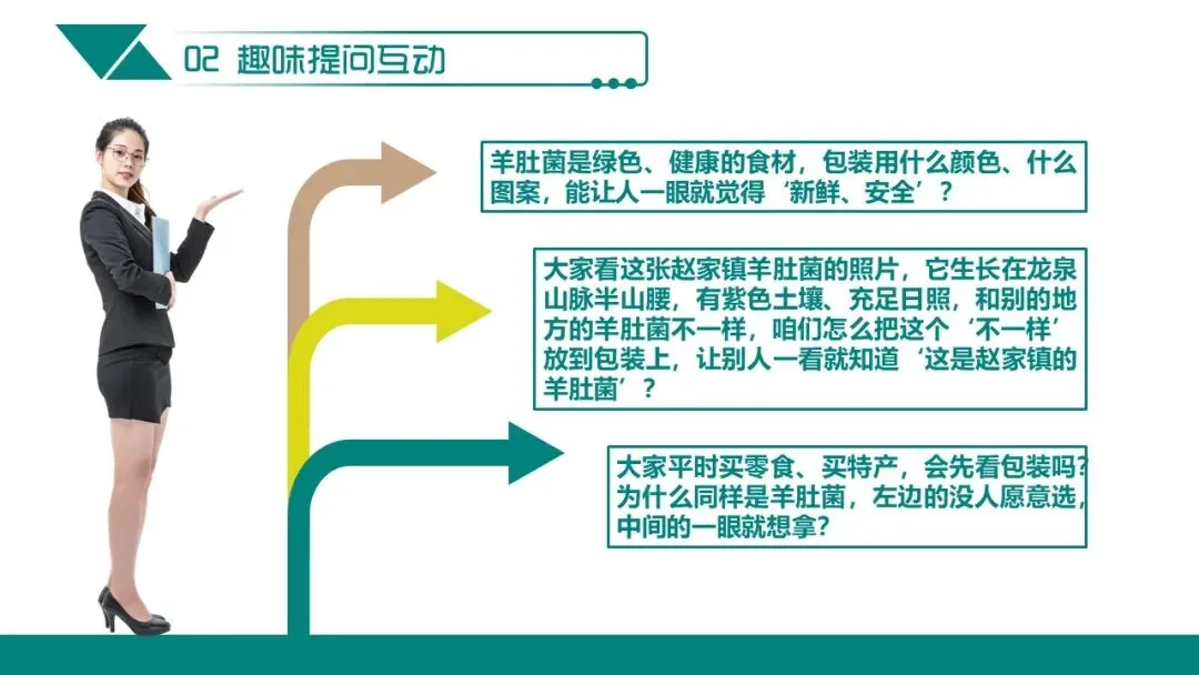 ①“大家平时买零食、买特产,会先看包装吗?为什么同样是羊肚菌,左边的没人愿意选,中间的一眼就想拿?”(引导学生说出“好看、醒目、有特色”等关键词,贴合中职生直观感受);