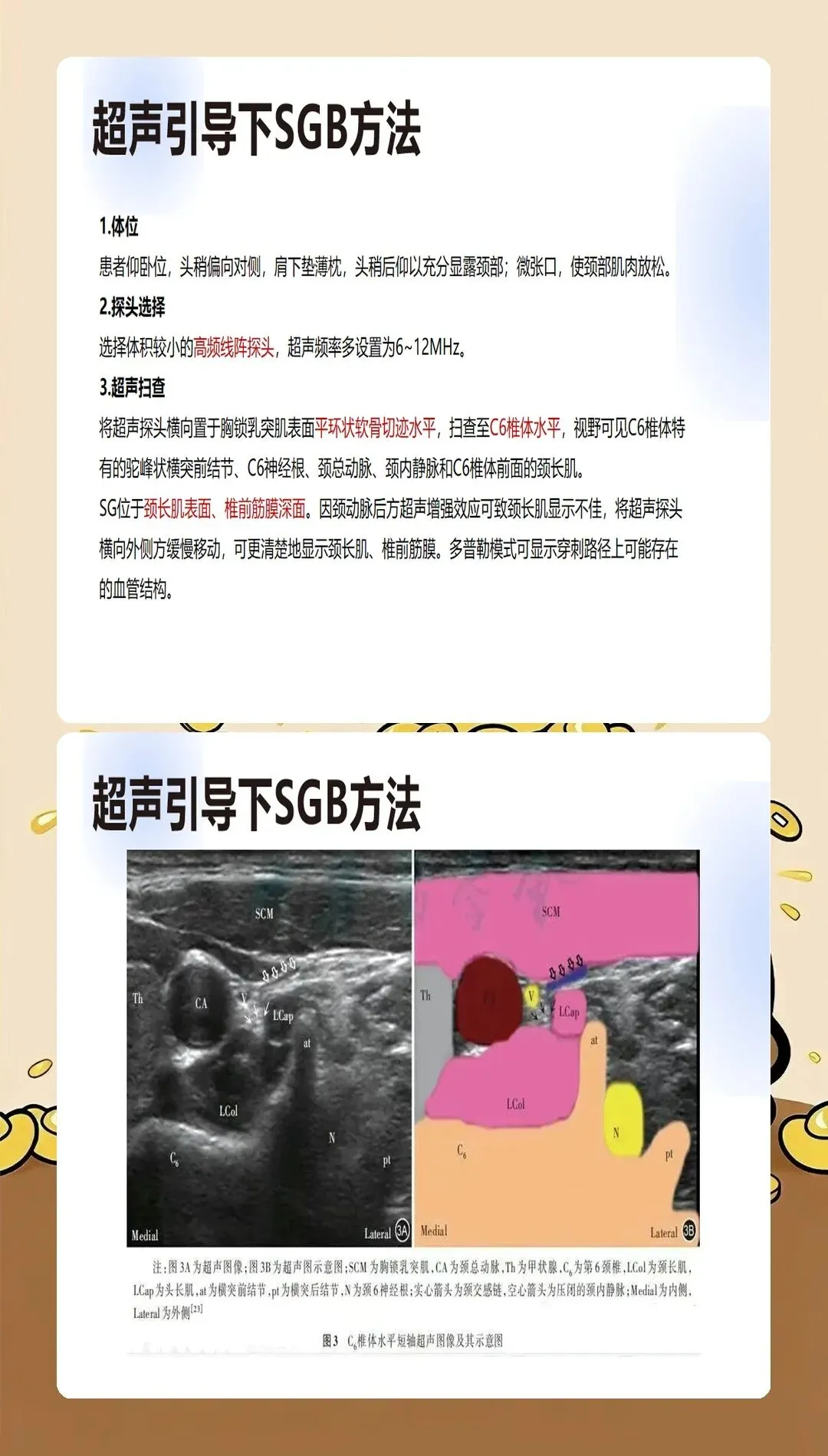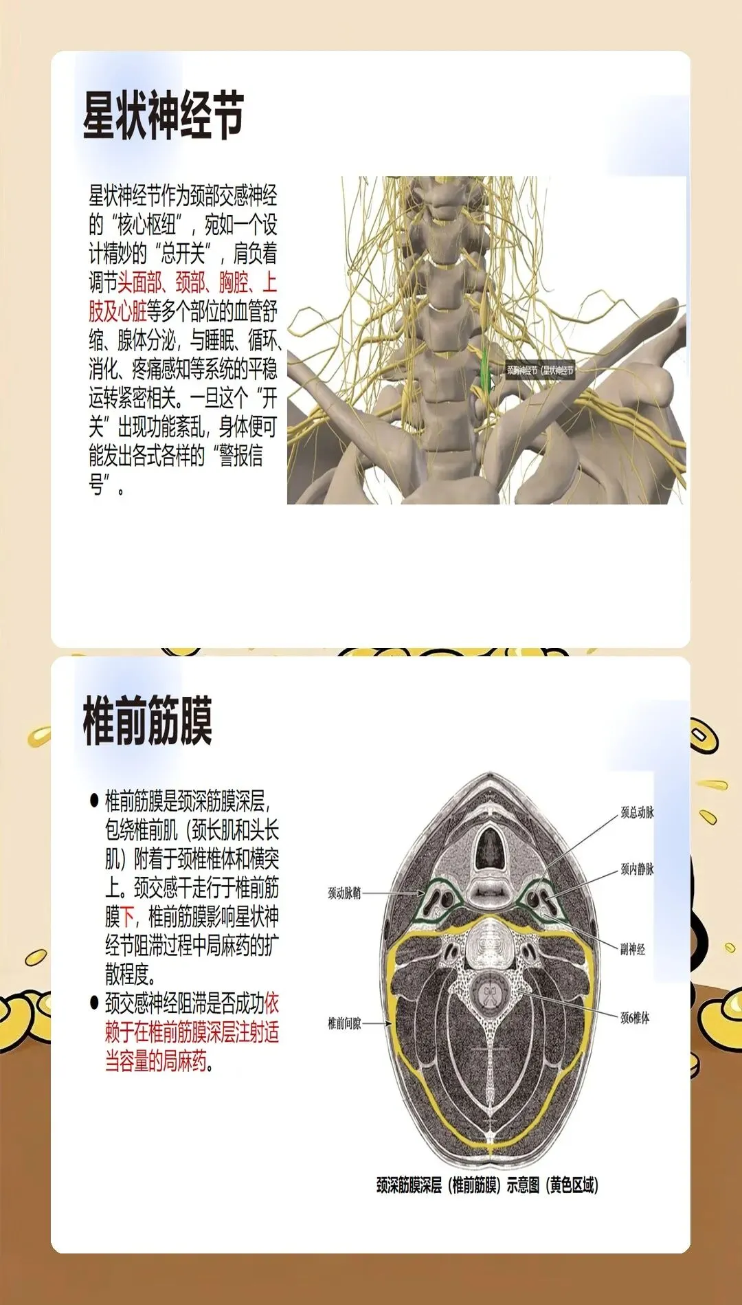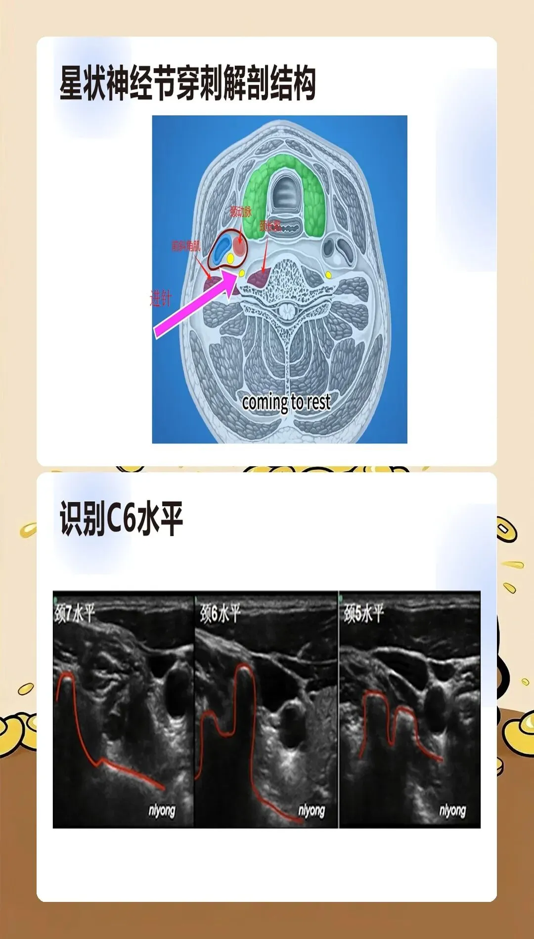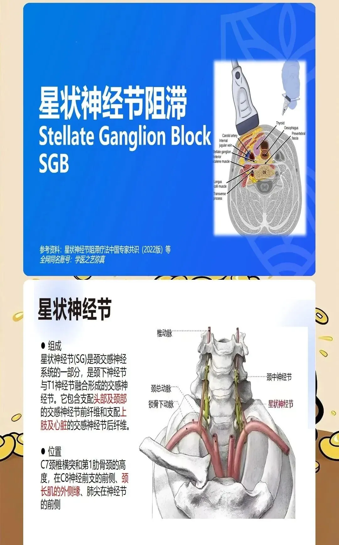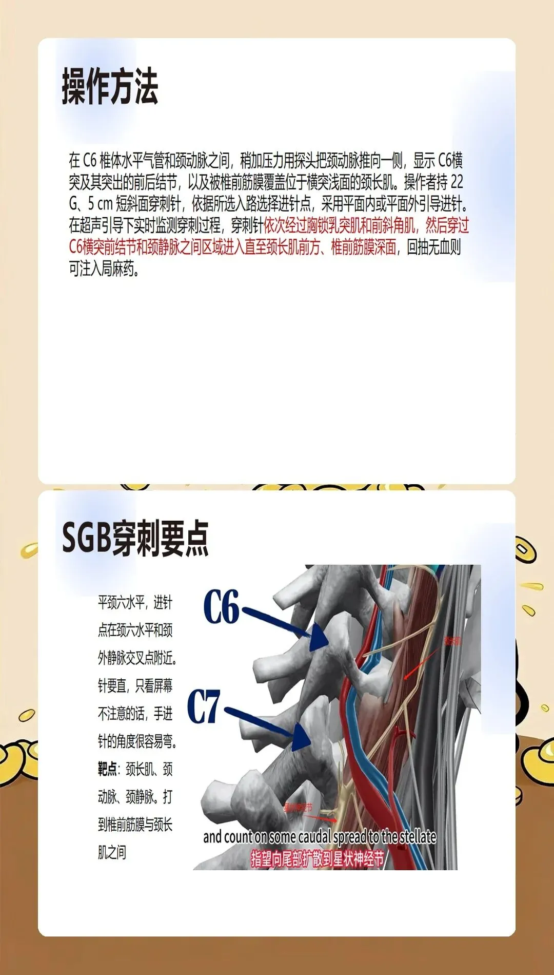 星状神经节位于第7颈椎横突基底部前方至第1肋颈前方的间隙中,解剖位置的精准掌握是操作成功的基础。我们要求术者必须熟练掌握C6和C7两种入路的解剖特点:C6入路穿刺点位于环状软骨水平,胸锁乳突肌后缘;C7入路穿刺点位于第7颈椎横突,位置较深但阻滞效果更确切。关键是要根据患者的解剖特征和临床需求选择合适的入路。