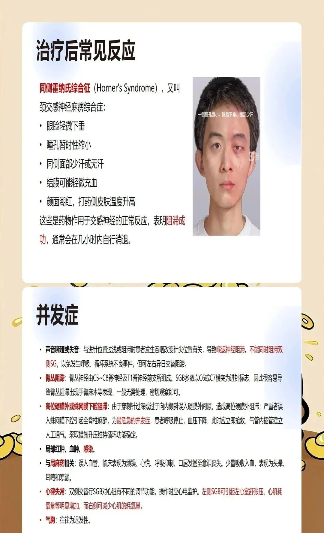 霍纳综合征是星状神经节阻滞成功的标志,但对部分患者可能造成不适。我们要求术前充分告知患者可能出现的表现:眼睑下垂、瞳孔缩小、眼球内陷、面部无汗等。对于需要工作的患者,特别是需要精细操作的人群,要合理安排治疗时间,避免影响工作。同时要鉴别真正的霍纳综合征与药物扩散导致的眼部症状。