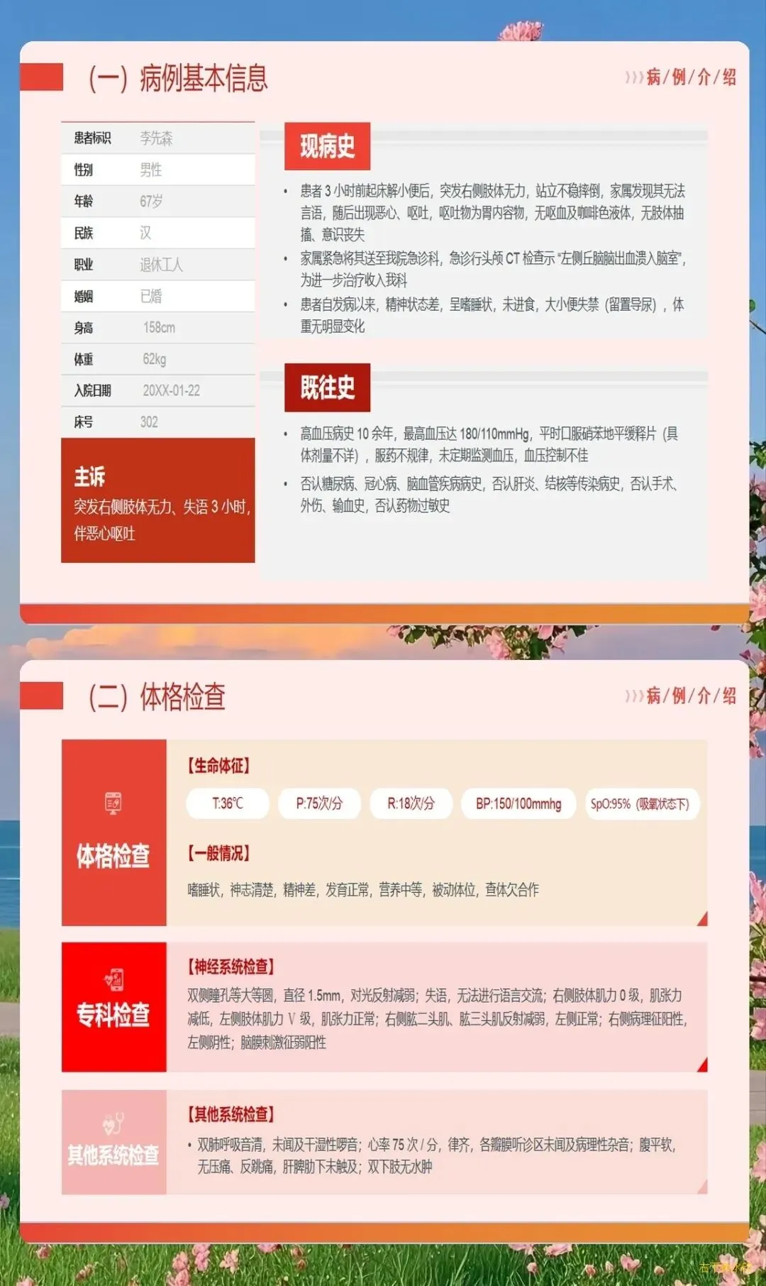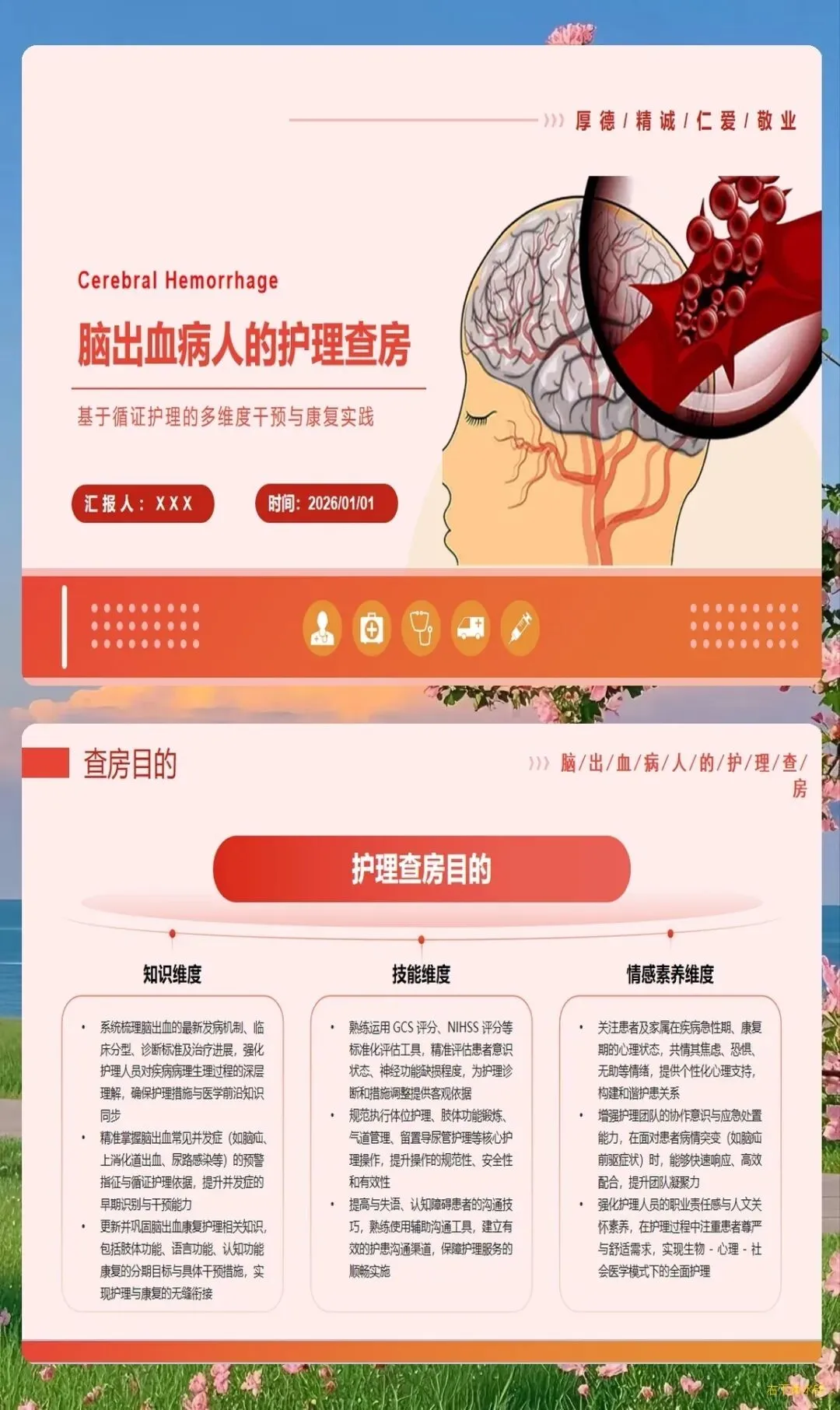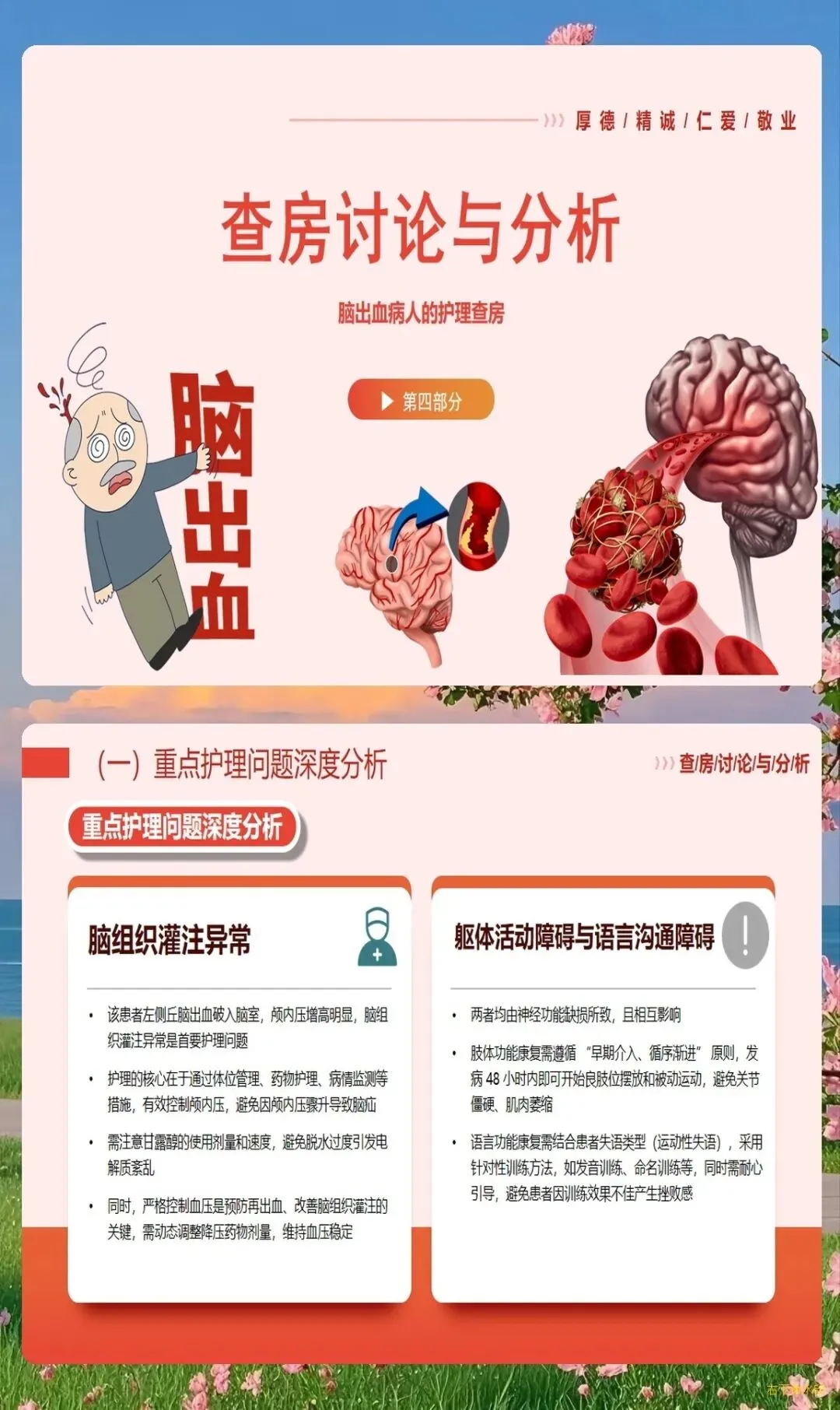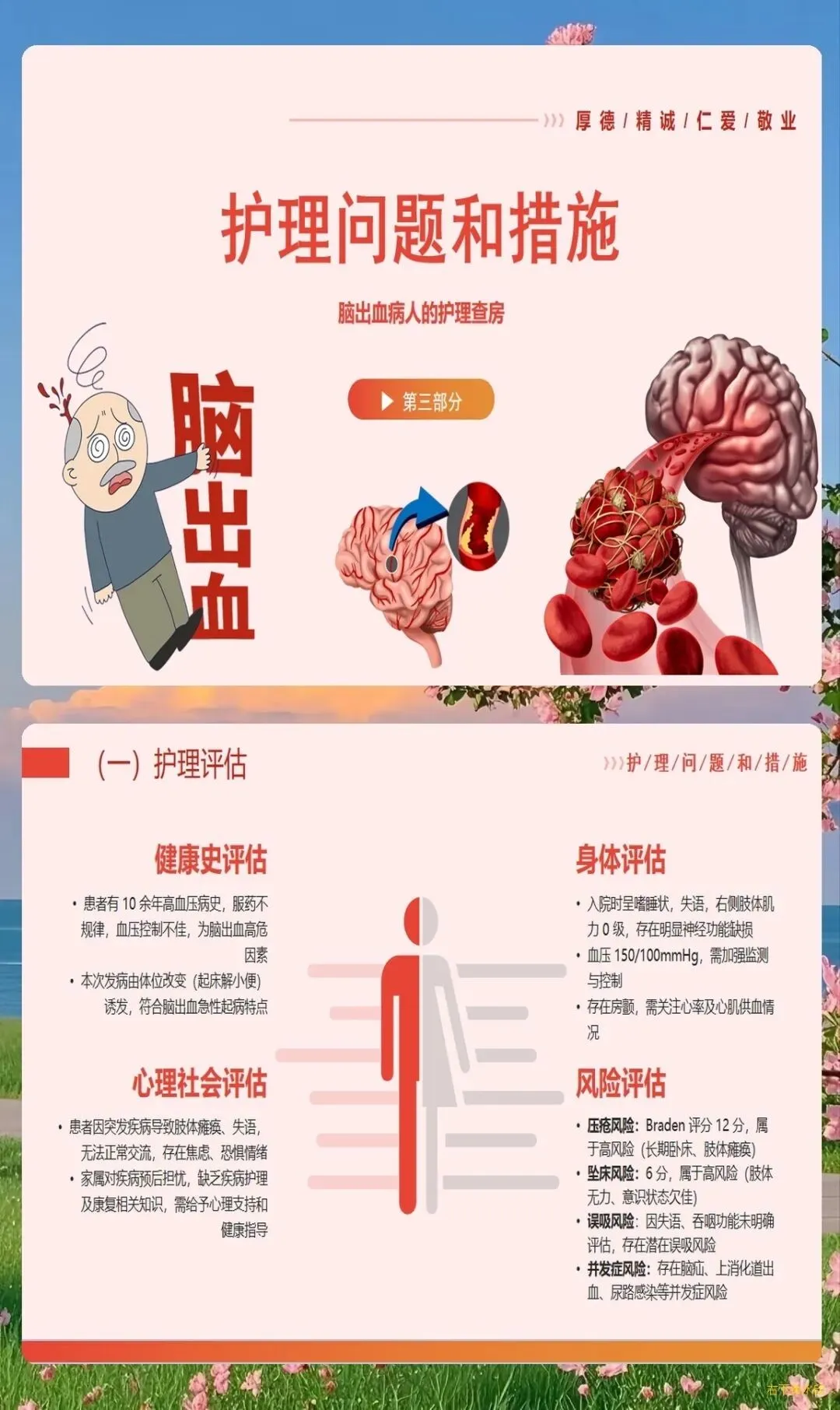 脑出血作为神经外科常见的急危重症,具有发病急、病情重、变化快、并发症多等特点,对护理工作提出了极高要求。护理查房作为提升护理质量的重要手段,能够系统性地梳理护理问题,制定科学干预方案,促进患者康复。一、病情评估的全面性与系统性
