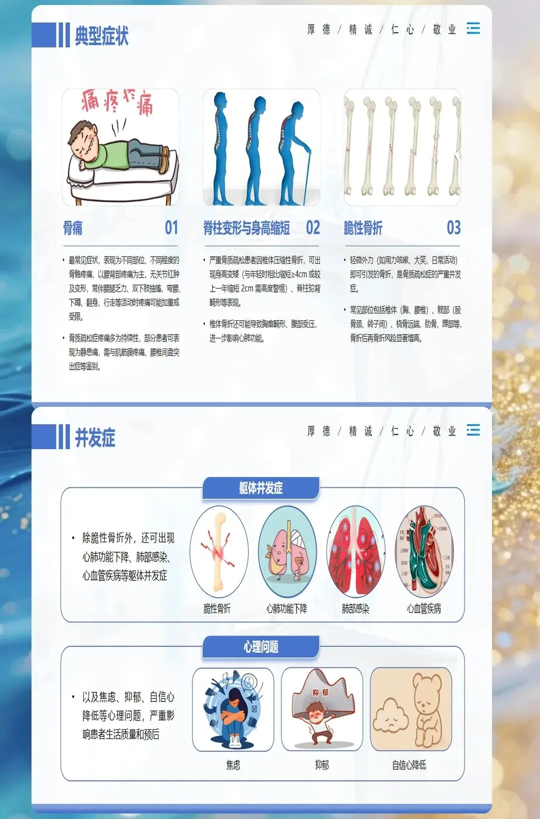 骨质疏松症早期常无明显症状,被称为"静悄悄的流行病"。当患者出现身高缩短、驼背、腰背疼痛等临床表现时,往往已经发展到较为严重的阶段。因此,早期识别和诊断对于预防骨折并发症至关重要。