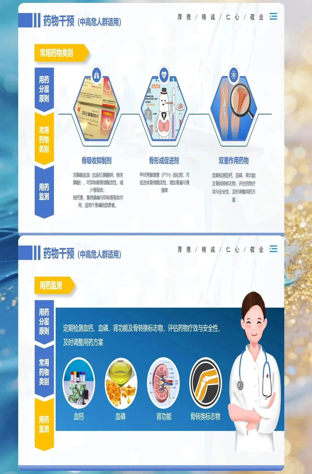 在用药过程中,要密切监测患者的血钙、血磷、肾功能等指标,观察药物不良反应。双膦酸盐类药物可能导致食管炎、下颌骨坏死等不良反应,用药时应严格遵循用药指导,服药后保持直立位至少30分钟。