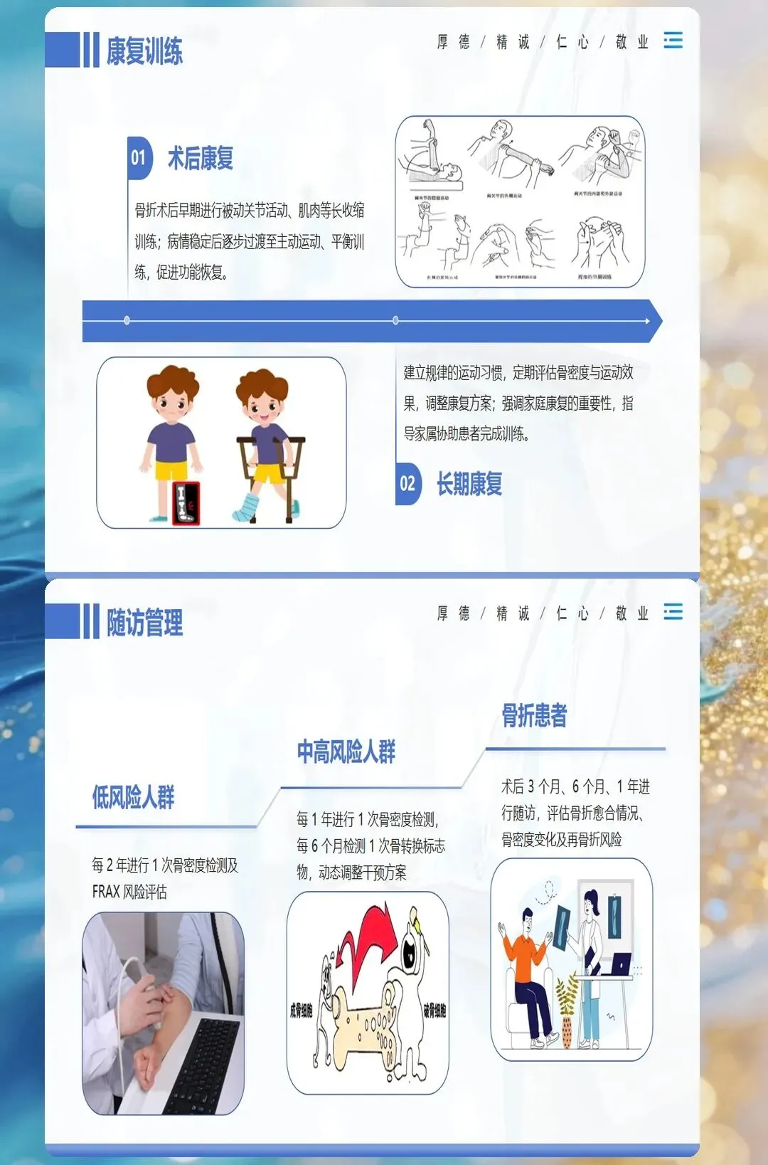 骨质疏松性骨折常见部位包括椎体、髋部、桡骨远端和肱骨近端,其中髋部骨折和椎体骨折危害最大。骨折患者需要手术治疗、康复训练和抗骨质疏松治疗三位一体的综合管理。
