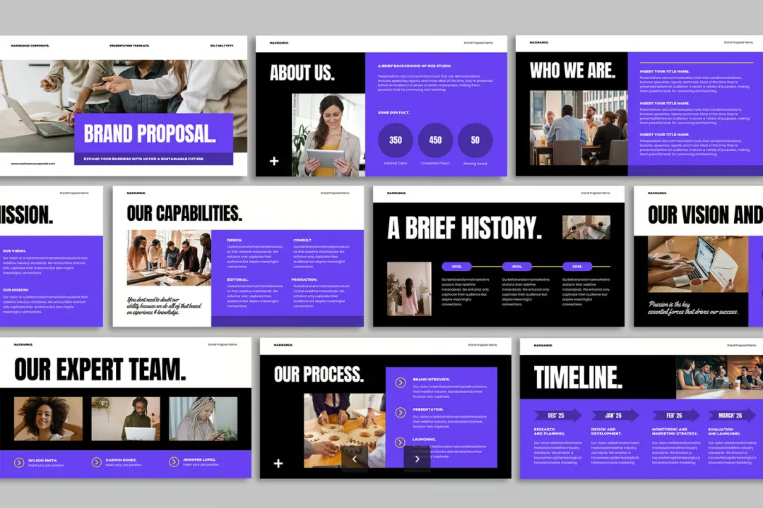 模块传送门:https://www.gooodme.com/58082.html第三款:G7316 高端商务提案PPT模板创意极简现代风30页可编辑企业演示文稿免费字体Brand Proposal – PowerPoint Template高端商务提案PPT模板采用极简与现代风格,创新设计涵盖三十页独特创意幻灯片,适用于企业各类场景演示。整体排版以主控幻灯片为基础,结构清晰,便于快速定制修改。所有矢量图形均可完全编辑,自由调整内容和配色,无需担心兼容性难题。此外,模板所用字体为推荐免费网络字体,无需额外购买授权,即可安心商用。