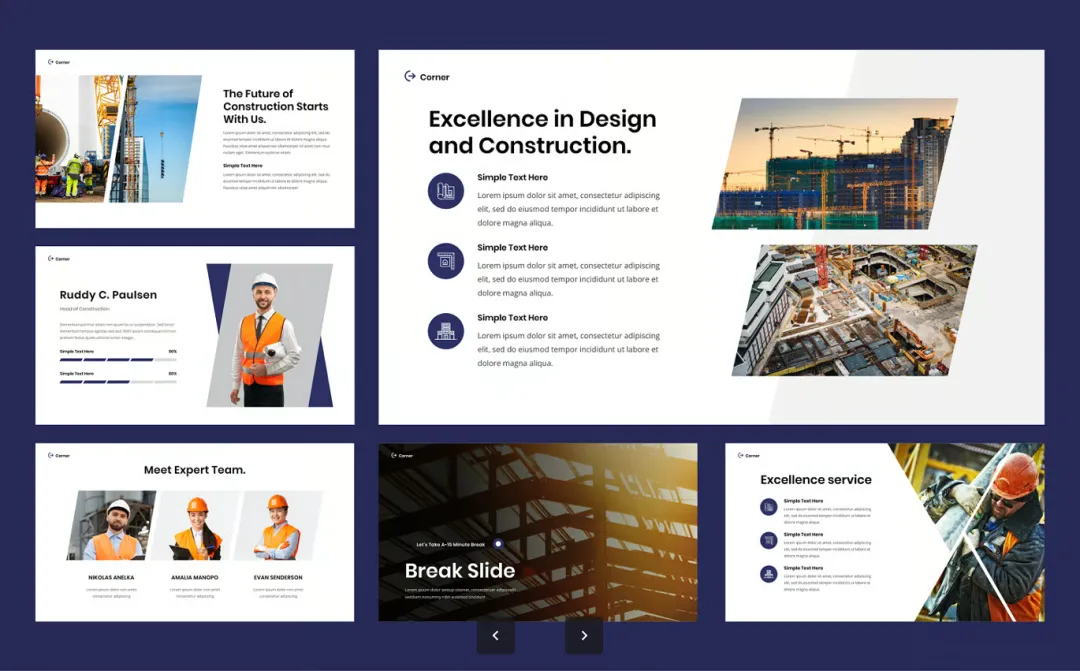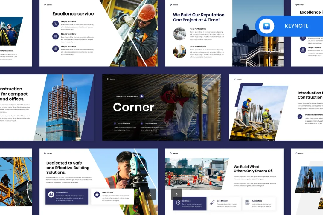 第四款:G7203 高端商务PPT模板24页创意企业汇报科技风毕业设计答辩工作总结幻灯片Corner – Construction Keynote Template本套高端商务PPT模板共包含24页独特创意设计,整体风格科技现代,适用于企业汇报、毕业答辩、工作总结等多种场合。支持多行业应用,无论是企业宣传、创业项目展示、数字化转型还是个人作品集均可胜任。内置超过500个图标元素,全套图形支持自由缩放和编辑,并采用主控幻灯片结构,便于统一管理和快速修改。页面比例为16:9宽屏格式,预设图片占位符,只需拖拽图片即可轻松替换所有内容,极大提升制作效率。