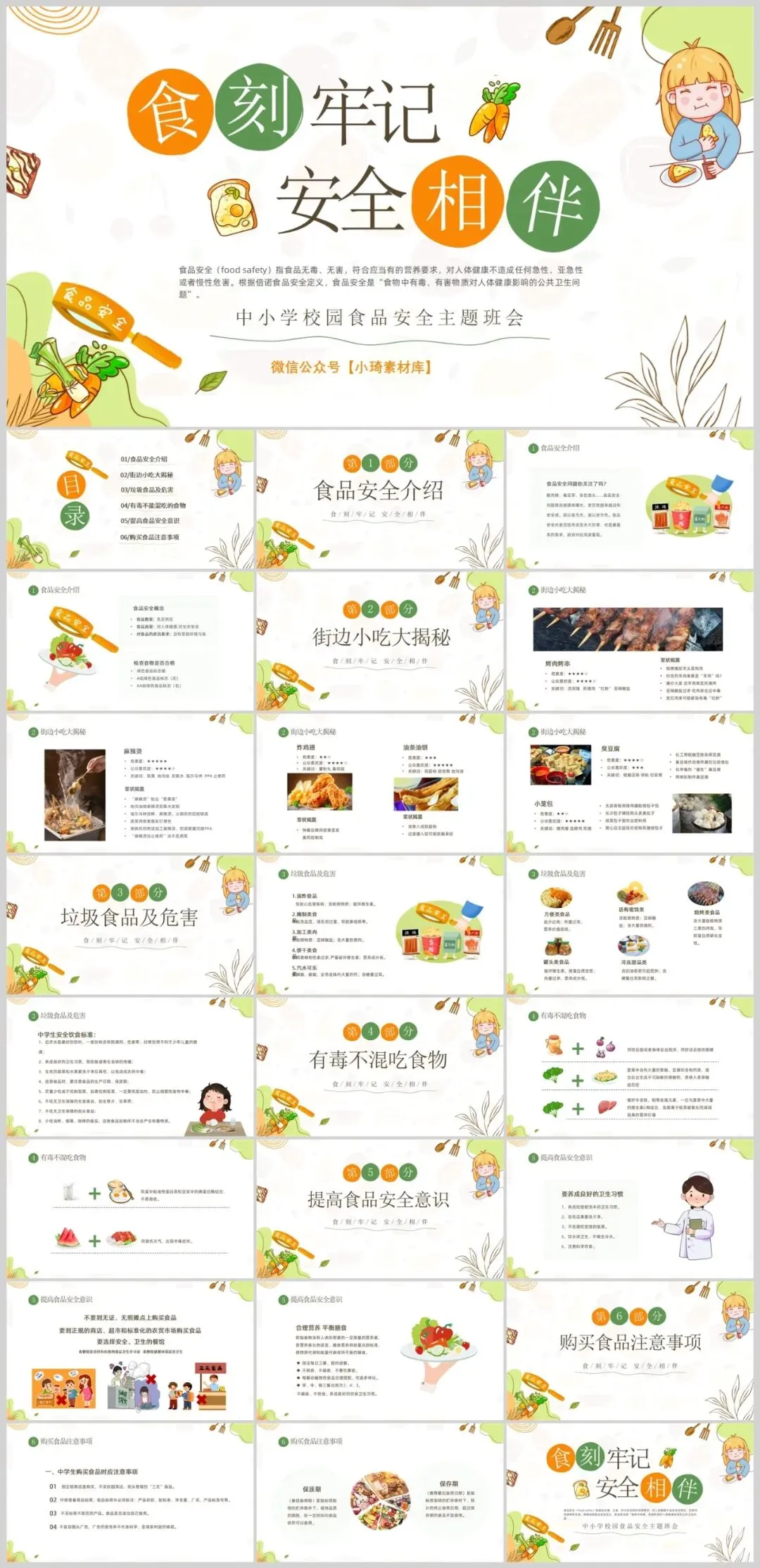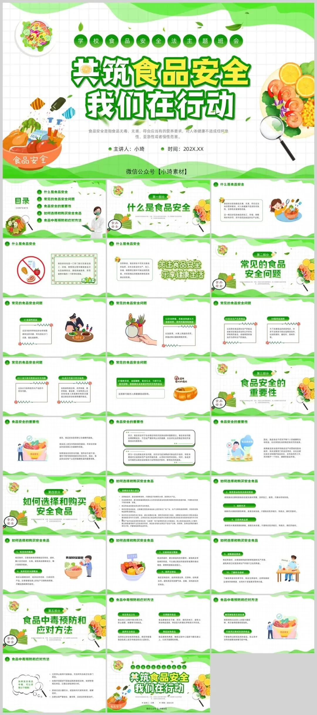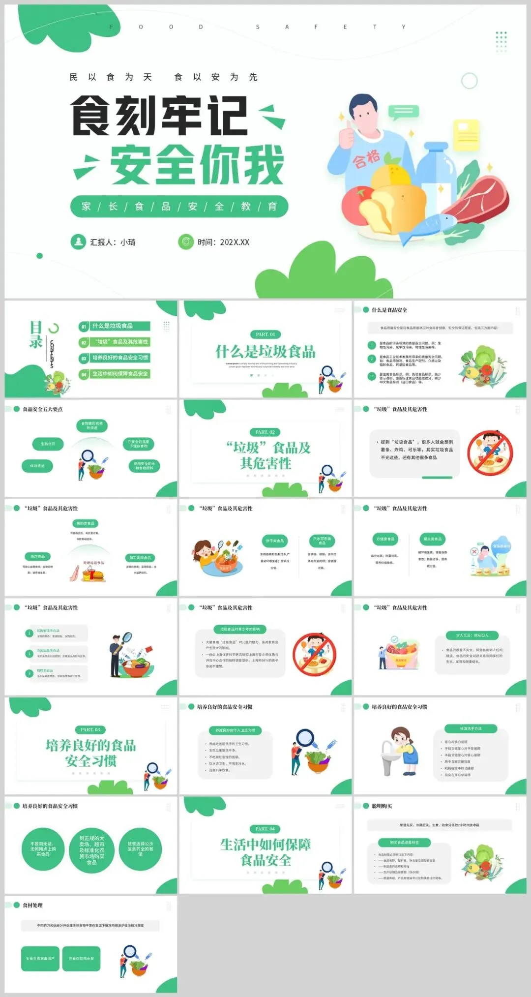 这款食品安全主题PPT模板采用绿色作为主色调,以可爱卡通的设计风格吸引观众的注意力。
