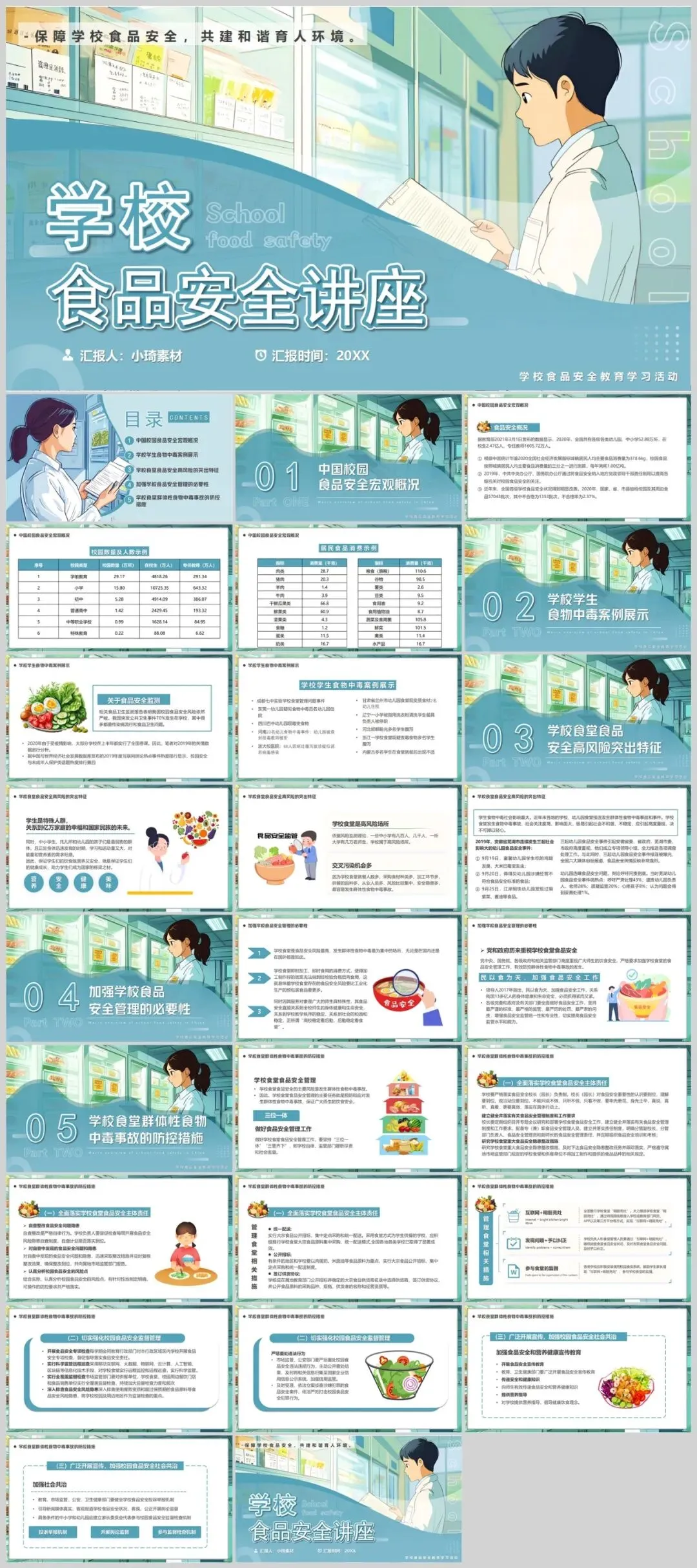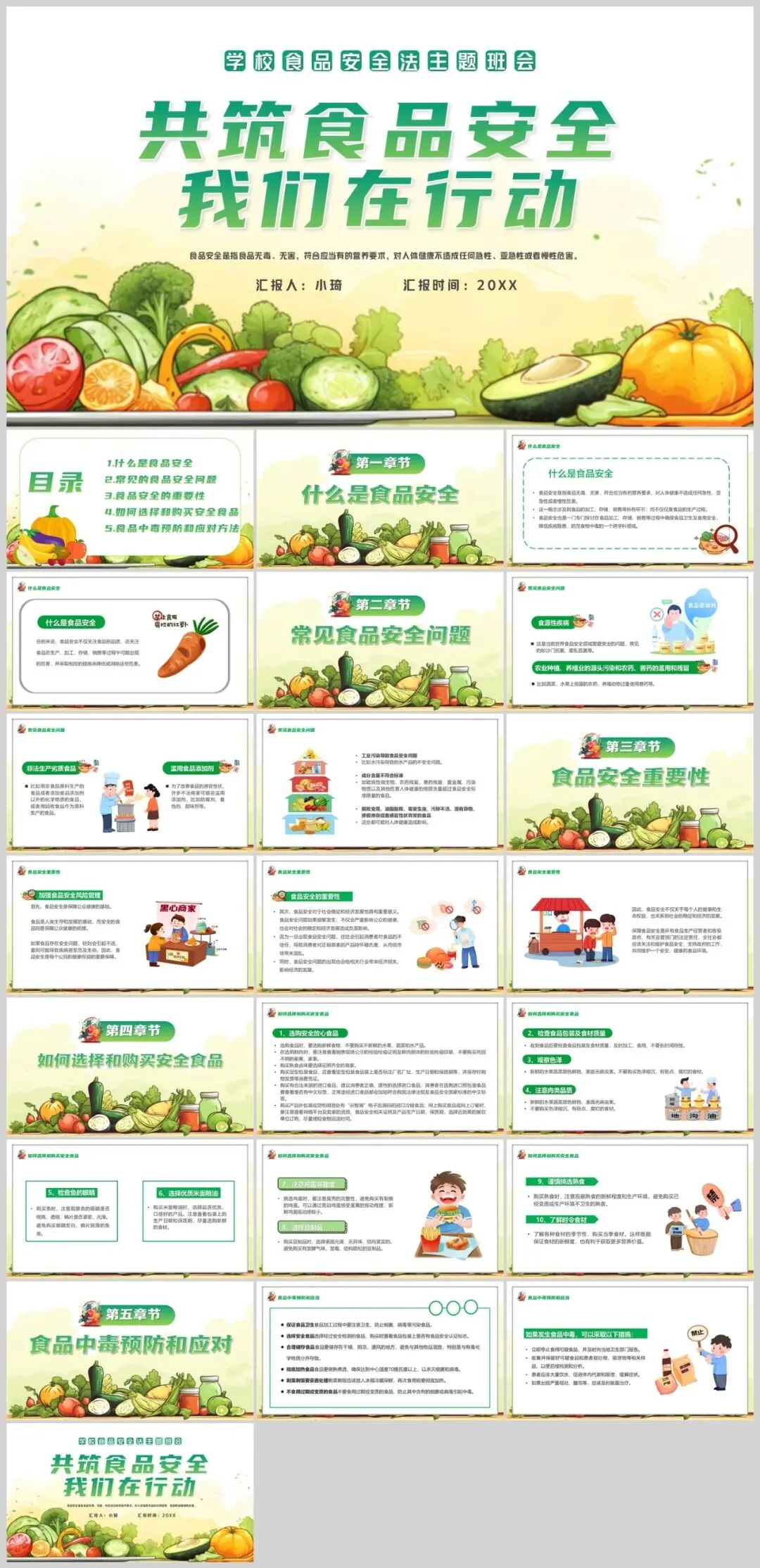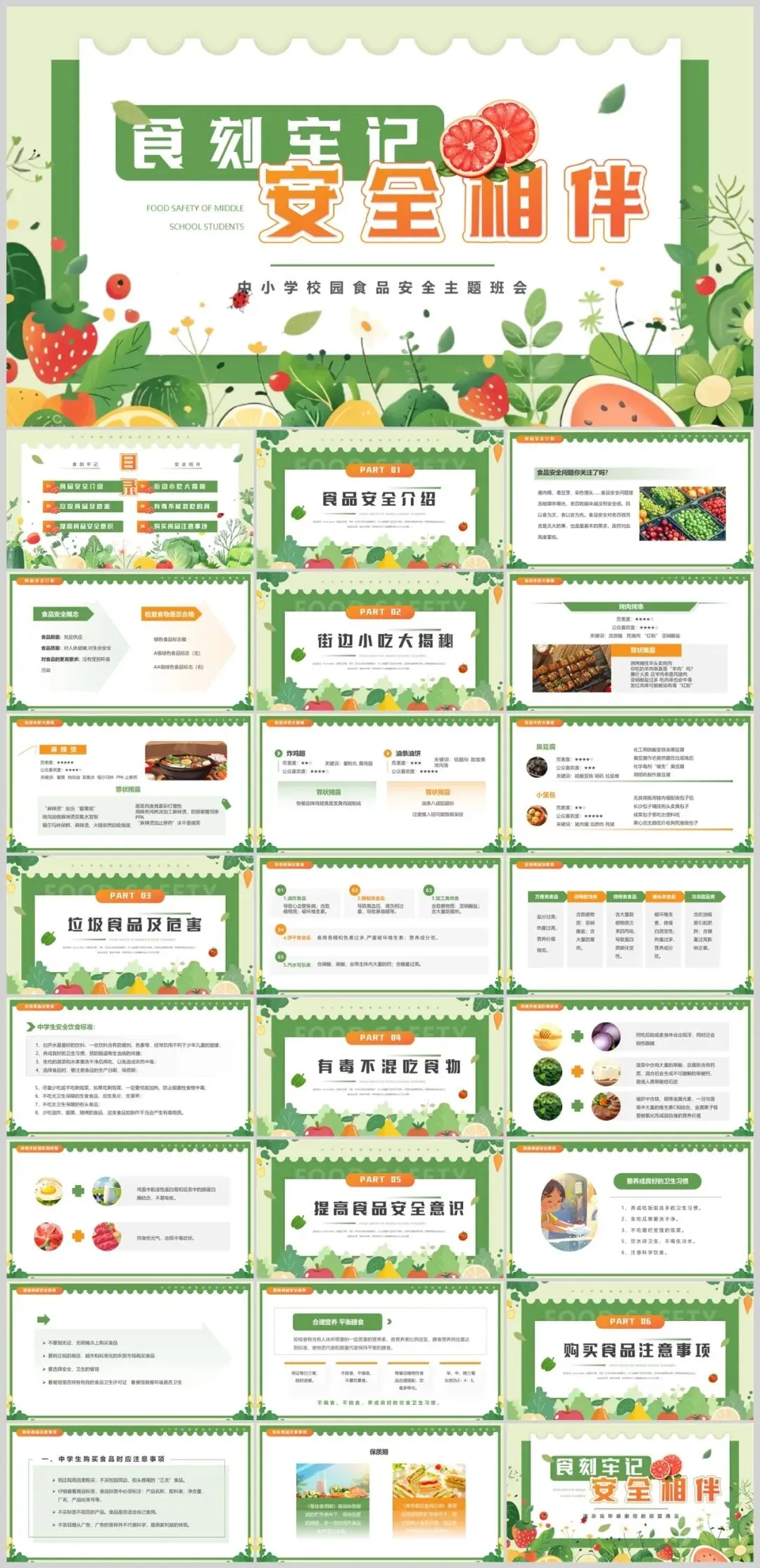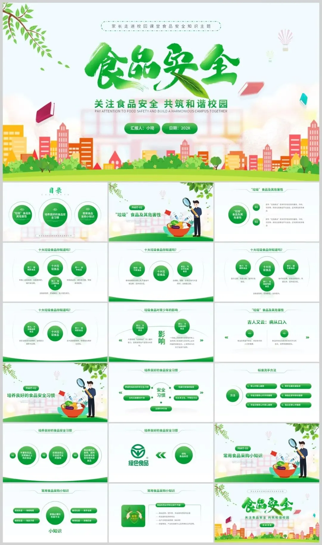 这款食品安全主题PPT模板采用绿色作为主色调,以可爱卡通的设计风格吸引观众的注意力。