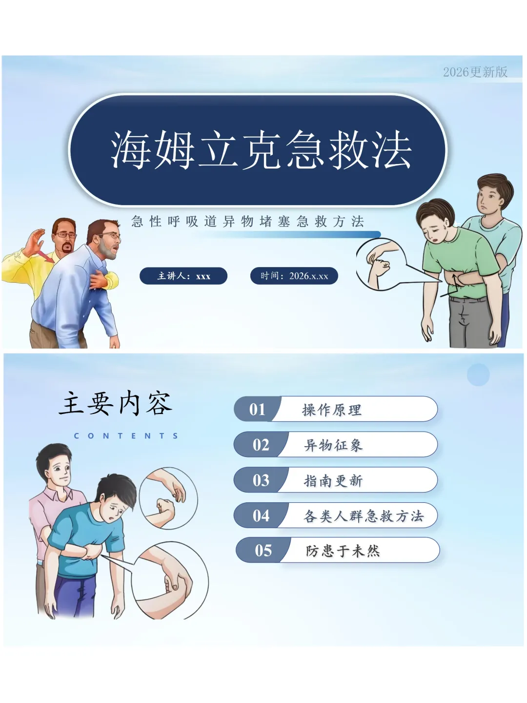 大家好,今天咱们重点讲一讲 2026 更新版的海姆立克急救法,这是一套能在气道异物梗阻时救命的方法,每个人都该掌握。首先要明确,气道异物梗阻是非常紧急的情况,完全性梗塞可能在几秒到几分钟内让人意识丧失甚至死亡,识别症状是第一步。