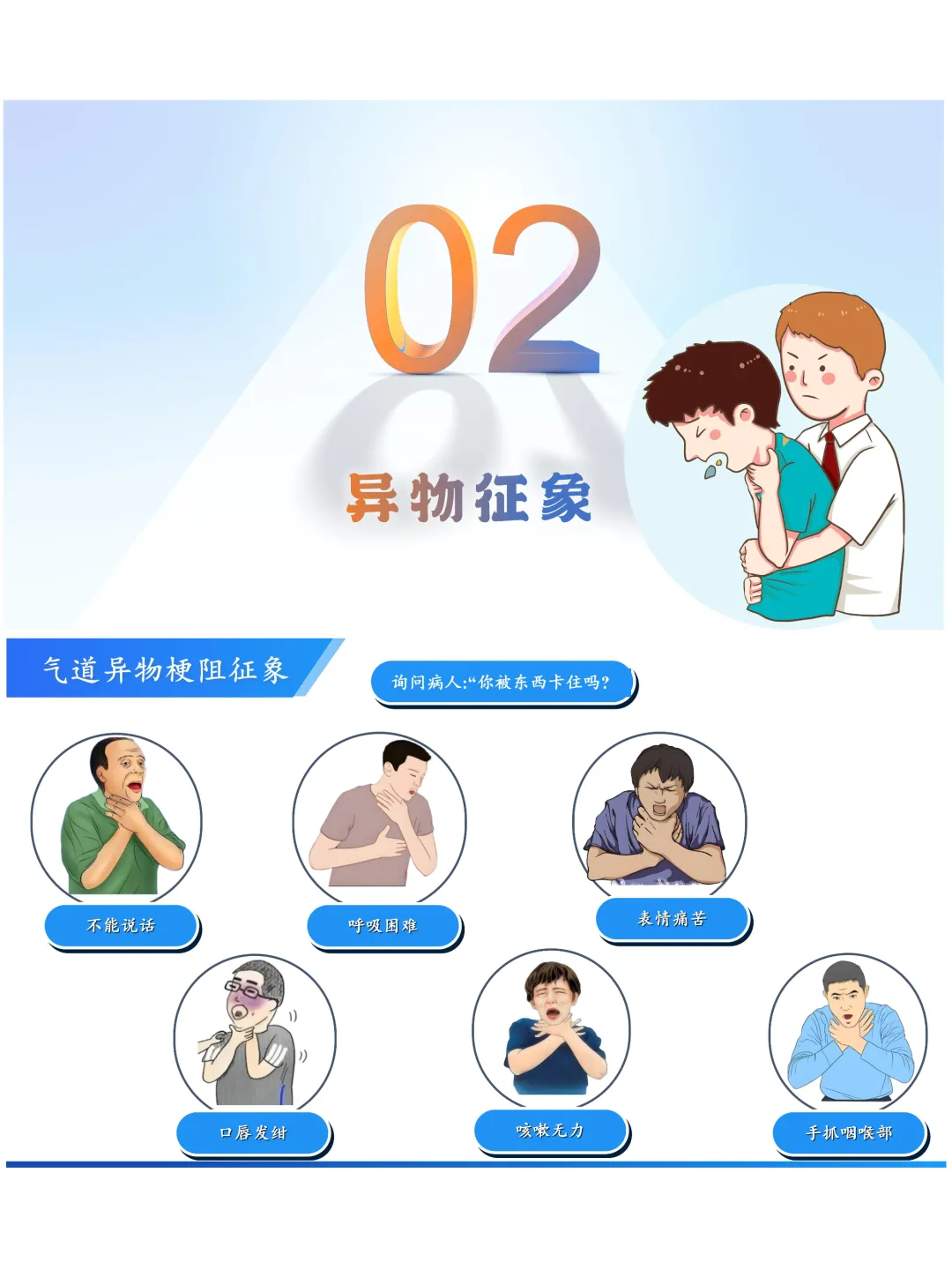 大家要记住这些典型征象:患者无法说话、呼吸困难,会不自觉用手抓咽喉部,表情痛苦、咳嗽无力,口唇还会发紫,这时上前问一句 “你被东西卡住吗?”,得到确认就立刻施救。