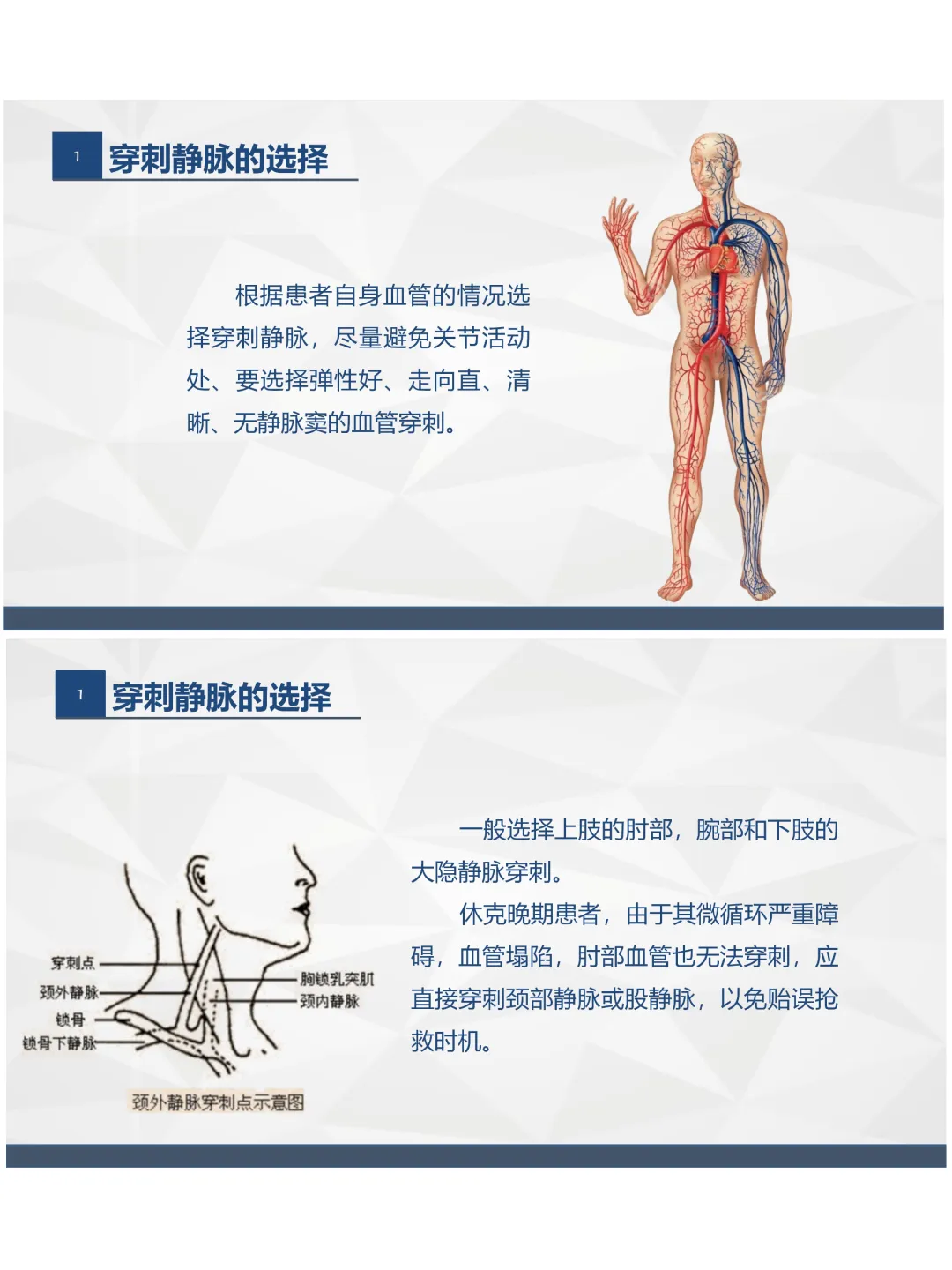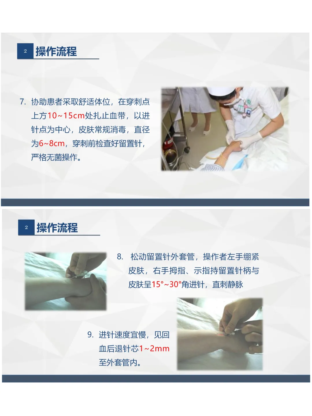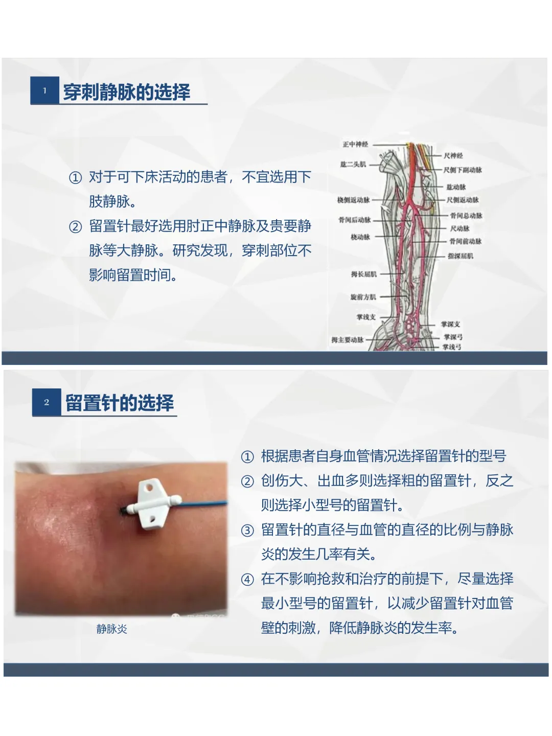 接下来是穿刺和操作的关键步骤。选血管要避开关节,优先选上肢肘部、腕部的弹性好、无静脉窦的大血管,下床患者尽量不用下肢静脉,休克晚期患者可直接选颈部或股静脉。留置针型号要匹配血管,在不影响治疗的前提下选最小型号,能降低静脉炎风险。操作时严格无菌,扎止血带、消毒、进针角度都有标准,见回血后送管、拔针芯、固定,每一步都不能马虎。