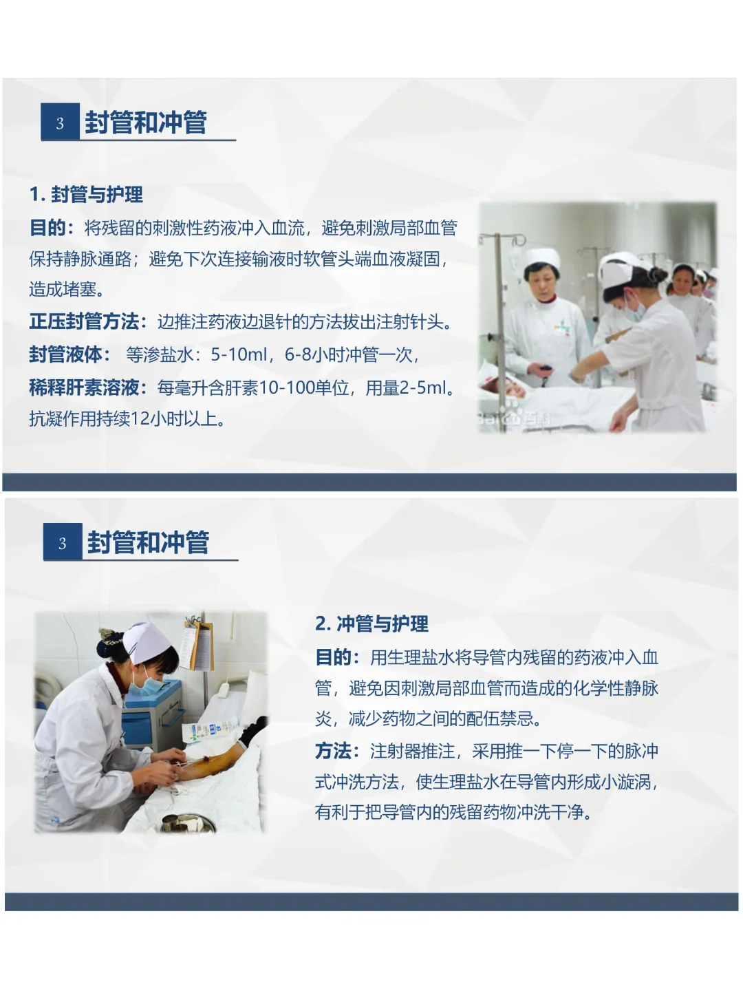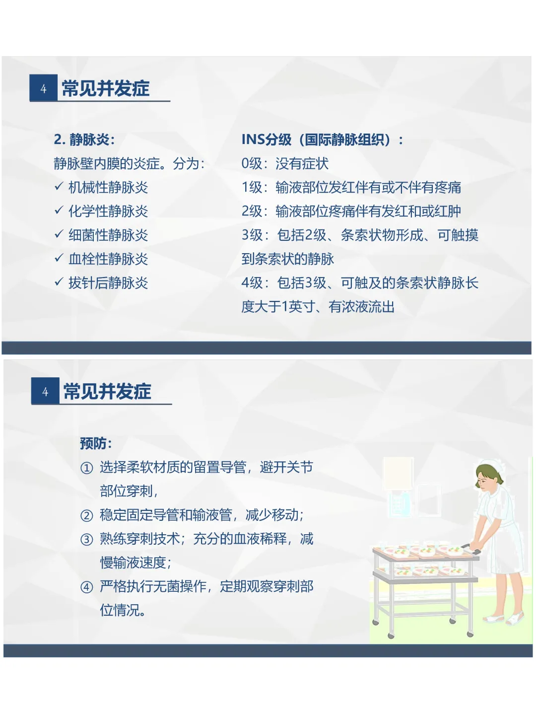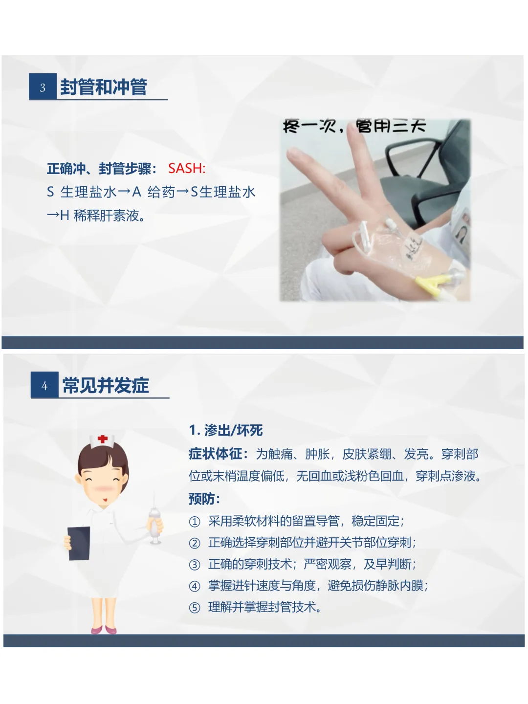 维护的核心是冲管和封管,这是防止堵管和静脉炎的关键。冲管用脉冲式方法,让生理盐水形成漩涡冲净残留药液;封管要正压,边推药边拔针,常用等渗盐水或稀释肝素液,还能遵循 SASH 步骤,确保管路通畅。同时咱们要警惕渗出、静脉炎、导管堵塞这些并发症,做好预防和早期识别,比如静脉炎按 INS 分级判断,及时采取处理措施。