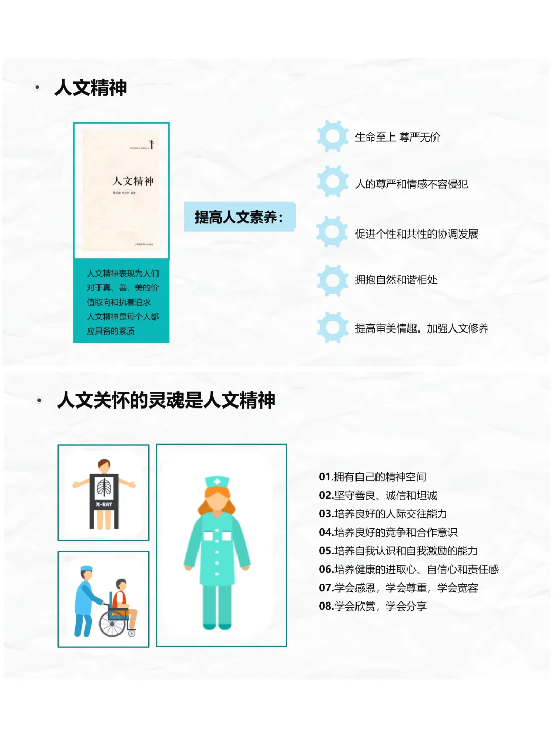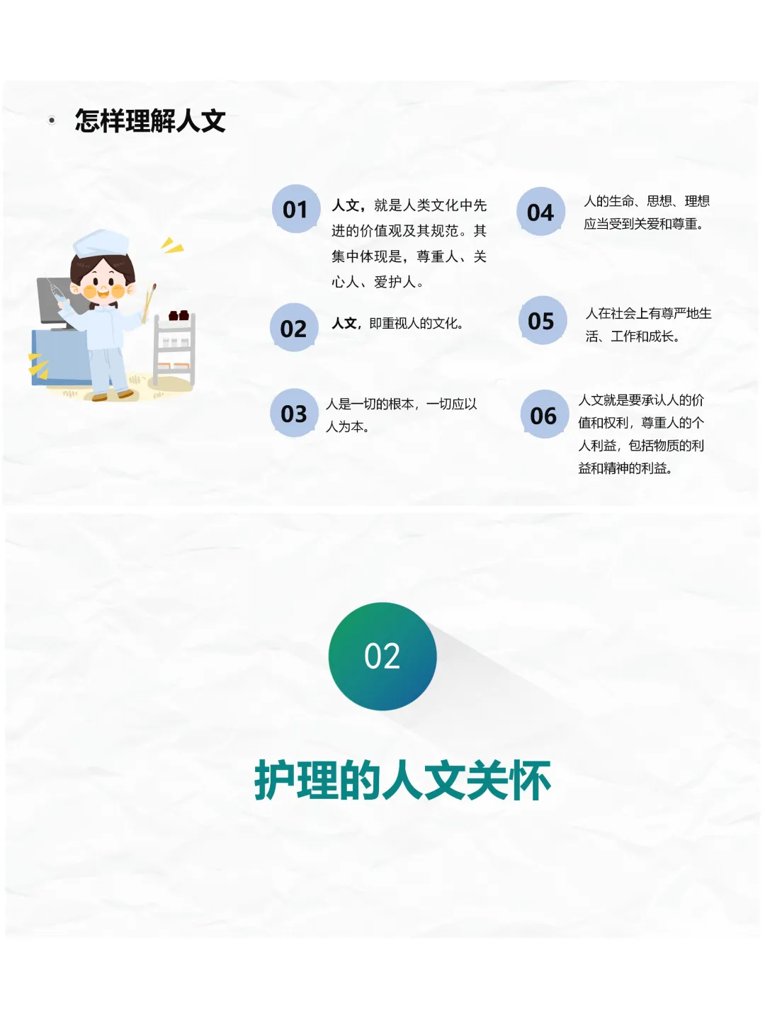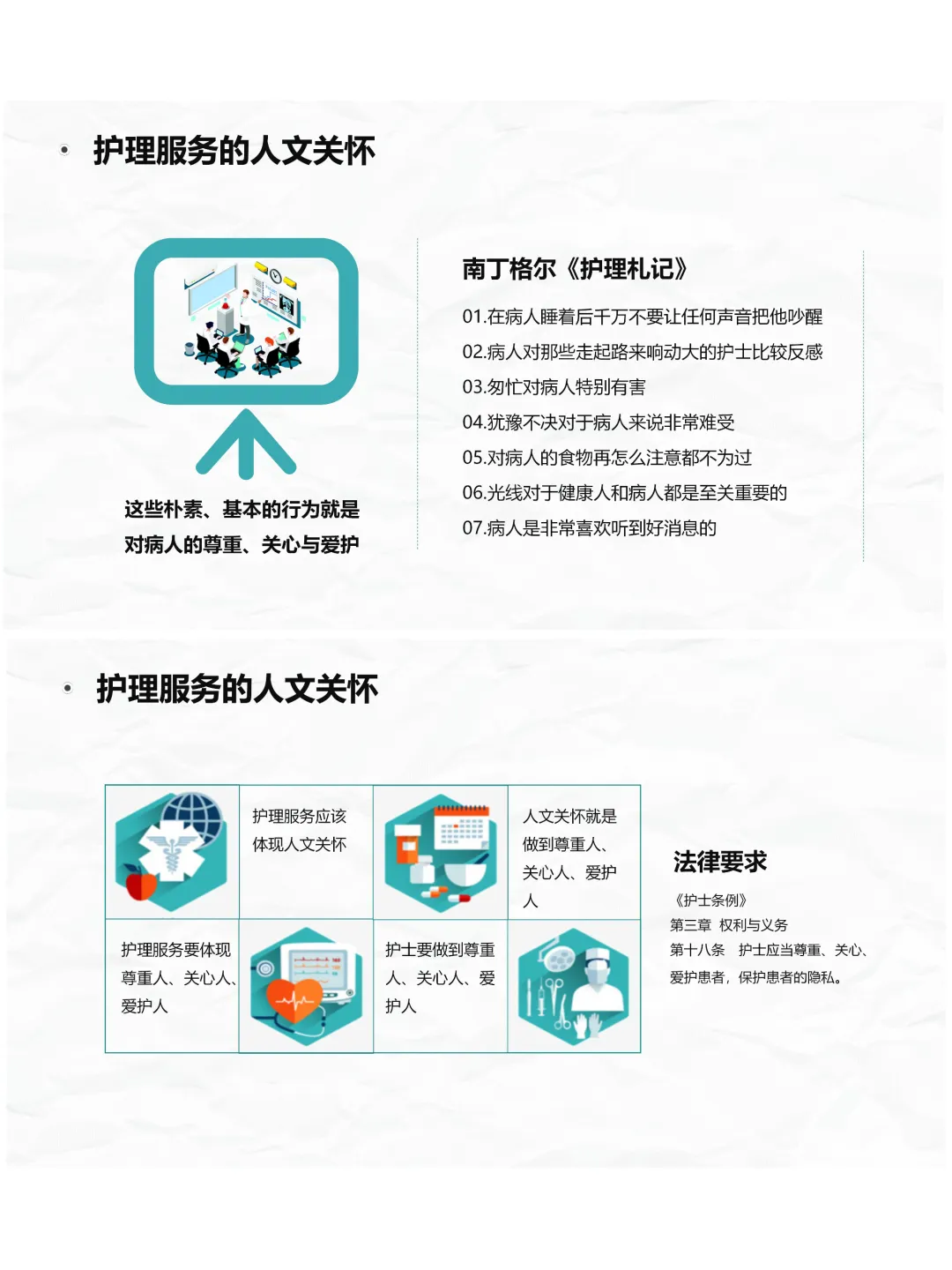 大家好,今天咱们来聊聊护理人文关怀,这是护理工作的灵魂,南丁格尔的护理札记里就强调,朴素的细节关怀就是对患者最好的尊重,而新时代的护理人文关怀,不仅要温暖患者,也要关照咱们护士自身。首先咱们要明白,人文关怀的核心就是关注人的生存与发展,尊重人、关心人、爱护人,承认人的价值和权利,这也是《护士条例》对咱们的法律要求。