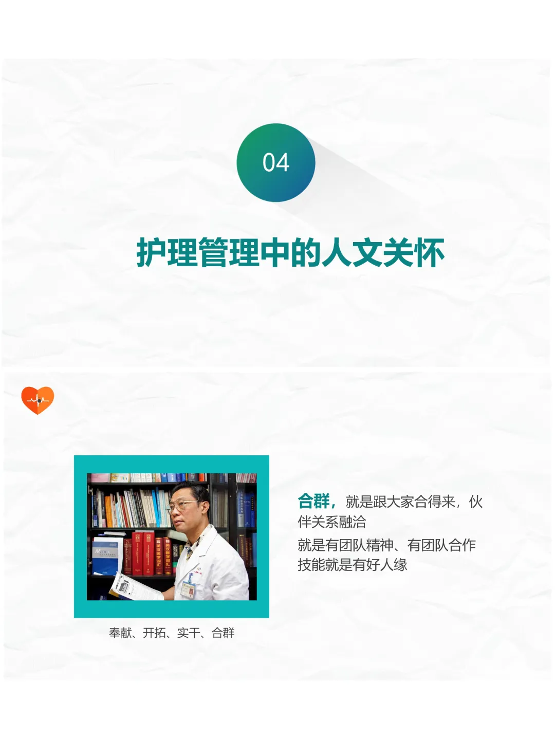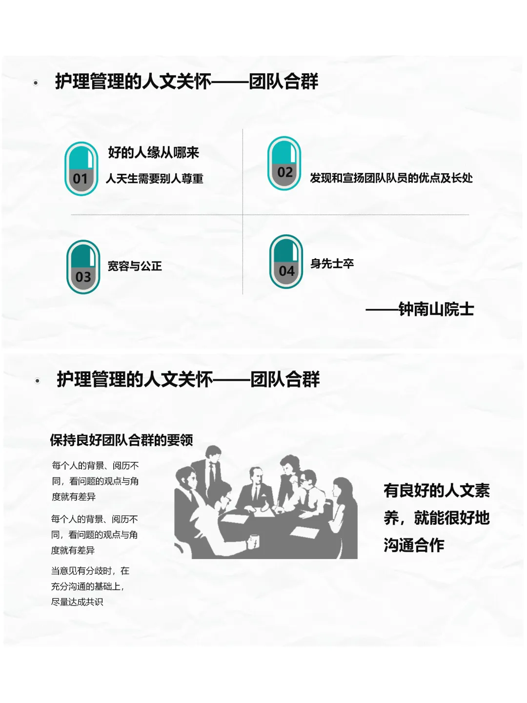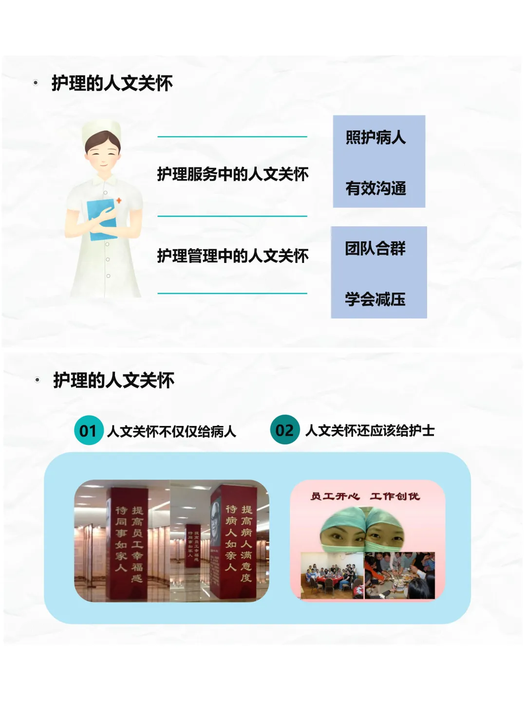同时咱们要记住,人文关怀不仅仅给病人,还应该给护士。护理工作压力大,护理管理中的人文关怀同样重要,首先是培养团队合群的意识,也就是团队精神。好的团队关系,需要尊重每一位成员,发现同事的优点,做到宽容公正,身先士卒,面对分歧时学会包容,从别人的角度看问题,让团队沟通更顺畅,合作更高效。