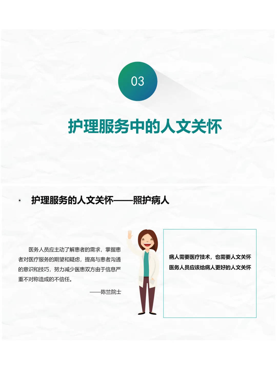 其实护理的本源就是人文关怀,咱们护士用专业和温暖对待患者,医院和团队用人文关怀关照护士,双向的温暖才能让护理工作更有温度。提升自身的人文素养,坚守善良诚信,学会感恩宽容,让人文精神融入每一次护理操作、每一次沟通交流,这就是咱们做好护理人文关怀的核心。