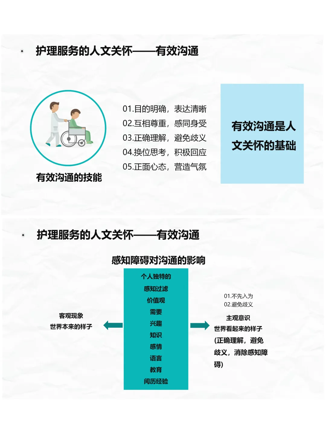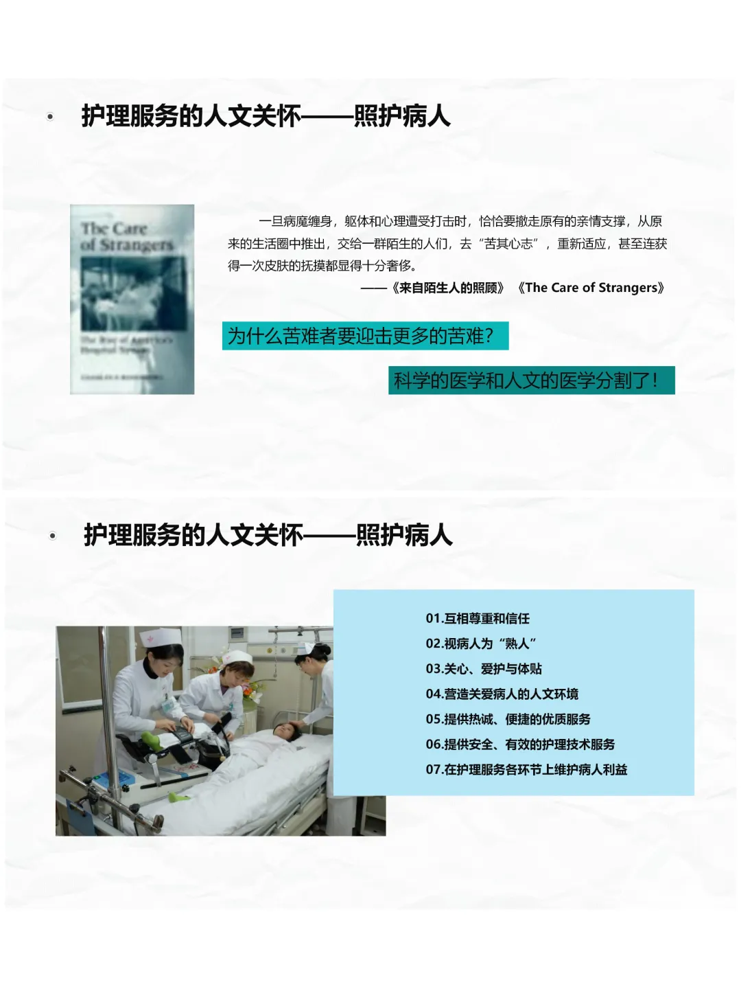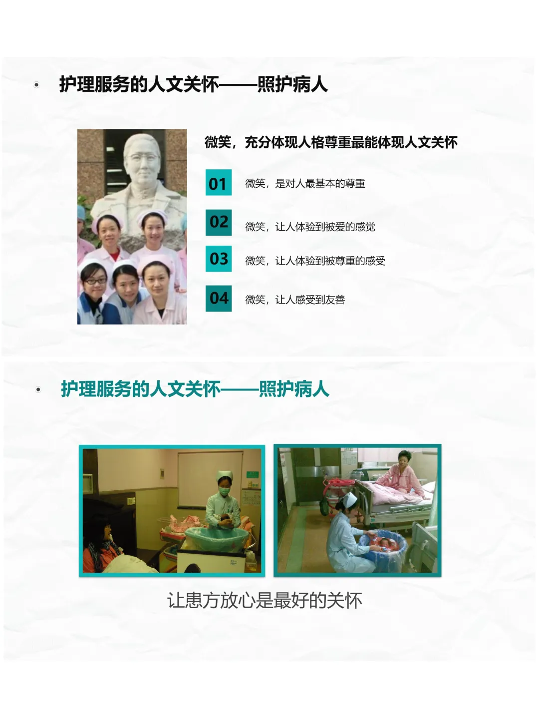 护理的人文关怀,首先体现在对患者的照护上。患者生病时,躯体和心理都承受着打击,咱们不仅要提供专业的护理技术,更要给他们情感上的关怀。比如做到微笑服务,把患者当 “熟人”,互相尊重信任,关心体贴他们的需求,营造温暖的就医环境,在每个护理环节维护患者利益,让患方放心,这就是最实在的关怀。而有效沟通是人文关怀的基础,沟通时要目的明确、表达清晰,换位思考、感同身受,避免感知障碍造成的歧义,用真诚的交流拉近距离。