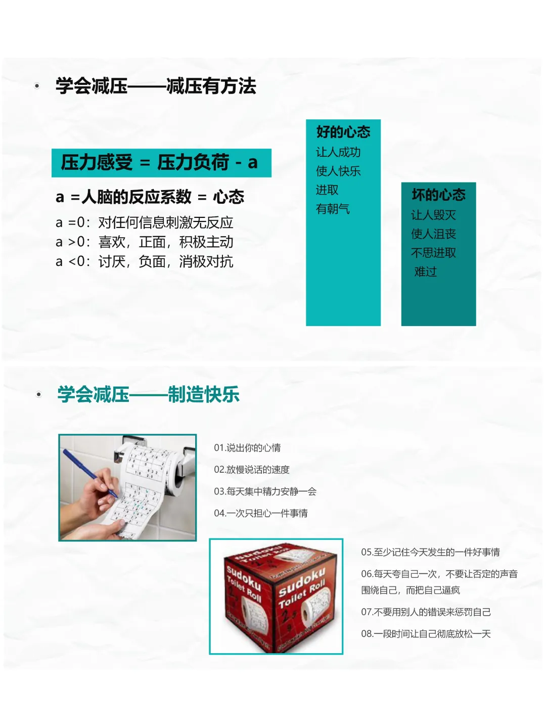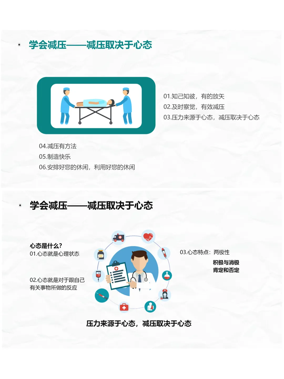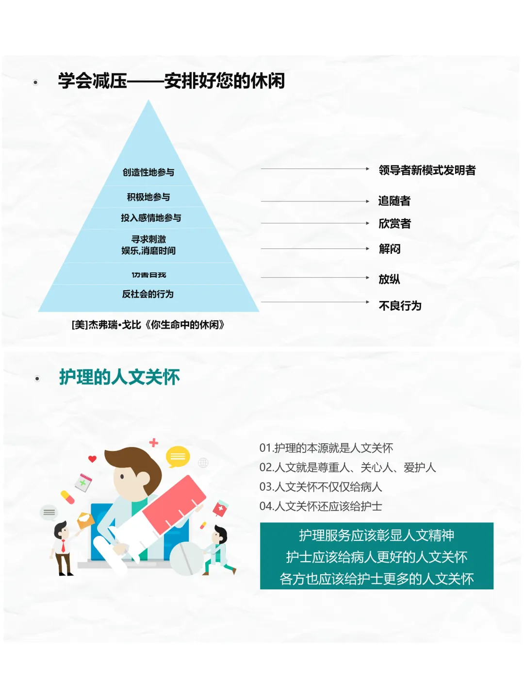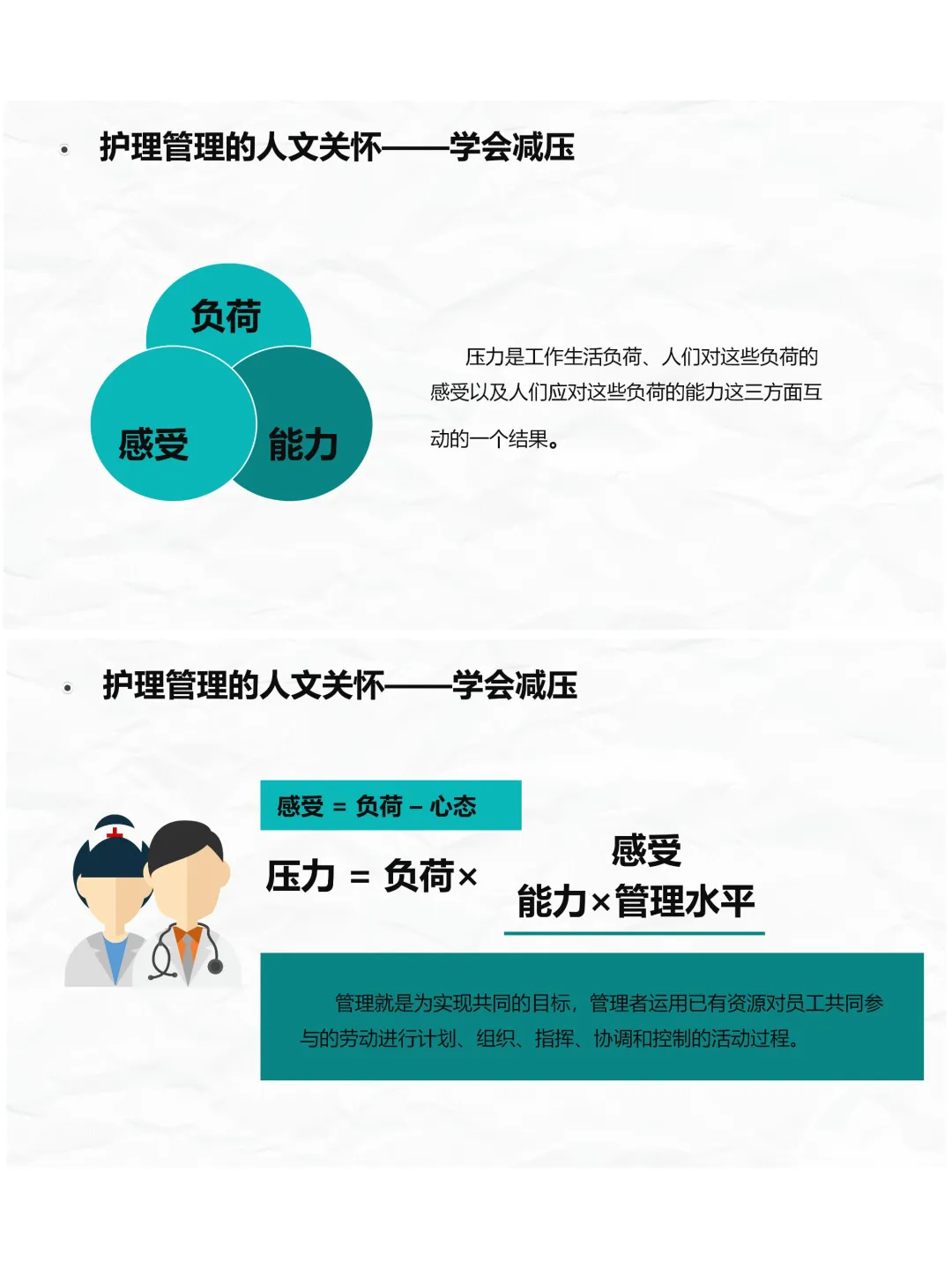 再者是学会减压,这是护理管理人文关怀的重要部分。压力是负荷、感受和能力的互动结果,而减压的关键在于心态。咱们要及时察觉自身压力,保持积极的心态,学会制造快乐,比如说出心情、每天肯定自己,不被负面情绪影响;还要合理安排休闲时间,让自己从工作压力中抽离,恢复精力。