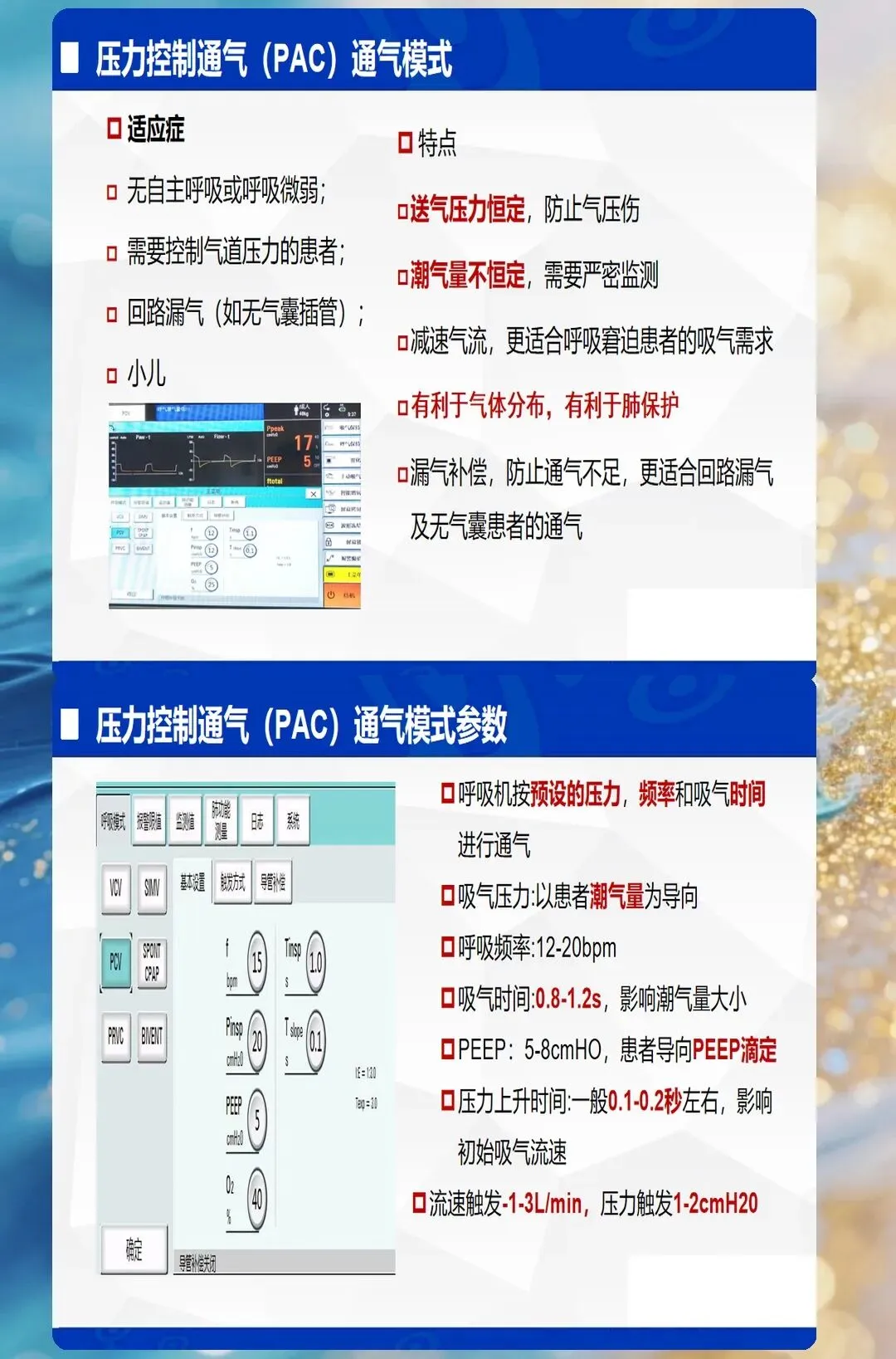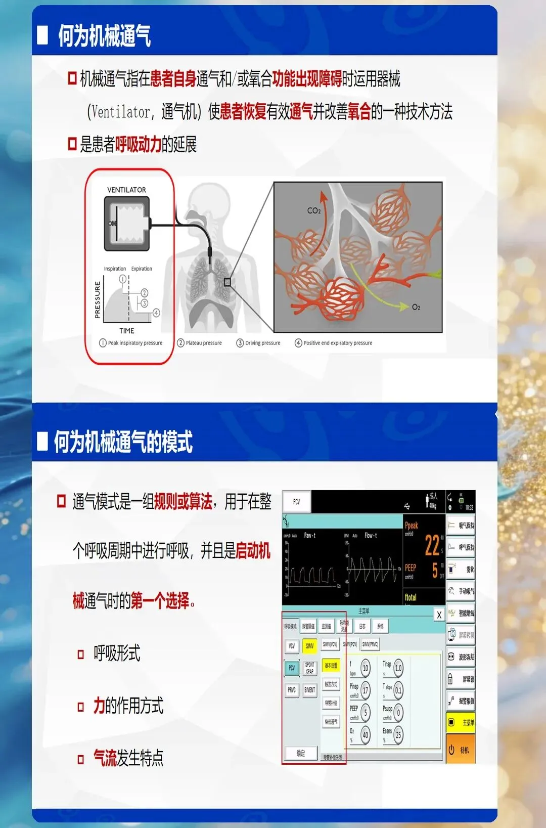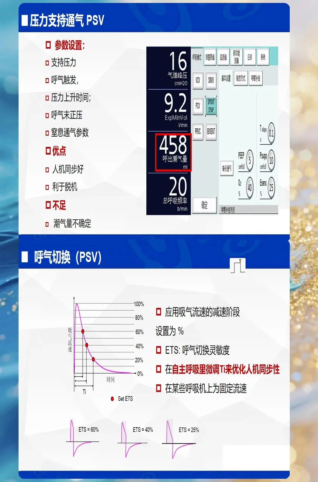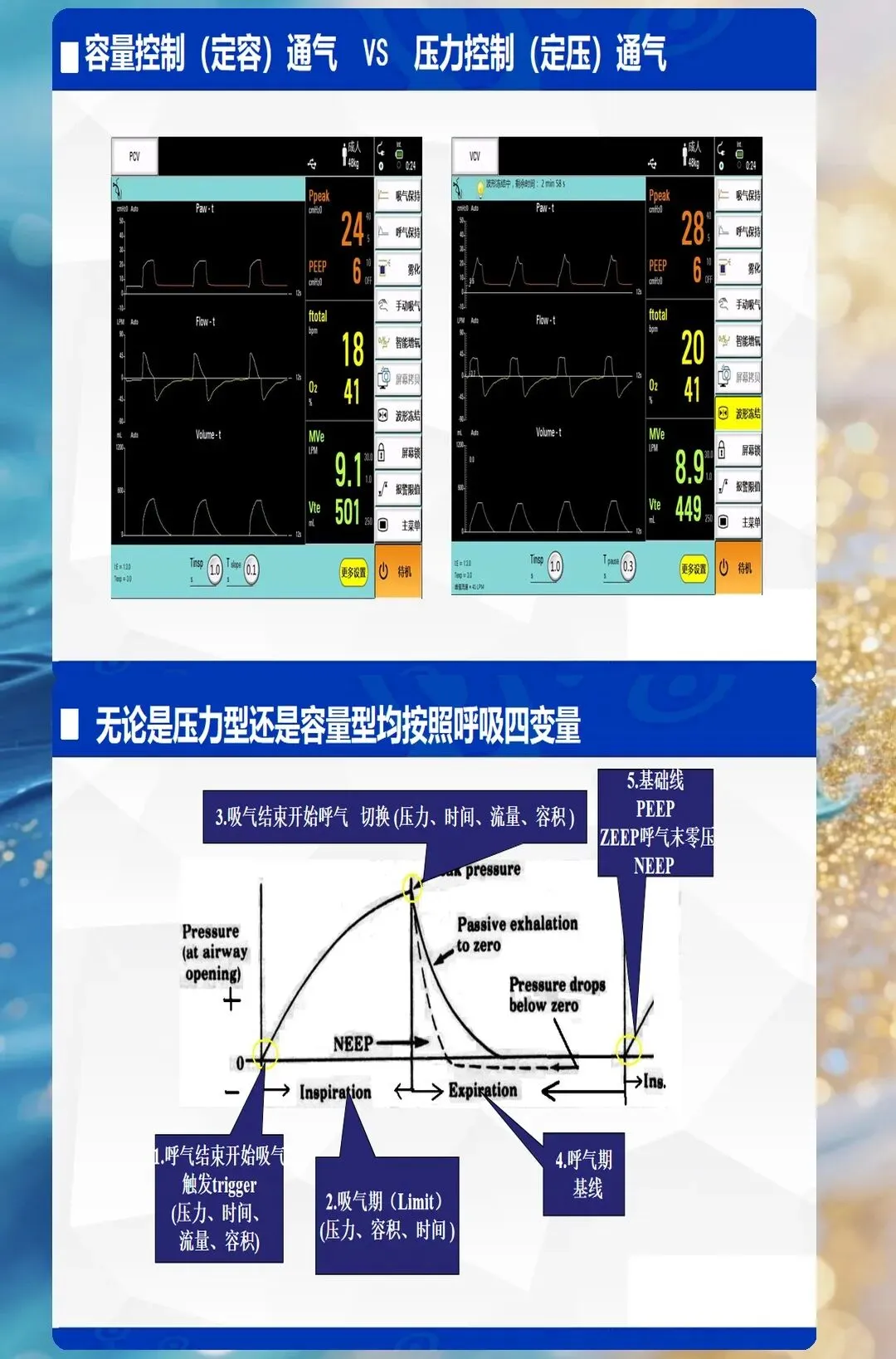 - 临床意义:PEEP过低→肺不张;PEEP过高→气压伤、循环抑制