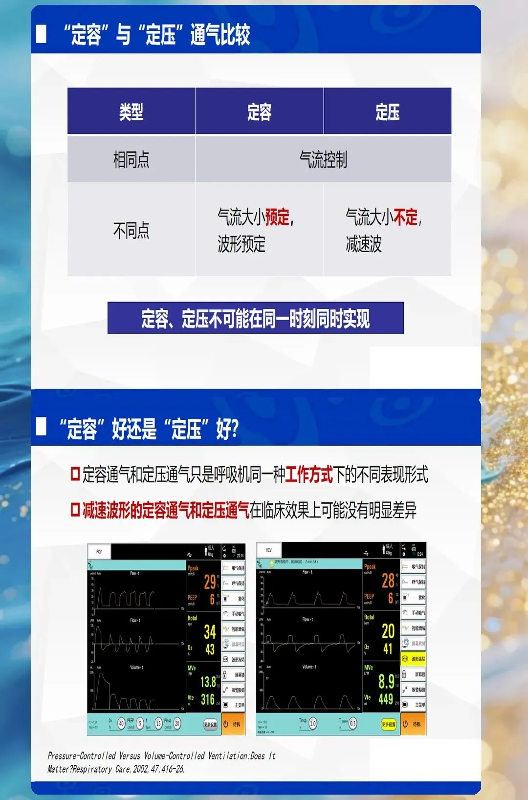 - 调整策略:ARDS患者采用小潮气量(4-6ml/kg);阻塞性肺疾病适当增加潮气量