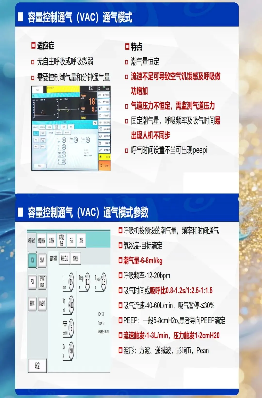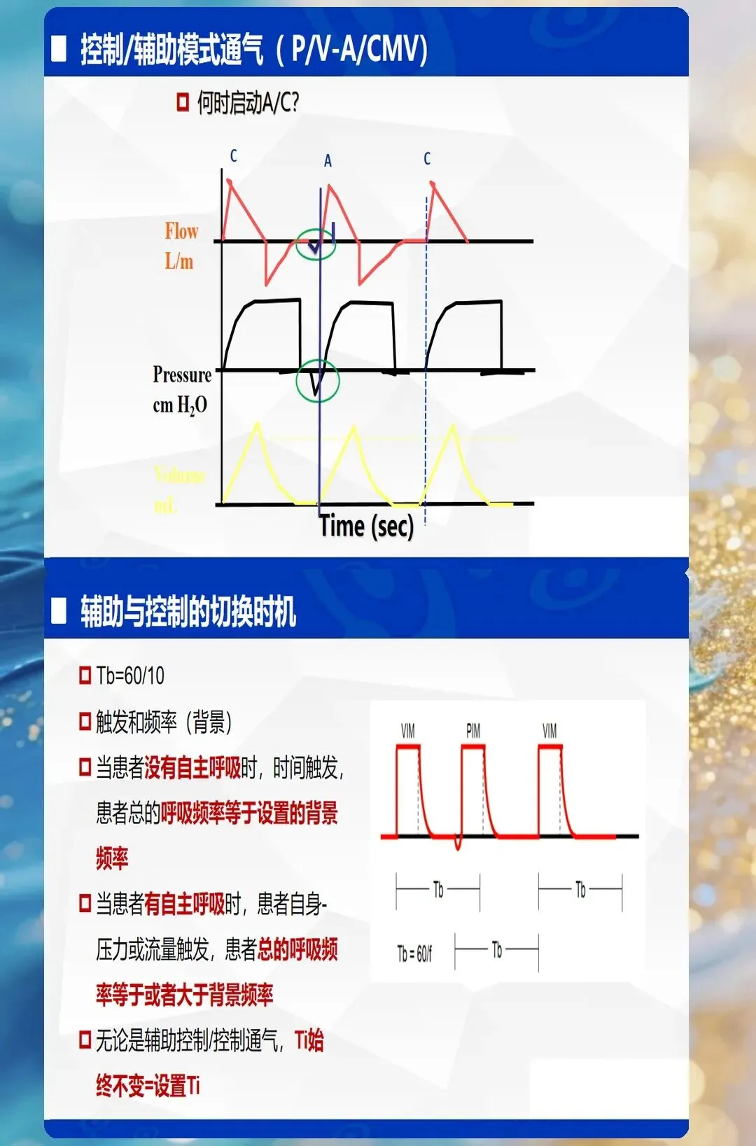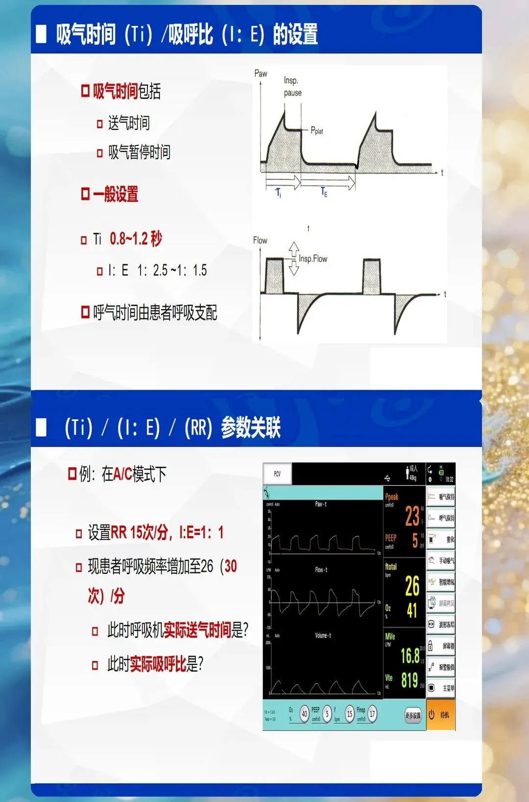 - 临床意义:RR过快→呼吸机对抗、人机不同步;RR过慢→每分钟通气量不足