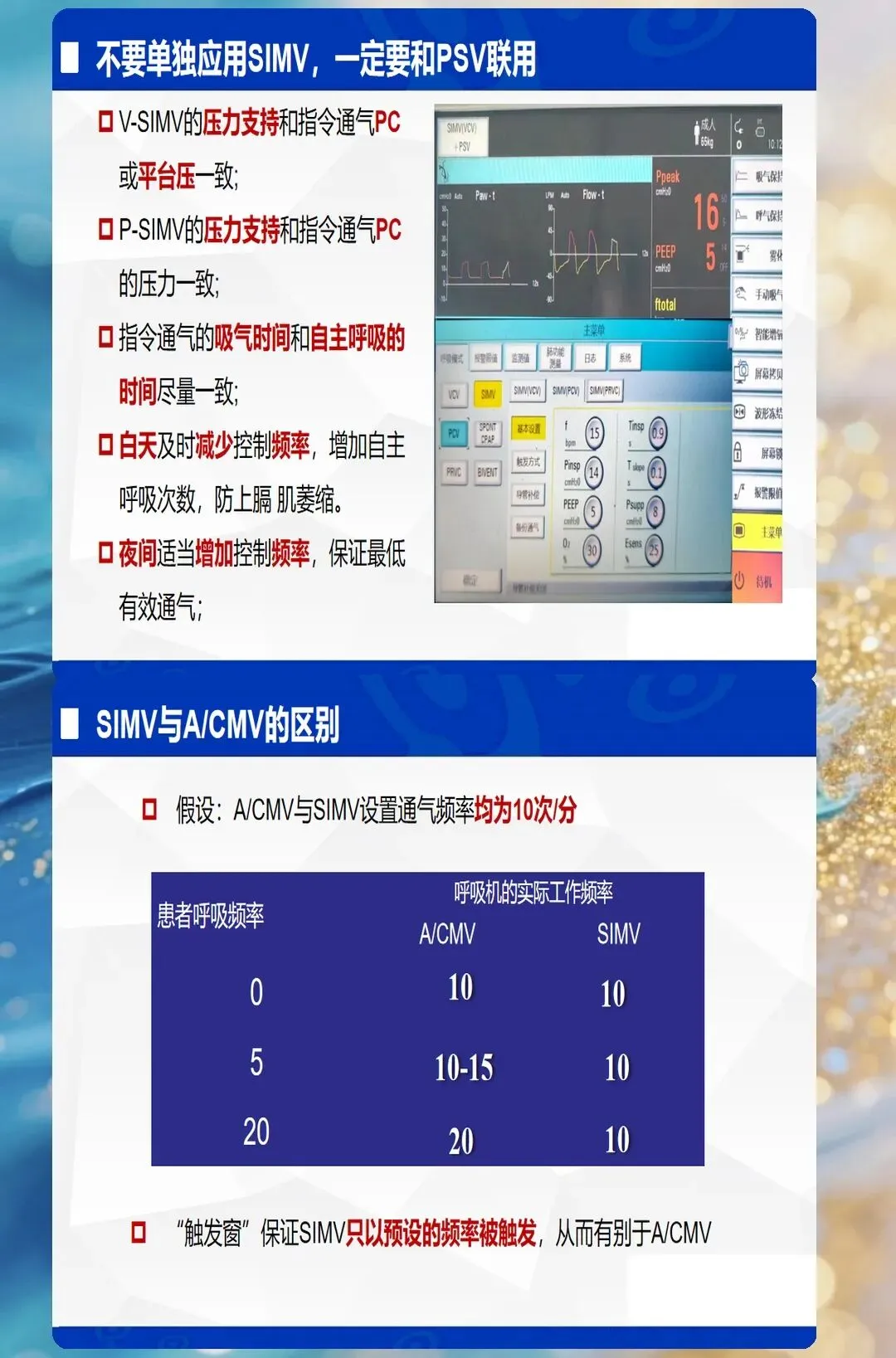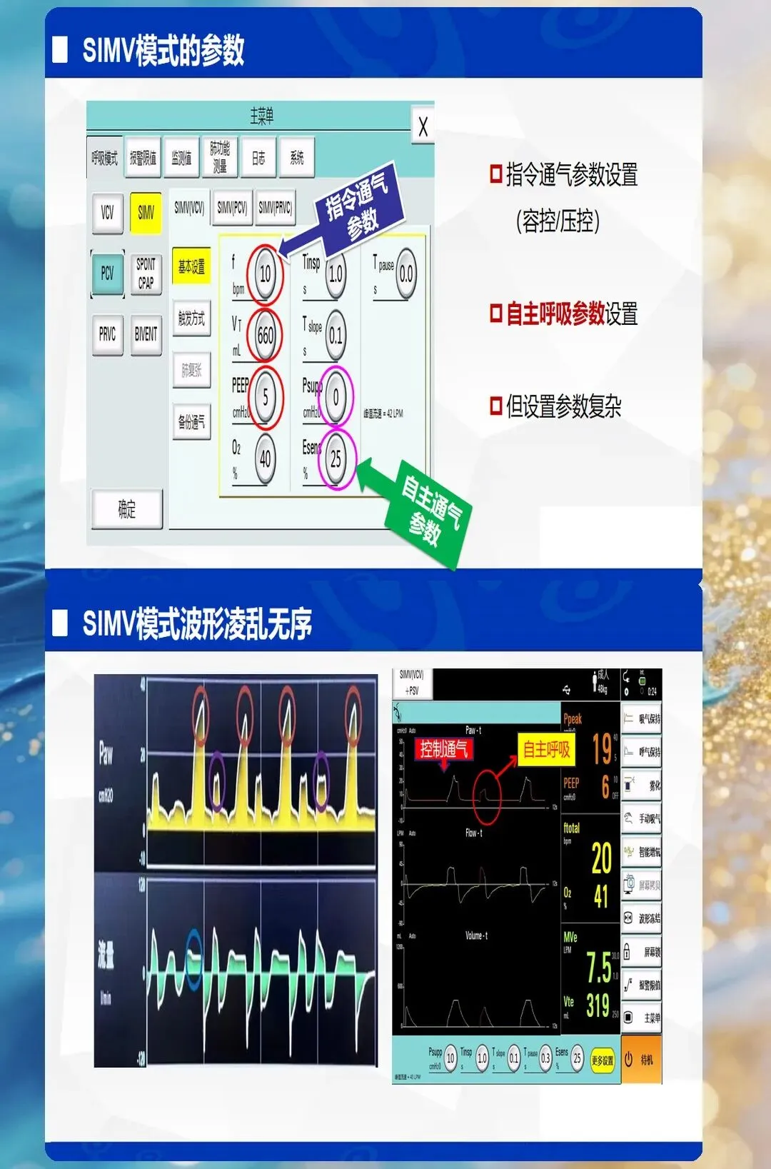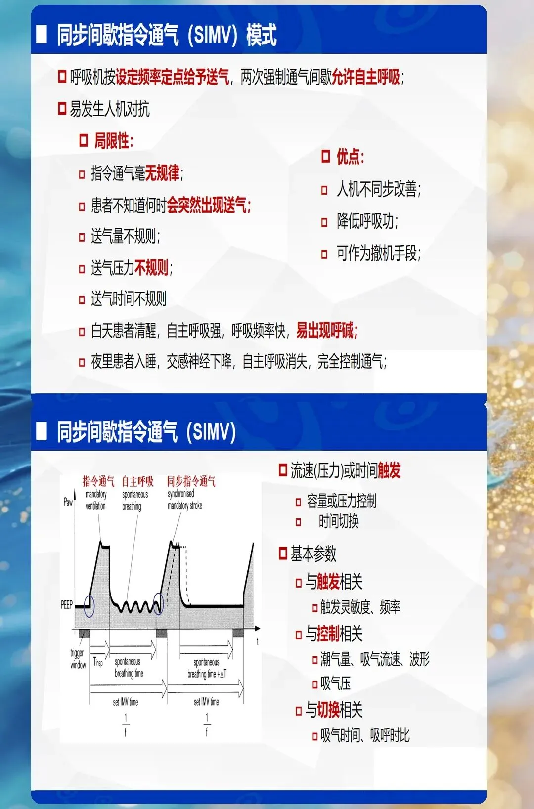 - SIMV(同步间歇指令通气):容控/压控+自主呼吸,逐步撤机