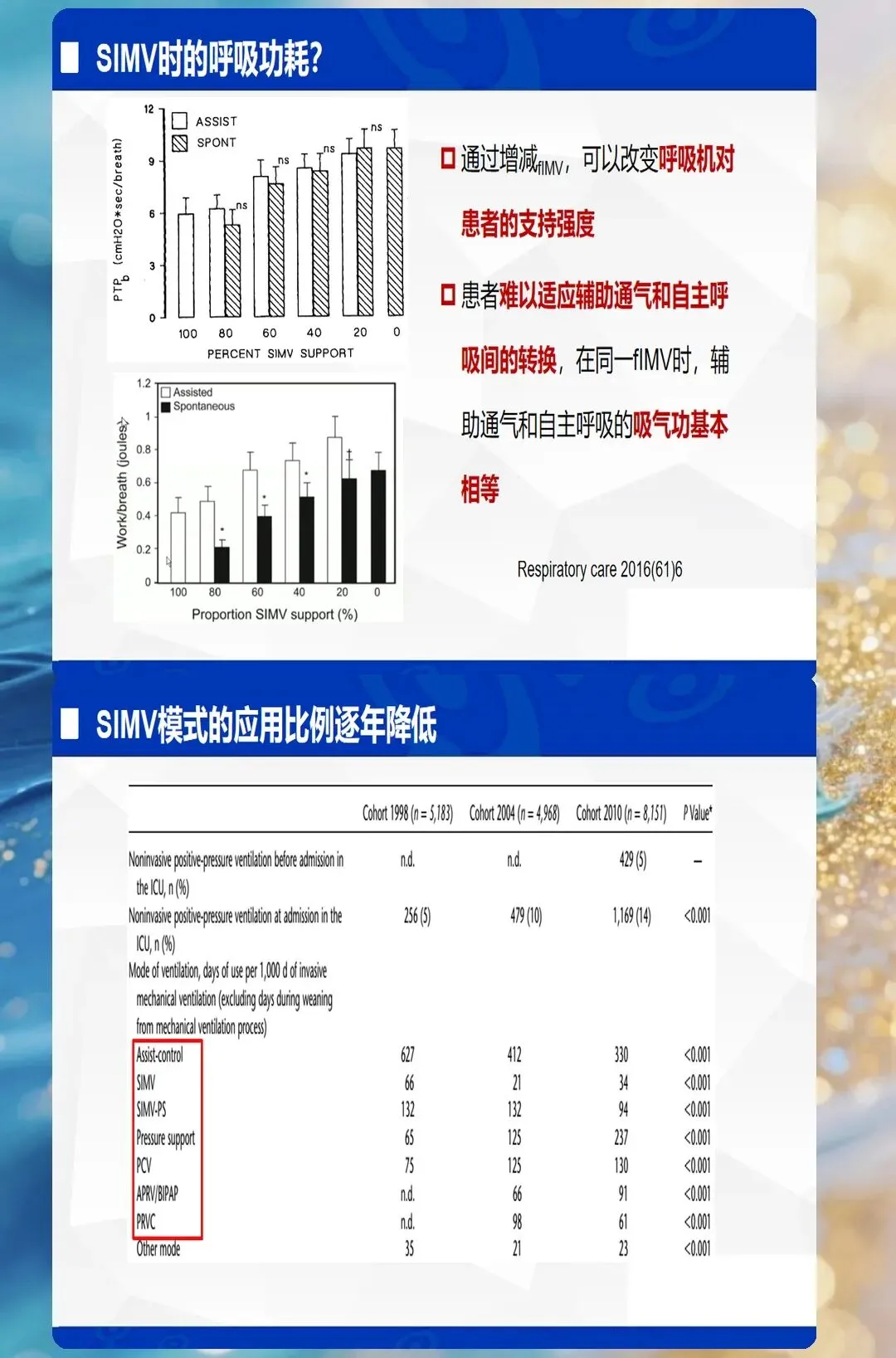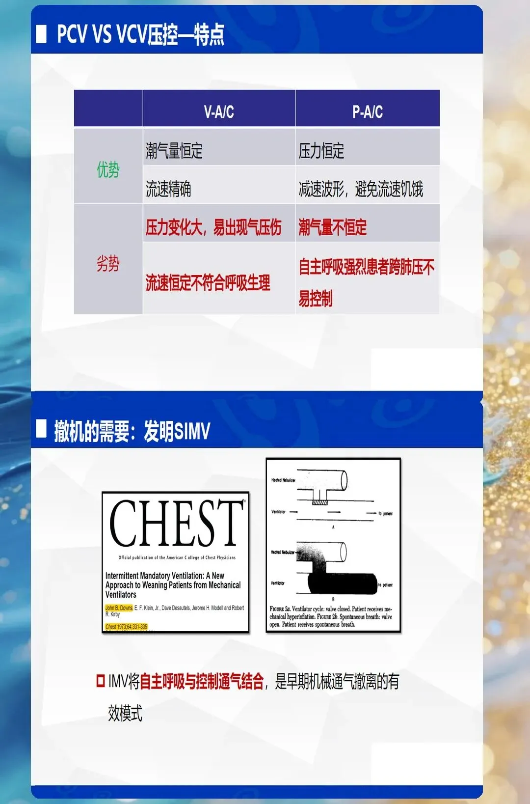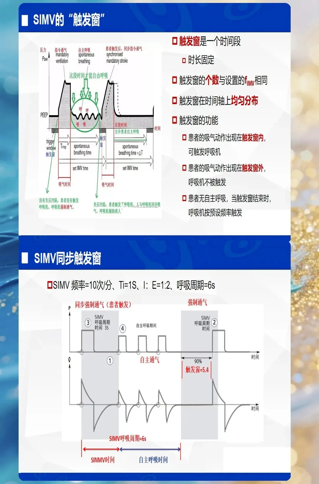 - SIMV(同步间歇指令通气):容控/压控+自主呼吸,逐步撤机